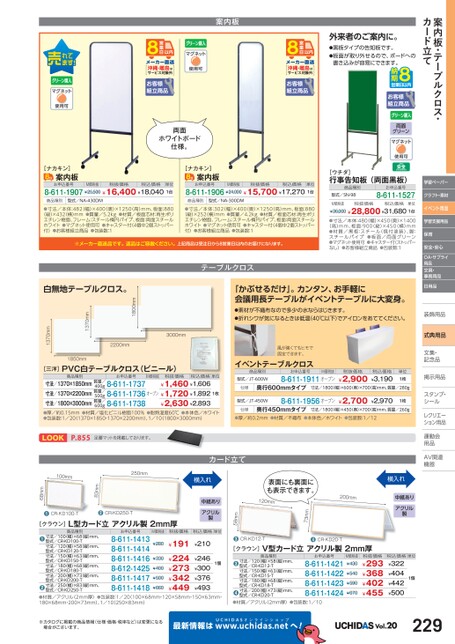 案内板・テーブルクロス・カード立て学習ペーパークラフト・素材イベント用品学習支援用品保育安全・安心OA・サプライ用品文具・事務用品日用品装飾用品飾式典用品文集・文集・記念品記念品掲示用品掲示用品スタンプ・シールルレクリエーレクリエーション用品運動会動用品品AV関連関連機器機器案内板沖縄・離島はサービス対象外お客様組立商品沖縄・離島はサービス対象外お客様組立商品両面ホワイトボード仕様。外来者のご案内に。●黒板タイプの告知板です。●板面が取り外せるので、ボードへの書き込みが容易にできます。お客様組立商品両面グリーン[ナカキン]案内板お申込番号8-611-1907¥25,500¥16,400¥18,0401台M価税抜税抜価格税込価格単位[ナカキン]案内板お申込番号8-611-1906¥24,000¥15,700¥17,2701台M価税抜税抜価格税込価格単位商品種別型式/NA-430DM商品種別型式/NA-300DM●寸法/本体:482(幅)×400(奥)×1250(高)mm、板面:880(縦)×432(横)mm●質量/5.2kg●材質/板面芯材:再生ポリエチレン樹脂、フレーム:スチール楕円パイプ、板面:両面スチールホワイト●マグネット使用可●キャスター付(4個中2個ストッパー付)●お客様組立商品●包装数:1●寸法/本体:302(幅)×400(奥)×1250(高)mm、板面:880(縦)×252(横)mm●質量/4.2kg●材質/板面芯材:再生ポリエチレン樹脂、フレーム:スチール楕円パイプ、板面:両面スチールホワイト●マグネット使用可●キャスター付(4個中2個ストッパー付)●お客様組立商品●包装数:1※メーカー直送品です。返品はご容赦ください。上記商品は受注日から8営業日以内のお届けになります。[ウチダ]行事告知板(両面黒板)商品種別型式/SN-98お申込番号8-611-1527M価税抜税抜価格税込価格単位¥36,000¥28,800¥31,6801台●寸法/本体:480幅)×450(奥)×1400(高)mm、板面:900(縦)×450(横)mm●材質/黒板:スチール(焼付塗装)、脚:スチールパイプ●板面/両面グリーン●マグネット使用可●キャスター付(ストッパーなし)●お客様組立商品●包装数:1テーブルクロス「かぶせるだけ」。カンタン、お手軽に会議用長テーブルがイベントテーブルに大変身。●素材が不織布なので多少の水ならはじきます。●折れシワが気になるときは低温(40℃以下)でアイロンをあててください。風が強くてもヒモで固定できます。3000mm2200mm1800mm1370mm1850mm1370mm白無地テーブルクロス。[三洋]PVC白テーブルクロス(ビニール)商品種別お申込番号M価税抜税抜価格税込価格単位寸法/1370×1850mm質量/寸法/1370×2200mm質量/寸法/1800×3000mm質量/●厚/約0.15mm●材質/塩化ビニル樹脂100%●耐熱温度60℃●本体色/ホワイト●包装数:1/20(1370×1850・1370×2200mm)、1/10(1800×3000mm)400g8-611-1737500g8-611-1736600g8-611-1738¥1,460¥1,606¥1,720¥1,892¥2,630¥2,893オープン1枚イベントテーブルクロス商品種別型式/JT-600Wお申込番号M価税抜8-611-1911オープン税抜価格¥2,900税込価格¥3,190単位1枚仕様奥行600mmタイプ寸法/1800(幅)×600(奥)×700高)mm、質量/280g型式/JT-450W8-611-1956オープン¥2,700¥2,9701枚仕様奥行450mmタイプ寸法/1800(幅)×450(奥)×700高)mm、質量/260g●厚/約0.2mm●材質/不織布●本体色/ホワイト●包装数:1/12横入れ中紙ありアクリル製税込価格単位¥322¥404¥442¥5001個お申込番号8-611-14218-611-14228-611-14238-611-1424M価税抜¥430¥540¥590¥670税抜価格¥293¥368¥402¥455商品種別寸法/120幅)×58(縦)mm、型式/CR-KD12-T寸法/150幅)×63(縦)mm、型式/CR-KD15-T寸法/180幅)×68(縦)mm、型式/CR-KD18-T寸法/200幅)×73(縦)mm、型式/CR-KD20-T●●●●●CR-KD12-T●CR-KD20-T[クラウン]V型カード立アクリル製2mm厚●材質/アクリル(2mm厚)●包装数:1/10表面にも裏面にも表示できます。120mm200mm73mmカード立て58mm横入れ中紙ありアクリル製税込価格単位お申込番号8-611-14138-611-14148-611-14168-612-14258-611-14178-611-1418M価税抜税抜価格¥280¥330¥400¥500¥660¥191¥224¥273¥342¥449¥210¥246¥300¥376¥4931個商品種別寸法/100(幅)×68(縦)mm、型式/CR-KD100-T寸法/120(幅)×58(縦)mm、型式/CR-KD120-T寸法/150(幅)×63(縦)mm、型式/CR-KD150-T寸法/180(幅)×68(縦)mm、型式/CR-KD180-T寸法/200(幅)×73(縦)mm、型式/CR-KD200-T寸法/250(幅)×83(縦)mm、型式/CR-KD250-T●●●●●❷●材質/アクリル(2mm厚)●包装数:1/20(100×68mm・120×58mm・150×63mm・180×68mm・200×73mm)、1/10(250×83mm)LOOKP.855足腰マットを掲載しております。100mm250mm●CR-KD100-T●CR-KD250-T83mm68mm[クラウン]L型カード立アクリル製2mm厚※カタログに掲載の商品情報(仕様・価格・税率など)は変更になる場合がございます。最新情報はUCHIDASww.uchidas.netwへ!Vol.20229