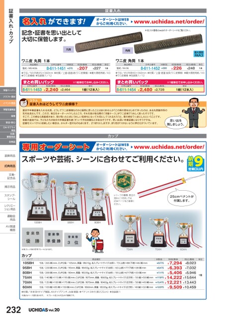 名入れができます!記念・証書を思い出として大切に保管します。証書入れオーダーシートはWEBからご利用ください。www.uchidas.net/order/※名入れ価格はwebのオーダーシートをご覧ください。丸筒角筒ワニ皮丸筒1本商品種別型式/M5-M36お申込番号8-611-1451M価税抜¥270税抜価格¥207税込価格¥227単位1本ワニ皮角筒1本商品種別型式/K4-36お申込番号8-611-1452最大規格用紙A3M価税抜¥300税抜価格¥226税込価格¥248単位1本●寸法/50内径45)×360mm●材質/上面・底面:紙(ワニ皮模様)●最大規格用紙/A3●ワニ皮模様●包装数:1/12●寸法/45(内径40)×360mm●材質/上面・底面:金具(ワニ皮模様)●最大規格用紙/A3●ワニ皮模様●包装数:1/12まとめ買いパック8-611-1453お申込番号¥2,240税抜価格※1組単位申込。税込価格¥2,464単位1組(12本入)証書入れはどうしてワニ皮模様?まとめ買いパック8-611-1454お申込番号¥2,480税抜価格※1組単位申込。税込価格¥2,728単位1組(12本入)賞状や卒業証書を入れる丸筒。どうしてワニ皮模様なのかと疑問に思ったことはありませんか?この柄の筒をはじめて作ったのは、ある丸筒製作所の先代社長さんです。この方、背広をオーダーメイドしたところ、それを受け取る際の「洋服ケース」がワニ皮柄でうれしく思ったそうです。そこで、この柄なら高級感があり、受け取ったときにうれしい気持ちになって大切にしてくれるだろうと、筒の柄をワニ皮にしたということです。和紙の産地では、子どもたちが自分の卒業証書を漉(す)いて作る体験などがあるそうです。思い出深い卒業証書になりそうですね。証書をコンパクトに収納したい場合は、ホルダー型のものもあります。2つ折りにしますが、折り目がつかないように押さえがついています。思い出を残しましょう。カップ専用オーダーシートスポーツや芸術、シーンに合わせてご利用ください。オーダーシートはWEBからご利用ください。www.uchidas.net/order/レリーフの種類・発注の流れにつきましては234ページをご参照ください。25cmペナントが付属します。105BH95BH80BH※角ゴシック体の印字プレートとなります。75AN70AN60AN証書入れ・カップ学習ペーパークラフト・素材イベント用品学習支援用品保育安全・安心OA・サプライ用品文具・事務用品日用品装飾用品装飾用式典用品式典用品文集・文集・記念品記念品掲示用品掲示用品スタンプ・シールシールレクリエーレクリエーション用品運動会運動会用品用品AV関連AV関連機器機器カップタイプ商品種別寸法/265(高)mm、CUP口径/105mm、質量/約610g、名入プレートサイズ(台形)/73(上底)×88(下底)×46(高)mm寸法/230(高)mm、CUP口径/95mm、質量/約455g、名入プレートサイズ(台形)/65(上底)×77(下底)×38高)mm寸法/200(高)mm、CUP口径/80mm、質量/約335g、名入プレートサイズ(台形)/55(上底)×67(下底)×33高)mm105BH95BH80BH75AN70AN60AN●材質/本体:BHタイプ樹脂、ANタイプアンチ、台座:樹脂●ペナント3本付(長さ25cm)●包装数:1※高さはベース部を含みます。※プレート名入れ代込みの価格です。寸法/140(幅)×115(奥)×195(高)mm、CUP口径/約75mm、質量/約605g、名入プレートサイズ(正方形)/55縦)×50(横)mm寸法/125(幅)×100(奥)×175(高)mm、CUP口径/約70mm、質量/約465g、名入プレートサイズ(正方形)/50縦)×45(横)mm寸法/105(幅)×85(奥)×150高)mm、CUP口径/約60mm、質量/約335g、名入プレートサイズ(正方形)/40(縦)×32横)mm¥7,175¥8,475税抜価格M価税抜¥9,775¥7,294¥6,393¥5,406税込価格¥8,023¥7,032¥5,946¥17,975¥14,222¥15,644¥15,475¥12,221¥13,443¥9,509¥10,459¥12,075単位1個232Vol.20