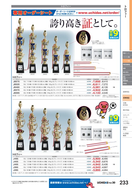 トロフィートロフィー専用オーダーシートオーダーシートはWEBからご利用ください。www.uchidas.net/order/誇り高き証として。※レリーフの種類、発注の流れにつきましては234ページをご参照ください。※角ゴシック体の印刷プレートとなります。JB520JB465JB375JB305長さ:25cm長さ:30cm長さ:50cm※ペナントは高さに応じて3タイプございます。JB575トロフィータイプ商品種別寸法/105(幅)×105(奥)×553(高)mm、質量/500g、名入プレートサイズ/44(幅)×40高)mm寸法/110(幅)×110(奥)×602(高)mm、質量/585g、名入プレートサイズ/55(幅)×50高)mmJB575JB520JB465JB375JB305●材質/人形:アンチ、本体・台座:樹脂●ペナント3本付(長さ50cmはJB575、JB520に付属、30cmはJB465、JB375に付属、25cmはJB305に付属)●包装数:1※高さはベース部を含みます。寸法/85幅)×75(奥)×490(高)mm、質量/445g、名入プレートサイズ/44(幅)×40高)mm寸法/85幅)×75(奥)×420(高)mm、質量/405g、名入プレートサイズ/44(幅)×40高)mm寸法/85幅)×75(奥)×353(高)mm、質量/365g、名入プレートサイズ/44(幅)×40高)mm¥7,650¥6,611¥5,581¥4,942¥4,133¥8,490¥7,140¥6,340¥5,3251個税込価格¥8,415¥7,272¥6,139¥5,436¥4,546税抜価格M価税抜¥9,790単位※プレート名入れ代込みの価格です。※レリーフの種類、発注の流れにつきましては234ページをご参照ください。※角ゴシック体の印刷プレートとなります。長さ:25cm長さ:30cm※ペナントは高さに応じて2タイプございます。トロフィータイプ商品種別J495J455J405J365J285寸法/120(幅)×90奥)×538(高)mm、質量/500g、名入プレートサイズ/55幅)×50(高)mm寸法/120(幅)×75奥)×496(高)mm、質量/445g、名入プレートサイズ/44幅)×40(高)mmJ495J455J405J365J285●材質/人形:アンチ、本体・台座:樹脂●ペナント3本付(長さ30cmはJ495、J455、J405、J365に付属、長さ25cmはJ285に付属)●包装数:1寸法/120(幅)×75奥)×457(高)mm、質量/435g、名入プレートサイズ/44幅)×40(高)mm寸法/120(幅)×75奥)×412(高)mm、質量/400g、名入プレートサイズ/44幅)×40(高)mm寸法/80幅)×75(奥)×342(高)mm、質量/345g、名入プレートサイズ/44(幅)×40高)mm¥6,840¥6,340¥5,840¥5,025M価税抜¥7,540税抜価格¥5,900¥5,342¥4,942¥4,543¥3,895単位1個税込価格¥6,490¥5,876¥5,436¥4,997¥4,284※高さはベース部を含みます。※プレート名入れ代込みの価格です。学習ペーパークラフト・素材イベント用品学習支援用品保育安全・安心OA・サプライ用品文具・事務用品日用品装飾用品飾式典用品文集・文集・記念品記念品掲示用品掲示用品スタンプ・シールルレクリエーレクリエーション用品運動会動用品品AV関連関連機器機器※カタログに掲載の商品情報(仕様・価格・税率など)は変更になる場合がございます。最新情報はUCHIDASww.uchidas.netwへ!Vol.20233