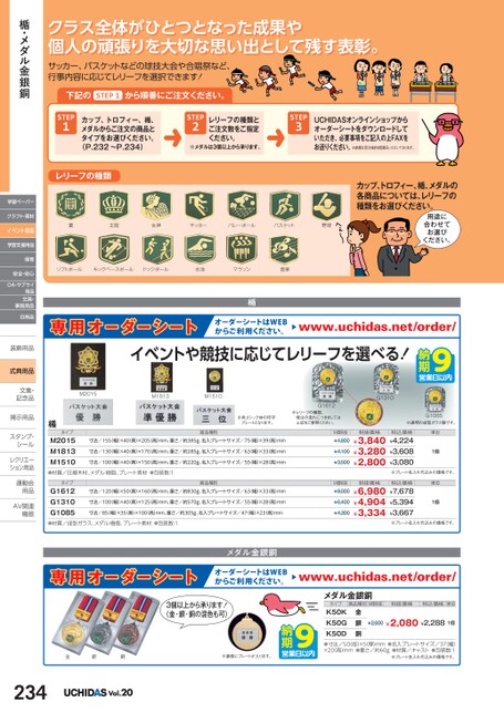 STEP1カップ、トロフィー、楯、メダルからご注文の商品とタイプをお選びください。(P.232〜P.234)STEP2レリーフの種類とご注文数をご指定ください。※メダルは3個以上から承ります。STEP3UCHIDASオンラインショップからオーダーシートをダウンロードしていただき、必要事項をご記入の上FAXをお送りください。※納期は受注後約9営業日いただいております。クラス全体がひとつとなった成果や個人の頑張りを大切な思い出として残す表彰。サッカー、バスケットなどの球技大会や合唱祭など、行事内容に応じてレリーフを選択できます!下記のから順番にご注文ください。STEP1・メダル金銀銅レリーフの種類賞王冠女神サッカーバレーボールバスケット野球ソフトボールキックベースボールドッジボール水泳マラソン音楽カップ、トロフィー、楯、メダルの各商品については、レリーフの種類をお選びください。用途に合わせてお選びください。楯専用オーダーシートオーダーシートはWEBからご利用ください。www.uchidas.net/order/イベントや競技に応じてレリーフを選べる!M2015M1813M1510※角ゴシック体の印字プレートとなります。G1612※レリーフの種類、発注の流れにつきましては上記をご参照ください。G1310G1085※透明の成型ガラス製です。楯タイプタイプ商品種別商品種別M2015M1813M1510●材質/圧縮木材、メダル:樹脂、プレート素材●包装数:1寸法/155(幅)×40奥)×205(高)mm、重さ/約385g、名入プレートサイズ/75幅)×39(高)mm寸法/130(幅)×40奥)×170(高)mm、重さ/約285g、名入プレートサイズ/63幅)×33(高)mm寸法/100(幅)×40奥)×150(高)mm、重さ/約220g、名入プレートサイズ/55幅)×28(高)mmG1612G1310G1085●材質/成型ガラス、メダル:樹脂、プレート素材●包装数:1寸法/120(幅)×50奥)×160(高)mm、重さ/約830g、名入プレートサイズ/63幅)×33(高)mm寸法/100(幅)×40奥)×125(高)mm、重さ/約570g、名入プレートサイズ/55幅)×28(高)mm寸法/85幅)×35(奥)×100(高)mm、重さ/約305g、名入プレートサイズ/47(幅)×23高)mmM価税抜¥4,800¥4,100¥3,500税抜価格¥3,840¥3,280¥2,800税込価格¥4,224¥3,608¥3,080単位1個※プレート名入れ代込みの価格です。M価税抜¥9,000¥6,400¥4,300税抜価格¥6,980¥4,904¥3,334税込価格¥7,678¥5,394¥3,667単位1個※プレート名入れ代込みの価格です。学習ペーパークラフト・素材イベント用品学習支援用品保育安全・安心OA・サプライ用品文具・事務用品日用品装飾用品装飾用式典用品文集・文集・記念品記念品掲示用品掲示用品スタンプ・シールシールレクリエーレクリエーション用品運動会運動会用品用品AV関連AV関連機器機器専用オーダーシートオーダーシートはWEBからご利用ください。www.uchidas.net/order/メダル金銀銅3個以上から承ります!(金・銀・銅の混色も可)金銀銅※裏側にプレートが入ります。234Vol.20メダル金銀銅タイプ商品種別M価税抜税抜価格税込価格単位金銀銅¥2,600¥2,080¥2,2881個K50KK50GK50D●寸法/50径)×5(厚)mm●名入プレートサイズ/37(幅)×20高)mm●重さ/約60g●材質/キャスト●包装数:1※プレート名入れ代込みの価格です。