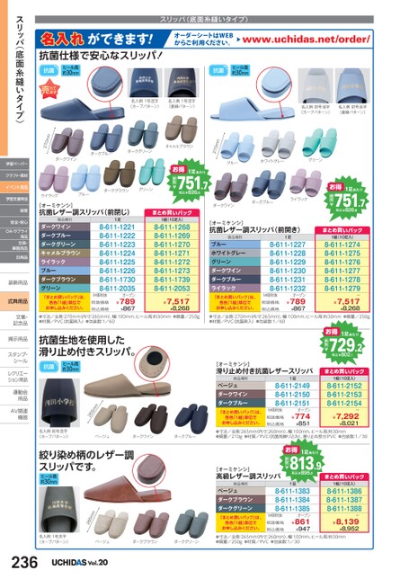 スリッパ(底面糸縫いタイプ)名入れができます!抗菌仕様で安心なスリッパ!抗菌ヒール高約30mmオーダーシートはWEBからご利用ください。www.uchidas.net/order/抗菌ヒール高約30mm名入例1号活字(カーブパターン)名入例1号活字(直線パターン)名入例初号活字(カーブパターン)名入例初号活字(直線パターン)お得1足あたり751.7税込¥826.8税抜¥ダークワインダークブルーライラック[オーミケンシ]抗菌レザー調スリッパ(前開き)商品種別ブルーホワイトグレーグリーンダークワインダークブルーライラック「まとめ買いパック」は、各色「1組」単位でお申し込みください。1足8-611-12278-611-12288-611-12298-611-12308-611-12318-611-1232オープン¥789¥867M価税抜税抜価格税込価格まとめ買いパック1組(10足入)8-611-12748-611-12758-611-12768-611-12778-611-12788-611-1279ー¥7,517¥8,268ブルーホワイトグレーグリーン270mmキャメルブラウンダークブルーダークグリーンダークワイン270mmお得1足あたり751.7税込¥826.8税抜¥ライラックブルーダークブラウングリーン[オーミケンシ]抗菌レザー調スリッパ(前閉じ)商品種別ダークワインダークブルーダークグリーンキャメルブラウンライラックブルーダークブラウングリーン「まとめ買いパック」は、各色「1組」単位でお申し込みください。1足8-611-12218-611-12228-611-12238-611-12248-611-12258-611-12268-611-17308-611-2035オープン¥789¥867M価税抜税抜価格税込価格まとめ買いパック1組(10足入)8-611-12688-611-12698-611-12708-611-12718-611-12728-611-12738-611-17398-611-2053ー¥7,517¥8,268●寸法/全長:270mm(内寸:265mm)、幅:100mm、ヒール高:約30mm●質量/250g●材質/PVC(抗菌剤入)●包装数:1/60●寸法/全長:270mm(内寸:265mm)、幅:100mm、ヒール高:約30mm●質量/250g●材質/PVC(抗菌剤入)●包装数:1/601足あたり729.2税込¥802.1税抜¥お得まとめ買いパック1組(10足入)8-611-21528-611-21538-611-2154ー¥7,292¥8,021[オーミケンシ]滑り止め付き抗菌レザースリッパ商品種別ベージュダークワインダークブルー「まとめ買いパック」は、各色「1組」単位でお申し込みください。1足8-611-21498-611-21508-611-2151オープン¥774¥851M価税抜税抜価格税込価格抗菌生地を使用した滑り止め付きスリッパ。抗菌ヒール高約30mmmm562スリッパ(底面糸縫いタイプ)学習ペーパークラフト・素材イベント用品学習支援用品保育安全・安心OA・サプライ用品文具・事務用品日用品装飾用品装飾用式典用品文集・文集・記念品記念品掲示用品掲示用品スタンプ・シールシールレクリエーレクリエーション用品運動会運動会用品用品AV関連AV関連機器機器名入例初号活字(カーブパターン)ベージュダークワインダークブルー●寸法/全長:265mm(内寸:260mm)、幅:100mm、ヒール高:約30mm●質量/210g●材質/PVC(抗菌剤練り込み)、滑り止め部分:PVC●包装数:1/30まとめ買いパック1組(10足入)8-611-13868-611-13878-611-1388ー¥8,139¥8,952お得1足あたり813.9税込¥895.2税抜¥[オーミケンシ]高級レザー調スリッパ商品種別ベージュダークブラウンダークグリーン「まとめ買いパック」は、各色「1組」単位でお申し込みください。1足8-611-13838-611-13848-611-1385オープン¥861¥947M価税抜税抜価格税込価格絞り染め柄のレザー調スリッパです。ヒール高約30mmmm562名入例1号活字(カーブパターン)ベージュダークブラウンダークグリーン●寸法/全長:265mm(内寸:260mm)、幅:100mm、ヒール高:約30mm●質量/250g●材質/PVC●包装数:1/30236Vol.20