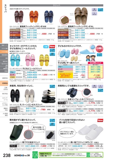 ヒール高約30mmMサイズLサイズキャメルブラウン裏面ダークワインゴールドダークブルースリッパ水回りでも履けるサンダルです。スリッパ[オーミケンシ]商品種別業務用フィッティングサンダルM[オーミケンシ]商品種別業務用フィッティングサンダルLお申込番号M価税抜税抜価格税込価格単位キャメルブラウンダークワインゴールドダークブルー●寸法/全長:255mm(内寸:250mm)、幅:90mm、ヒール高:約30mm●質量/410g●材質/PVC●包装数:1/308-611-12438-611-12448-611-12458-611-1246型式/12800011型式/12800012型式/12800014型式/12800015¥690¥759オープン1足お申込番号M価税抜税抜価格税込価格単位キャメルブラウンダークワインゴールドダークブルー●寸法/全長:265mm(内寸:260mm)、幅:95mm、ヒール高:約30mm●質量/435g●材質/PVC●包装数:1/308-611-12478-611-12488-611-12498-611-1250型式/12800017型式/12800018型式/12800020型式/12800021¥690¥759オープン1足ピンクヒール高約15mmブルー200mmヒール高約10mm全長約200mm抗菌子どもむけのスリッパです。キャラクターがデザインされた子ども用のビニールスリッパ。●抗菌加工を施しています。●濡れ雑巾でさっとお手入れが可能。ブルーピンクイエロー[ニッポンスリッパ]子どもビニールスリッパ商品種別お申込番号M価税抜税抜価格税込価格単位型式/スヌーピーブルーピンクイエロー●寸法/全長:約200mm(内寸:約180mm)、幅:70mm、ヒール高:約10mm●質量/約150g●材質/ポリ塩化ビニル●包装数:1/362316458-604-46342316448-604-46352116338-604-4636¥1,500¥1,050¥1,155ポケットモンスター型式/型式/1足[オーミケンシ]子ども用レザー調スリッパイエロー商品種別ブルーピンクイエロー1足8-611-12188-611-12198-611-1220オープンまとめ買いパック1組(10足入)8-611-12658-611-12668-611-1267ー「まとめ買いパック」は、各色「1組」単位でお申し込みください。¥7,191¥7,910●寸法/全長:200mm(内寸:190mm)、幅:70mm、ヒール高:約15mm●質量/150g●材質/PVC●包装数:1/60¥761¥837M価税抜税抜価格税込価格来客用、先生用のトイレに。ヒール高約30mm来賓用としても最適なスリッパです。MサイズLサイズヒール高約30mm裏面ブラックグレーモノトーンエンゼルスリッパ[オーミケンシ]商品種別お申込番号M価税抜税抜価格税込価格単位型式/70875853型式/70875854グレーブラック●寸法/全長:270mm(内寸:260mm)、幅:100mm、ヒール高:約30mm●質量/250g●材質/甲・中敷き:PVC、底面:EVA●包装数:1/608-611-1728オープン8-611-1729¥780¥8581足靴を脱がずに履けるスリッパ。体育館などのイベント時、靴を脱がずに便利です。靴のまま履いてスリッパで歩ける!裏面[ニッポンスリッパ]靴でそのままスリッパヒール高約15mm全長約355mm使用例商品種別お申込番号M価税抜税抜価格型式/350831ブラック●寸法/全長:約355mm(内寸:約330mm)、幅:約145mm、ヒール高:15mm●質量/400g●材質/表:PVC、底:EVA●包装数:1/108-611-2046¥2,000¥1,600税込価格¥1,760単位1足[オーミケンシ]合皮コンフォートタイプスリッパ商品種別お申込番号M価税抜税抜価格税込価格質量/300g、型式/10800030ブラック、M●寸法/全長:260mm(内寸:250mm)、幅:105mm、ヒール高:約30mm●材質/PU(底面はPVC)●底面/全面滑り止め防止加工●包装数:1/308-611-1233オープン¥1,775¥1,952商品種別お申込番号M価税抜税抜価格税込価格質量/320g、型式/10800029ブラック、L●寸法/全長:275mm(内寸:265mm)、幅:105mm、ヒール高:約30mm●材質/PU(底面はPVC)●底面/全面滑り止め防止加工●包装数:1/308-611-1234オープン¥1,775¥1,952単位1足単位1足パイル生地で足当たりのよい使い捨てスリッパ。ポリプロピレン袋に個装されています。[ニッポンスリッパ]商品種別使い捨てスリッパMサイズ10足入お申込番号M価税抜税抜価格税込価格型式/350751ホワイト●寸法/全長:約270mm(内寸:約260mm)、幅:80mm、ヒール高:約5mm●質量/約20g●材質/ポリエステル●包装数:1/2008-604-4619オープン¥1,680¥1,848(10足入)単位1袋学習ペーパークラフト・素材イベント用品学習支援用品保育安全・安心OA・サプライ用品文具・事務用品日用品装飾用品装飾用式典用品文集・文集・記念品記念品掲示用品掲示用品スタンプ・シールシールレクリエーレクリエーション用品運動会運動会用品用品AV関連AV関連機器機器238Vol.20地球にやさしくお買い物このマークのついた商品は地球環境保護に配慮された商品です。グリーンの文字で商品の判別をしやすくしました。どうぞご利用ください。エコマーク認定品グリーン購入法適合品GPNエコ商品ねっと掲載