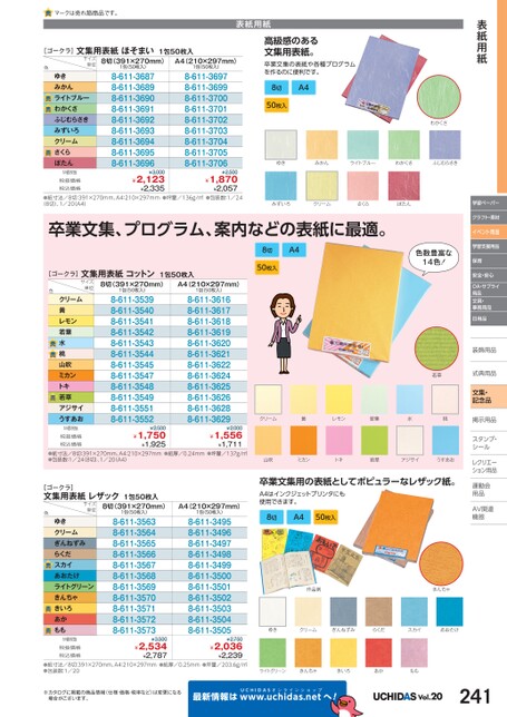 表紙用紙学習ペーパークラフト・素材イベント用品学習支援用品保育安全・安心OA・サプライ用品文具・事務用品日用品装飾用品飾式典用品式典用品文集・記念品掲示用品掲示用品スタンプ・シールルレクリエーレクリエーション用品運動会動用品品AV関連関連機器機器8切A450枚入色数豊富な14色!若草クリーム黄レモン若葉水桃卒業文集用の表紙としてポピュラーなレザック紙。A4はインクジェットプリンタにも使用できます。8切A450枚入作品例きんちゃゆきクリームぎんねずみらくだスカイあおたけライトグリーンきんちゃきいろあかももマークは売れ筋商品です。表紙用紙[ゴークラ]文集用表紙ほそまい1包50枚入サイズ単位8切(391×270mm)A4(210×297mm)色ゆきみかんライトブルーわかくさふじむらさきみずいろクリームさくらぼたんM価税抜税抜価格税込価格1包(50枚入)8-611-36878-611-36898-611-36908-611-36918-611-36928-611-36938-611-36948-611-36958-611-36961包(50枚入)8-611-36978-611-36998-611-37008-611-37018-611-37028-611-37038-611-37048-611-37058-611-3706¥3,000¥2,123¥2,335¥2,500¥1,870¥2,057高級感のある文集用表紙。卒業文集の表紙や各種プログラムを作るのに便利です。8切A450枚入わかくさゆきみかんライトブルーわかくさふじむらさき●紙寸法/8切:391×270mm、A4:210×297mm●坪量/136g/㎡●包装数:1/24(8切)、1/20(A4)みずいろクリームさくらぼたん卒業文集、プログラム、案内などの表紙に最適。¥2,500¥1,750¥1,925¥2,000¥1,556¥1,711●紙寸法/8切:391×270mm、A4:210×297mm●紙厚/0.24mm●坪量/137g/㎡●包装数:1/24(8切)、1/20A4)山吹ミカントキ若草アジサイうすあお[ゴークラ]文集用表紙コットン1包50枚入サイズ単位8切(391×270mm)A4(210×297mm)色1包(50枚入)8-611-35398-611-35408-611-35418-611-35428-611-35438-611-35448-611-35458-611-35478-611-35488-611-35498-611-35518-611-3552クリーム黄レモン若葉水桃山吹ミカントキ若草アジサイうすあおM価税抜税抜価格税込価格ゆきクリームぎんねずみらくだスカイあおたけライトグリーンきんちゃきいろあかももM価税抜1包(50枚入)8-611-35638-611-35648-611-35658-611-35668-611-35678-611-35688-611-35698-611-35708-611-35718-611-35728-611-35731包(50枚入)8-611-36168-611-36178-611-36188-611-36198-611-36208-611-36218-611-36228-611-36248-611-36258-611-36268-611-36288-611-36291包(50枚入)8-611-34958-611-34968-611-34978-611-34988-611-34998-611-35008-611-35018-611-35028-611-35038-611-35048-611-3505[ゴークラ]文集用表紙レザック1包50枚入色サイズ単位8切(391×270mm)A4(210×297mm)¥3,500¥2,750税抜価格税込価格¥2,036¥2,239●紙寸法/8切:391×270mm、A4:210×297mm●紙厚/0.25mm●坪量/203.6g/㎡●包装数:1/20¥2,534¥2,787※カタログに掲載の商品情報(仕様・価格・税率など)は変更になる場合がございます。最新情報はUCHIDASww.uchidas.netwへ!Vol.20241