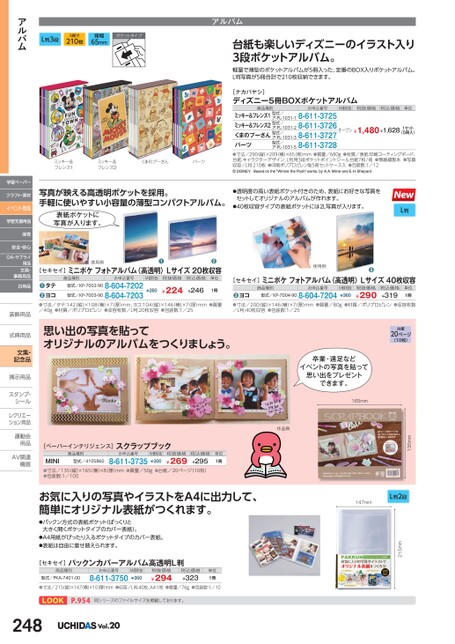 アルバム台紙も楽しいディズニーのイラスト入り3段ポケットアルバム。軽量で薄型のポケットアルバムが5冊入った、定番のBOX入りポケットアルバム。L判写真が5冊合計で210枚収納できます。L判3段5冊で210枚背幅65mmポケットタイプアルバム[ナカバヤシ]ディズニー5冊BOXポケットアルバム商品種別お申込番号M価税抜税抜価格税込価格単位ア-PL-1031-18-611-3725ア-PL-1031-28-611-3726ア-PL-1031-38-611-3727ア-PL-1031-58-611-3728ミッキー&フレンズ1型式/ミッキー&フレンズ2型式/くまのプーさん型式/パーツ●寸法/290(縦)×209(横)×65背)mm●質量/680g●材質/表紙:印刷コーティングボード、台紙:キャラクターデザイン、L判用3段ポケットポイントシール台紙7枚/冊●無線綴製本●写真収容/L判:210枚●印刷ポリプロピレン貼5冊セットケース入●包装数:1/12オープン¥1,480¥1,628(5冊入)1セット型式/●透明度の高い表紙ポケット付きのため、表紙にお好きな写真をセットしてオリジナルのアルバムが作れます。●40枚収容タイプの表紙ポケットには2L写真が入ります。L判使用例●[セキセイ]ミニポケフォトアルバム〈高透明〉Lサイズ40枚収容商品種別お申込番号税抜価格ヨコ型式/KP-7004-908-604-7204●●寸法/200(縦)×146(横)×7(厚)mm●質量/80g●材質/ポリプロピレン●収容枚数/L判:40枚収容●包装数:1/25¥290税込価格¥319単位1冊M価税抜¥360ミッキー&フレンズ1ミッキー&フレンズ2くまのプーさんパーツ写真が映える高透明ポケットを採用。手軽に使いやすい小容量の薄型コンパクトアルバム。表紙ポケットに写真が入ります。使用例●●[セキセイ]ミニポケフォトアルバム〈高透明〉Lサイズ20枚収容商品種別お申込番号M価税抜税抜価格税込価格単位¥280¥224¥2461冊型式/KP-7002-908-604-7202型式/KP-7003-908-604-7203タテヨコ●●●寸法/タテ:142縦)×108(横)×7(厚)mm、ヨコ:104(縦)×146横)×7(厚)mm●質量/40g●材質/ポリプロピレン●収容枚数/L判:20枚収容●包装数:1/25思い出の写真を貼ってオリジナルのアルバムをつくりましょう。台紙20ページ(10枚)学習ペーパークラフト・素材イベント用品学習支援用品保育安全・安心OA・サプライ用品文具・事務用品日用品装飾用品装飾用式典用品式典用品文集・記念品掲示用品掲示用品スタンプ・シールシールレクリエーレクリエーション用品運動会運動会用品用品AV関連AV関連機器機器135mm165mm215mmL判2段147mm卒業・遠足などイベントの写真を貼って思い出をプレゼントできます。[ペーパーインテリジェンス]スクラップブック商品種別お申込番号税抜価格型式/4105860MINI●寸法/135(縦)×165(横)×8(厚)mm●質量/50g●台紙/20ページ(10枚)●包装数:1/1008-611-3735¥269税込価格¥295M価税抜¥300作品例単位1冊お気に入りの写真やイラストをA4に出力して、簡単にオリジナル表紙がつくれます。●パックン方式の表紙ポケット(ぱっくりと大きく開くポケットタイプのカバー表紙)。●A4用紙がぴったり入るポケットタイプのカバー表紙。●表紙は自由に着せ替えられます。[セキセイ]パックンカバーアルバム高透明L判商品種別型式/PKA-7401-00お申込番号8-611-3750M価税抜¥350税抜価格¥294税込価格¥323単位1冊●寸法/215縦)×147(横)×10厚)mm●収容/L判:40枚、A4:1枚●質量/76g●包装数:1/10LOOKP.954同シリーズのファイルサイズを掲載しております。248Vol.20