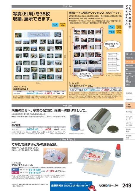 アルバム・卒業記念・てがたすたんぷ学習ペーパークラフト・素材イベント用品学習支援用品保育安全・安心OA・サプライ用品文具・事務用品日用品装飾用品飾式典用品式典用品文集・記念品掲示用品掲示用品スタンプ・シールルレクリエーレクリエーション用品運動会動用品品AV関連関連機器機器910mm[共栄プラスチック]写真展示ホルダー商品種別型式/SH-1お申込番号M価税抜8-611-3722¥2,100税抜価格¥1,879税込価格¥2,066単位1個●寸法/950(縦)×910(横)×0.15(厚)mm●ポケット寸法/135(幅)×95(深)mm●材質/軟質塩化ビニル樹脂●質量/270g●38ポケット●ハトメ穴5カ所●包装数:1[オリオンズ]写真展示ホルダー3枚入商品種別お申込番号M価税抜税抜価格税込価格単位EL判(パノラマ判兼用)8-611-3279¥2,000¥1,633¥1,796(3枚入)●寸法/330(縦)×593(横)mm、3枚連結時:950(縦)×593(横)mm●ポケット寸法/EL判:140(幅)×105深)mm、パノラマ判:280(幅)×105深)mm●材質/ポリオレフィン●1セット8ポケット3枚入●写真収容/EL判:24枚、パノラマ判:12枚●付属品/名札・メモ表示スペース:137(幅)×24(深)mm、名札・メモカード:24枚●包装数:1/51セット未来の自分へ、卒業の記念に、両親への贈り物として。●缶の中に手紙や贈り物を入れて、封緘しましょう。●表面にはイラストを書いた紙などを貼り合わせて、オリジナルの缶を作れます。卒業記念[山櫻]思い出缶商品種別型式/K-1お申込番号M価税抜8-608-2100オープン税抜価格¥400税込価格¥440単位1セット●寸法/68(径)×101(高)mm●質量/54g●材質/本体・底:スチール、プルオープン※封緘には別途金槌が必要です。(天):アルミ●包装数:1〈セット内容〉本体、底、説明書作品例※土の中には埋めないでください。てがたで残す子どもの成長記録。色紙やアルバムなどの紙にはもちろん、布にもくっきり捺せる特殊インキを採用。てがたすたんぷ[シヤチハタ]てがたすたんぷセット商品種別お申込番号M価税抜税抜価格税込価格単位型式/HT-AS-Bブルーピンク●寸法/216(縦)×196(横)×35(高)mm(盤面サイズ:176.8×157mm)●質量/125g●材質/蓋:ポリプロピレン、底:ポリスチレン、吸蔵体:ウレタンフォーム●包装数:1/10〈セット内容〉専用スタンプ台1個、専用インキ1本¥1,480¥1,124¥1,2361セット8-612-42698-612-4270型式/HT-AS-P使用例※カタログに掲載の商品情報(仕様・価格・税率など)は変更になる場合がございます。最新情報はUCHIDASww.uchidas.netwへ!Vol.20249EL判パノラマ判写真収容24枚写真収容12枚1枚EL判8ポケット3枚組。面ファスナーでジョイントできます。3枚連結例ハトメ穴をピンなどで留めて使います。(ハトメ穴10カ所)アルバム1枚1枚1枚950mm写真(EL判)を38枚収納、展示できます。EL判写真収容38枚表面シートに写真がくっつきにくいホルダーです。●学校行事の楽しい思い出、記念、記録の写真が一挙に多数展示、公開掲示できます。●透明度も高く、写真が美しく収納・展示できます。●1枚8ポケットの3枚入りになっており、3枚連結して使ったり、1枚ずつ使ったり、収納の枚数によってホルダー数の増減ができて便利です。
