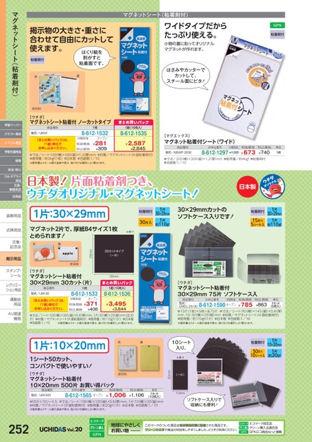 マグネットシート(粘着剤付)ワイドタイプだからたっぷり使える。小物の裏に貼ってオリジナルマグネットが作れます。粘着剤付はさみやカッターでカットして、スチール面にピタ!掲示物の大きさ・重さに合わせて自由にカットして使えます。はくり紙を剥がすと粘着面です。裏粘着剤付表使用例[ウチダ]マグネットシート粘着付ノーカットタイプ商品種別型式/UM-0「まとめ買いパック」は、「1組」単位でお申し込みください。1枚8-612-1532オープンM価税抜税抜価格税込価格¥281¥309まとめ買いパック1組(10枚入)8-612-1535ー¥2,587¥2,845●寸法/シート:100横)×300(縦)×1.2厚)mm●材質/マグネットシート(片面粘着剤付)●耐荷重/約2kgf(1枚)●日本製●包装数:1/10※耐荷重はスチール面の塗装や厚み、貼り付ける場所により異なります。[マグエックス]マグネット粘着付シート(ワイド)商品種別お申込番号型式/MSWF-2030税込価格¥740●寸法/200(横)×300(縦)×1.2(厚)mm●耐荷重/約4kgf●粘着剤付●包装数:1/108-612-1297¥1,000¥673税抜価格M価税抜単位1枚日本製粘着剤付15片×5シート入1片30×29mm1片約110gf30×29mmカットのソフトケース入りです!1片30×29mm1片約110gf1片:30×29mmマグネット2片で、厚紙B4サイズ1枚とめられます!※原寸表裏粘着剤付30片入30カットタイプ(一片)29mm使用例日本製!片面粘着剤つき、ウチダオリジナル・マグネットシート![ウチダ]マグネットシート粘着付30×29mm75片ソフトケース入商品種別型式/UMSC-29/30お申込番号M価税抜8-612-1590オープン税抜価格¥785税込価格¥863単位1セット(5枚入)●15片(1枚)×5枚=全75片●寸法/シート:90(横)×145(縦)×0.8(厚)mm、1片:30(横)×29縦)mm●材質/マグネットシート(片面粘着剤付)●耐荷重/約110gf(1片)●日本製●包装数:1/16※耐荷重はスチール面の塗装や厚み、貼り付ける場所により異なります。1片10×20mm1片約20gf粘着剤付50片×10シート入ソフトケース入りで収納にも便利!10シート入り。※原寸10mm一片(一片)20mm[ウチダ]マグネットシート粘着付30×29mm30カット(片)商品種別型式/UM-30「まとめ買いパック」は、「1組」単位でお申し込みください。1枚8-612-1533オープンM価税抜税抜価格¥371¥408税込価格30mmまとめ買いパック1組(10枚入)8-612-1536ー¥3,495¥3,844●寸法/シート:100(横)×300縦)×0.8(厚)mm、1片:30(横)×29(縦)mm(全30片)●材質/マグネットシート(片面粘着剤付)●耐荷重/約110gf(1片)●日本製●包装数:1/10※耐荷重はスチール面の塗装や厚み、貼り付ける場所により異なります。1片:10×20mm1シート50カット、コンパクトで使いやすい![ウチダ]マグネットシート粘着付10×20mm500片お買い得パック表裏使用例商品種別型式/UM-500お申込番号M価税抜8-612-1565オープン税抜価格¥1,006税込価格¥1,106(10枚入)●50片×10シート入●寸法/シート:100(横)×100(縦)×0.8(厚)mm、1片:10(横)×20(縦)mm●材質/マグネットシート(片面粘着剤付)●耐荷重/約20gf(1片)●日本製●包装数:1/10※耐荷重はスチール面の塗装や厚み、貼り付ける場所により異なります。単位1セットマグネットシート(粘着剤付)学習ペーパークラフト・素材イベント用品学習支援用品保育安全・安心OA・サプライ用品文具・事務用品日用品装飾用品装飾用式典用品式典用品文集・文集・記念品記念品掲示用品スタンプ・シールシールレクリエーレクリエーション用品運動会運動会用品用品AV関連AV関連機器機器252Vol.20地球にやさしくお買い物このマークのついた商品は地球環境保護に配慮された商品です。グリーンの文字で商品の判別をしやすくしました。どうぞご利用ください。エコマーク認定品グリーン購入法適合品GPNエコ商品ねっと掲載