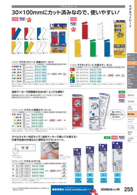 マグネットシート学習ペーパークラフト・素材イベント用品学習支援用品保育安全・安心OA・サプライ用品文具・事務用品日用品装飾用品飾式典用品式典用品文集・文集・記念品記念品掲示用品スタンプ・シールルレクリエーレクリエーション用品運動会動用品品AV関連関連機器機器30×100mmにカット済みなので、使いやすい!マグネットシートツヤなし書き消し不可ツヤなし書き消し不可●赤・青●赤・白●青・白赤白●黄・白●緑・黄●白・白黄緑青[ベロス]マグタッチシート片面カラーカット商品種別お申込番号M価税抜税抜価格税込価格単位型式/MN-3010YE型式/MN-3010RD型式/MN-3010WH赤白黄緑青●寸法/30縦)×100(横)×0.8(厚)mm●質量/9g1枚)●材質/ゴム磁石、PVC●包装数:1/5※書き込みは消せません。8-612-17978-612-17988-612-17998-612-18008-612-1801型式/MN-3010GR型式/MN-3010BL¥382¥420¥6001セット(10枚入)ツヤなし書き消し不可使いやすい両面白タイプもあります。❼赤・白❽白・白¥720¥454¥4991セット(10枚入)[ベロス]マグタッチシート両面カラーカットM価税抜税抜価格税込価格単位お申込番号8-612-18028-612-18038-612-18048-612-18058-612-18068-612-1807●●赤・青●●赤・白●●青・白●●黄・白●●緑・黄●●白・白商品種別型式/MN-3010WRD*BL型式/MN-3010WRD*WH型式/MN-3010WBL*WH型式/MN-3010WYE*WH型式/MN-3010WGR*YE型式/MN-3010WWE*WE●●●●●●●寸法/30(縦)×100横)×1(厚)mm●質量/10g(1枚)●材質/ゴム磁石、PVC●包装数:1/5※書き込みは消せません。油性マーカーで両面書き込みOK!とっても便利!両面色違いのカラー加工で裏も表も油性マーカーで文字・イラストが書け、表裏の表示を分ければスペースを有効に使えます。[マグエックス]マグネット両面カラーシート商品種別M価税抜税抜価格税込価格単位●●●赤・白●●白・青●●黄・白●●緑・黄●●白・白型式/MSR-10RW型式/MSR-10BW型式/MSR-10YW型式/MSR-10GY型式/MSR-10WWお申込番号8-612-10238-612-10248-612-14298-612-10258-612-1027●●寸法/300縦)×100横)×1厚)mm●質量/95g●ツヤなし●入り数/1枚●包装数:1/10※書き込みは消せません。※ホワイトボードマーカーでの書き消しはできません。¥640¥382¥4201枚ラベルライター対応サイズ!油性マーカーで書いても使える!行事予定表の作成などに便利なマグネットシート。ツヤなし書き消し不可角が丸いのでキレイに使えます。使用例ラベルライター対応サイズです。[マグエックス]マグネットラベル商品種別お申込番号M価税抜税抜価格税込価格寸法/60縦)×15(横)×0.6(厚)mm、型式/MNAME-S寸法/72縦)×21(横)×0.6(厚)mm、型式/MNAME-M寸法/85縦)×27(横)×0.6(厚)mm、型式/MNAME-L寸法/102(縦)×38横)×0.6(厚)mm、型式/MNAME-2LSML2L(8枚入)●ラベルライター対応幅/12mm(S)、18mm(M)、24mm(L)、36mm(2L)●材質/PVCマグネットシート●ツヤなし●包装数:1/10※書き込みは消せません。※ラベルライターで直接印字はできません。ラベルライターで作成したテープをお貼りください。8-612-14928-612-14938-612-14948-612-1553¥290¥319(20枚入)(10枚入)(15枚入)¥4301袋1袋1袋単位1袋SML2Lラベルライター対応幅12mm用ラベルライター対応幅18mm用ラベルライター対応幅24mm用ラベルライター対応幅36mm用※カタログに掲載の商品情報(仕様・価格・税率など)は変更になる場合がございます。最新情報はUCHIDASww.uchidas.netwへ!Vol.20255