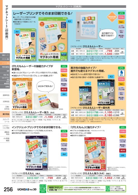 レーザープリンタでそのまま印刷できる!●レーザープリンタ用だから印刷速度が速い!にじまない複合機などで簡単にコピーも●できます!!マグネットシート(印刷用)A3使用例ツヤなし5枚入レーザープリンタ用コピー対応書き消し不可出力後すぐに掲示できます!A4ぴたえもんレーザーの強磁力タイプが新登場。●速く・にじみづらい!レーザープリンタ用のマグネット用紙。●強磁力タイプで小さく切っても、しっかり吸着します!はさみで切れる!ツヤなし5枚入レーザープリンタ用書き消し不可異方性A4使用例[マグエックス]ぴたえもんレーザー強力(A4)商品種別型式/MSPLZ-A4お申込番号8-612-1897M価税抜¥1,550税抜価格税込価格¥1,100¥1,210単位1袋(5枚入)●寸法/297(縦)×210(横)×0.3厚)mm●質量/40g●材質/マグネット、紙●レーザープリンタ用●包装数:1/10インクジェットプリンタでそのまま印刷できる。●アイデア次第でさまざまなシーンでご利用いただけます。●掲示物作成が簡単&スマートにできます。ツヤなし5枚入インクジェットプリンタ用書き消し不可A4※顔料系インクには対応しておりません。耐水ではありません。※書き込みは消せません。[マグエックス]ぴたえもん5枚入商品種別お申込番号8-612-1037M価税抜¥1,100税抜価格¥759型式/MSP-02-A4-1(5枚入)●寸法/297(縦)×210(横)×0.3厚)mm●質量/30g●材質/マグネット、紙●ツヤなし●インクジェットプリンタ用●包装数:1/10税込価格¥834単位1袋[マグエックス]ぴたえもんレーザーM価税抜税抜価格お申込番号商品種別型式/MSPL-A4税込価格8-612-1721¥1,100¥8348-612-1757¥2,200¥1,540¥1,694A4A3●寸法/297(縦)×210横)×0.3厚)mm(A4)、420(縦)×297横)×0.3厚)mm(A3)●質量/35gA4)、60g(A3)●材質/マグネット、紙●ツヤなし●レーザープリンタ用●コピー対応●包装数:1/10¥759※書き込みは消せません。型式/MSPL-A3(5枚入)単位1袋異方性の強磁力タイプ!屋外でも使えるマグネット用紙。●耐水性フィルム使用で屋外で使える!●耐久性が高く教材への使用にも最適です。A3A4ツヤなし3枚入レーザープリンタ用コピー対応書き消し不可[マグエックス]ぴたえもんレーザー屋外用商品種別お申込番号M価税抜税抜価格税込価格単位型式/MSPLO-A3型式/MSPLO-A48-612-1796¥1,550¥1,100¥1,2108-612-1808¥3,100¥2,180¥2,398A4A3●寸法/297(縦)×210横)×0.3厚)mm(A4)、420(縦)×297横)×0.3厚)mm(A3)●質量/43gA4)、88gA3)●材質/マグネット、PET●ツヤなし●レーザープリンタ用●コピー対応●包装数:1/10※書き込みは消せません。(3枚入)1袋「ぴたえもん」に強力タイプ!●マグネットの吸着力約3倍。※ぴたえもんマットタイプ比●小さく切ってもしっかり吸着!●教材作りに最適です。ツヤなし5枚入インクジェットプリンタ用書き消し不可異方性A4※顔料系インクには対応しておりません。耐水ではありません。※書き込みは消せません。[マグエックス]ぴたえもん強力(A4)5枚入商品種別型式/MSPZ-03-A4お申込番号M価税抜8-612-1600¥1,550税抜価格¥1,053税込価格¥1,158(5枚入)●寸法/297(縦)×210(横)×0.3(厚)mm●質量/60g●材質/マグネット、紙●ツヤなし●インクジェットプリンタ用●包装数:1/10単位1袋マグネットシート(印刷用)学習ペーパークラフト・素材イベント用品学習支援用品保育安全・安心OA・サプライ用品文具・事務用品日用品装飾用品装飾用式典用品式典用品文集・文集・記念品記念品掲示用品スタンプ・シールシールレクリエーレクリエーション用品運動会運動会用品用品AV関連AV関連機器機器256Vol.20地球にやさしくお買い物このマークのついた商品は地球環境保護に配慮された商品です。グリーンの文字で商品の判別をしやすくしました。どうぞご利用ください。エコマーク認定品グリーン購入法適合品GPNエコ商品ねっと掲載