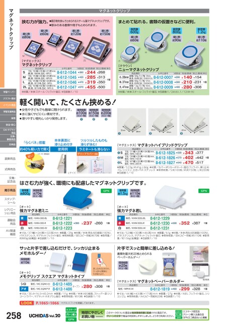 マグネットクリップ挟む力が強力。●掲示物を挟んでとめられるスチール製マグネットクリップです。●厚みのある書類や冊子もとめられます。まとめて貼れる。書類の仮置きなどに便利。綴じ数約60枚綴じ数約120枚綴じ数約150枚綴じ数約80枚MSL2L[マグエックス]マグネットクリップ商品種別お申込番号税抜価格税込価格単位寸法/30幅)×35(高)×21(厚)mm、綴じ数/約60枚、型式/MPS-S寸法/35幅)×40(高)×25(厚)mm、綴じ数/約80枚、型式/MPS-M寸法/45幅)×50(高)×26(厚)mm、綴じ数/約120枚、型式/MPS-L寸法/50幅)×60(高)×29(厚)mm、綴じ数/約150枚、型式/MPS-2LSML2L●材質/本体:スチール・フェライト磁石●包装数:1/108-612-10448-612-10458-612-10468-612-1047M価税抜¥360¥420¥470¥670¥244¥268¥285¥313¥319¥350¥455¥5001個耐荷重600g綴じ数約60枚中耐荷重800g綴じ数約90枚耐荷重1.2kg綴じ数約110枚大小[クラウン]ニューマグネットクリップ商品種別お申込番号税抜価格税込価格単位綴じ数/約60枚、型式/CR-MGS10-SL8-612-0007綴じ数/約90枚、型式/CR-MGM20-SL8-612-0008綴じ数/約110枚、型式/CR-MGL30-SL8-612-0009小、28mm耐荷重/600g、クリップ幅/20mm、中、37mm耐荷重/800g、クリップ幅/27mm、大、47mm耐荷重/1.2kg、クリップ幅/35mm、●材質/本体:スチール・フェライト磁石●包装数:1/24小)、1/12(中・大)¥140¥154¥210¥231¥280¥308¥300¥400M価税抜¥2001個1個商品種別お申込番号SMLM価税抜税抜価格寸法/31(幅)×20(奥)×34高)mm、型式/MHC-100-W寸法/39(幅)×25(奥)×43高)mm、型式/MHC-150-W寸法/47(幅)×32(奥)×53高)mm、型式/MHC-200-W8-612-1825¥500¥3438-612-1826¥570¥4028-612-1827¥640¥470●●●質量/S:23g、M:41g、L:66g●材質/カバー:ポリカーボネート、磁石:フェライト、滑り止め:ゴム・シリコン、土台・バネ:ステンレス●保持枚数/S:約100枚、M:約150枚、L:約200枚●包装数:1/10税込価格単位¥377¥442¥517●[マグエックス]マグネットハイブリッドクリップ●●●Lサイズはさむ力が強く、環境にも配慮したマグネットクリップです。耐荷重約800g保持枚数約70枚(B5コピー用紙)耐荷重約1.5kg保持枚数約110枚(B4コピー用紙)軽く開いて、たくさん挟める!●女性や子どもでも簡単に開けられます。●水に強くサビにくい素材です。●滑りやすい物もしっかり保持します。保持枚数約100枚(A4コピー用紙)保持枚数約150枚(A4コピー用紙)保持枚数約200枚(A4コピー用紙)●●●[オート]強力マグネ君ミニ37mm青[オート]強力マグネ君L商品種別52mm白商品種別お申込番号M価税抜税抜価格税込価格単位型式/KHM-300-R型式/KHM-300-BL青赤白●寸法/37(幅)×24(奥)×32(高)mm●質量/29g●材質/本体:再生ABS樹脂(100%)、バネ:ステンレス、マグネット:フェライト磁石●保持枚数/(B5コピー用紙)約70枚●耐荷重/約800g(金属面)●包装数:1/108-612-12218-612-12228-612-1223型式/KHM-300-W¥237¥260¥3001個お申込番号M価税抜税抜価格税込価格単位型式/KHM-500L-R型式/KHM-500L-BL青赤白●寸法/52(幅)×30(奥)×46(高)mm●質量/61g●材質/本体:再生ABS樹脂(100%)、バネ:ステンレス、マグネット:フェライト磁石●保持枚数/(B4コピー用紙)約110枚●耐荷重/約1.5kg(金属面)●包装数:1/108-612-12298-612-12308-612-1231型式/KHM-500L-W¥352¥387¥5001個サッと片手で差し込むだけで、シッカリ止まるメモホルダー!保持枚数約10枚シロアオ[オート]メモクリップスクエアマグネットタイプ保持枚数約20枚(A4コピー用紙)差し込めば止められ、ひっぱれば簡単に引き取れます。片手でスッと簡単に差し込める!書類を最大約20枚とめられるペーパーホルダー!商品種別お申込番号M価税抜税抜価格税込価格単位型式/MC-SQMシロシロアオ●寸法/30.4×16.5×40.2mm●質量/11g●材質/本体:ABS樹脂、ストッパー部:シリコーンラバー、マグネット:ネオジウム磁石●保持枚数/約10枚●包装数:1/108-612-1485オープン8-612-1486型式/MC-SQMアオ¥280¥3081個[マグエックス]マグネットペーパーホルダー商品種別型式/MPHX-Wお申込番号8-612-1819M価税抜¥460税抜価格¥299使用例税込価格¥328単位1個●寸法/44(幅)×43(奥)×17高)mm●質量/27g●材質/ABS、フェライト磁石、シリコンゴム●保持枚数/A4コピー用紙約20枚●包装数:1/10マグネットクリップ学習ペーパークラフト・素材イベント用品学習支援用品保育安全・安心OA・サプライ用品文具・事務用品日用品装飾用品装飾用式典用品式典用品文集・文集・記念品記念品掲示用品スタンプ・シールシールレクリエーレクリエーション用品運動会運動会用品用品AV関連AV関連機器機器LOOKP.1065・1066マグネットフックを掲載しております。258Vol.20地球にやさしくお買い物このマークのついた商品は地球環境保護に配慮された商品です。グリーンの文字で商品の判別をしやすくしました。どうぞご利用ください。エコマーク認定品グリーン購入法適合品GPNエコ商品ねっと掲載
