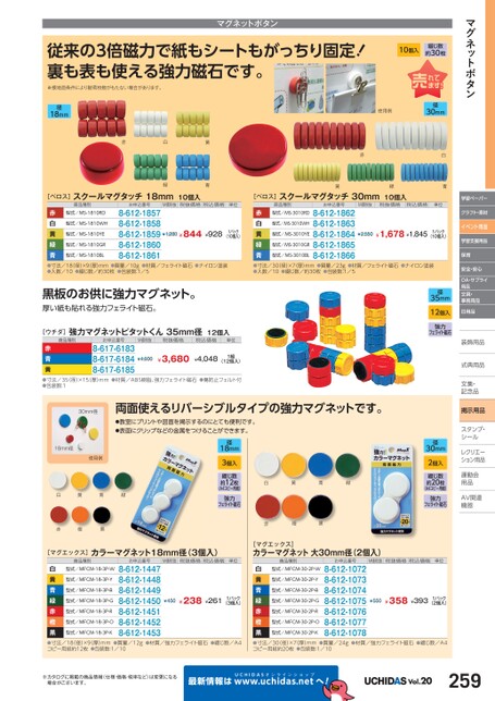 マグネットボタン学習ペーパークラフト・素材イベント用品学習支援用品保育安全・安心OA・サプライ用品文具・事務用品日用品装飾用品飾式典用品式典用品文集・文集・記念品記念品掲示用品スタンプ・シールルレクリエーレクリエーション用品運動会動用品品AV関連関連機器機器白青1パック(10個入)径35mm12個入強力フェライト磁石径30mm2個入綴じ数約20枚(A4コピー用紙)強力フェライト磁石30mm径18mm径使用例白黄青緑赤橙黒両面使えるリバーシブルタイプの強力マグネットです。●教室にプリントや図面を掲示するのにとても便利です。●表面にクリップなどの金属をつけることができます。径18mm3個入綴じ数約12枚(A4コピー用紙)強力フェライト磁石緑白赤黄橙青黒[マグエックス]カラーマグネット18mm径(3個入)商品種別お申込番号M価税抜税抜価格税込価格単位型式/MFCM-18-3P-B型式/MFCM-18-3P-Y型式/MFCM-18-3P-G型式/MFCM-18-3P-W白黄青緑赤橙黒●寸法/18(径)×9厚)mm●質量/12g●材質/強力フェライト磁石●綴じ数/A4コピー用紙約12枚●包装数:1/108-612-14478-612-14488-612-14498-612-14508-612-14518-612-14528-612-1453¥238¥261型式/MFCM-18-3P-O型式/MFCM-18-3P-K型式/MFCM-18-3P-R1パック¥450(3個入)[マグエックス]カラーマグネット大30mm径(2個入)商品種別お申込番号M価税抜税抜価格税込価格単位型式/MFCM-30-2P-B型式/MFCM-30-2P-Y型式/MFCM-30-2P-G型式/MFCM-30-2P-W白黄青緑赤橙黒●寸法/30(径)×7(厚)mm●質量/24g●材質/強力フェライト磁石●綴じ数/A4コピー用紙約20枚●包装数:1/108-612-10728-612-10738-612-10748-612-10758-612-10768-612-10778-612-1078¥358¥393型式/MFCM-30-2P-O型式/MFCM-30-2P-K型式/MFCM-30-2P-R1パック¥550(2個入)※カタログに掲載の商品情報(仕様・価格・税率など)は変更になる場合がございます。最新情報はUCHIDASww.uchidas.netwへ!Vol.20259マグネットボタン従来の3倍磁力で紙もシートもがっちり固定!裏も表も使える強力磁石です。※接地面条件により耐荷枚数がもたない場合があります。10個入綴じ数約30枚径18mm使用例径30mm赤[ベロス]スクールマグタッチ30mm10個入黄緑お申込番号M価税抜税抜価格税込価格単位商品種別型式/MS-3010RD型式/MS-3010WH型式/MS-3010YE赤白黄緑青●寸法/30(径)×7(厚)mm●質量/23g●材質/フェライト磁石●ナイロン塗装●入数/10●綴じ数/約30枚●包装数:1/58-612-18628-612-18638-612-18648-612-18658-612-1866¥1,678¥1,845型式/MS-3010GR型式/MS-3010BL¥2,550赤白緑黄青[ベロス]スクールマグタッチ18mm10個入商品種別お申込番号M価税抜税抜価格税込価格単位型式/MS-1810YE型式/MS-1810RD型式/MS-1810WH赤白黄緑青●寸法/18(径)×9(厚)mm●質量/10g●材質/フェライト磁石●ナイロン塗装●入数/10●綴じ数/約30枚●包装数:1/58-612-18578-612-18588-612-18598-612-18608-612-1861¥1,280¥844¥928型式/MS-1810GR型式/MS-1810BL1パック(10個入)黒板のお供に強力マグネット。厚い紙も貼れる強力フェライト磁石。[ウチダ]強力マグネットピタットくん35mm径12個入商品種別お申込番号M価税抜税抜価格税込価格単位赤青黄●寸法/35(径)×15厚)mm●材質/ABS樹脂、強力フェライト磁石●傷防止フェルト付●包装数:18-617-61838-617-61848-617-6185¥3,680¥4,048¥4,600(12個入)1組