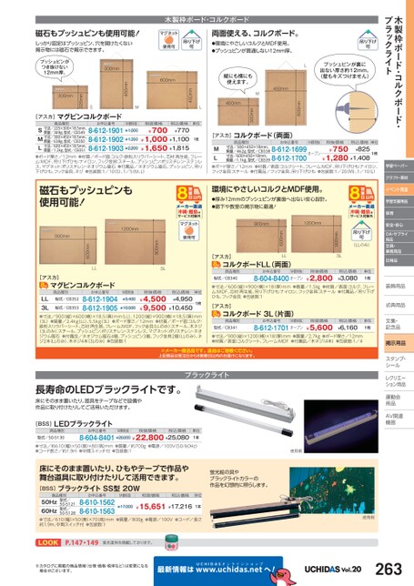 木製枠ボード・コルクボード・ブラックライト学習ペーパークラフト・素材イベント用品学習支援用品安全・安心OA・サプライ用品文具・事務用品日用品装飾用品飾式典用品式典用品文集・文集・記念品記念品掲示用品スタンプ・シールルレクリエーレクリエーション用品運動会動用品品AV関連関連機器機器木製枠ボード・コルクボード両面使える、コルクボード。●環境にやさしいコルクとMDF使用。●プッシュピンが貫通しない12mm厚。Lプッシュピンが裏に出ない厚さ約12mm。(壁もキズつけません)600mm450mmM縦にも横にも使えます。300mm450mm[アスカ]コルクボード(両面)商品種別お申込番号寸法/300×450×18mm、質量/462g、型式/CB3388-612-1699オープン質量/1.1kg、型式/CB3398-612-1700ML●ボード厚さ/12mm●材質/表面:コルクシート、フレーム:MDF、吊り下げひも:ナイロン、フック金具:スチール●付属品/フック金具、吊り下げひも●包装数:1/20M)、1/10(L)税込価格¥825¥1,280¥1,408寸法/600×450×18mm、¥750税抜価格M価税抜単位1枚沖縄・離島はサービス対象外保育(LLのみ)900mm3L900mm1200mm600mm環境にやさしいコルクとMDF使用。●厚み12mmのプッシュピンが裏面へ出ない安心設計。●廊下や教室の掲示物に最適!沖縄・離島はサービス対象外[アスカ]LLコルクボードLL(両面)商品種別型式/CB340お申込番号M価税抜8-604-8400オープン税抜価格¥2,800税込価格¥3,080単位1枚●寸法/600(縦)×900(横)×18厚)mm●質量/1.5㎏●材質/表面:コルク、フレーム:MDF、芯材:再生紙、吊り下げひも:ナイロン、フック金具:スチール●付属品/吊り下げひも、フック金具●包装数:1[アスカ]コルクボード3L(片面)商品種別型式/CB341お申込番号M価税抜8-612-1701オープン税抜価格¥5,600税込価格¥6,160単位1枚●寸法/900(縦)×1200(横)×18(厚)mm●質量/2.7kg●ボード厚さ/12mm●材質/表面:コルクシート、フレーム:MDF●付属品/木ネジ(4本)●包装数:1/4450mm600mm磁石もプッシュピンも使用可能!しっかり固定はプッシュピン、穴を開けたくない掲示物には磁石で掲示できます。プッシュピンがつき抜けない12mm厚。300mmM450mmS225mm300mm[アスカ]マグピンコルクボード商品種別お申込番号M価税抜質量/369g、型式/CB349S寸法/225×300×18.5mm、M寸法/300×450×18.5mm、L質量/638g、型式/CB350寸法/600×450×18.5mm、質量/1.2kg、型式/CB3518-612-1901¥1,0008-612-1902¥1,3508-612-1903¥2,200税抜価格¥700税込価格¥770¥1,000¥1,100¥1,650¥1,815●ボード厚さ/12mm●材質/ボード面:コルク・鉄粉入りラバーシート、芯材:再生紙、フレーム:MDF、吊り下げひも:ナイロン、フック金具:スチール、プッシュピン:ポリスチレン・ステンレス、マグネット:ポリスチレン・ネオジウム磁石●付属品/ネオジウム磁石、プッシュピン、吊り下げひも、フック金具、ネジ●包装数:1/10(S)、1/5(M、L)L単位1枚[アスカ]マグピンコルクボード商品種別税抜価格お申込番号型式/CB353型式/CB352M価税抜¥5,400税込価格¥4,500¥4,950¥9,500¥10,4508-612-19048-612-1905LL3L●寸法/900縦)×600横)×18.5(奥)mm(LL)、1200(縦)×900横)×18.5(奥)mm(3L)●質量/2.4kgLL)、5.5kg(3L)●ボード厚さ/12mm●材質/ボード面:コルク・鉄粉入りラバーシート、芯材:再生紙、フレーム:MDF、フック金具(LLのみ):スチール、木ネジ(3Lのみ)スチール、プッシュピン:ポリスチレン・ステンレス、マグネット:ポリスチレン・ネオジウム磁石●付属品/ネオジウム磁石4個、プッシュピン3個、フック金具2個(LLのみ)、ネジ2本(LLのみ)、木ネジ4本(3Lのみ)●包装数:1¥10,500単位1枚3L900mmLL600mm900mm1200mm磁石もプッシュピンも使用可能!※メーカー直送品です。返品はご容赦ください。上記商品は受注日から8営業日以内のお届けになります。ブラックライト長寿命のLEDブラックライトです。床にそのまま置いたり、器具をテープなどで設備や作品に取り付けたりしてご活用いただけます。[BSS]LEDブラックライト商品種別型式/50-5130お申込番号M価税抜税抜価格8-604-8401¥26,000¥22,800¥25,080税込価格単位1本●寸法/約610(幅)×50(奥)×80(高)mm●質量/約700g●電源/100V(50/60Hz)●コード長さ/約1.9m●中間スイッチ付●包装数:1使用例床にそのまま置いたり、ひもやテープで作品や舞台道具に取り付けたりして活用できます。[BSS]ブラックライトSS型20W商品種別お申込番号M価税抜税抜価格税込価格単位型式/50-5121型式/50-51288-610-15628-610-156350Hz60Hz●寸法/610(幅)×50奥)×70(高)mm●質量/800g●電源/100V●コード/長さ約1.9m、中間スイッチ付●包装数:1¥15,651¥17,216¥17,0001本蛍光絵の具やブラックライトカラーの作品を幻想的に照らします。LOOKP.147・149蛍光塗料を掲載しております。※カタログに掲載の商品情報(仕様・価格・税率など)は変更になる場合がございます。最新情報はUCHIDASww.uchidas.netw使用例へ!Vol.20263