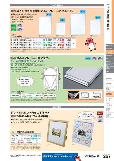 アルミ製額縁・作品展示学習ペーパークラフト・素材イベント用品学習支援用品安全・安心OA・サプライ用品文具・事務用品日用品装飾用品飾式典用品式典用品文集・文集・記念品記念品掲示用品スタンプ・シールルレクリエーレクリエーション用品運動会動用品品AV関連関連機器機器4切用縦・横吊り可表面透明PET保育中身の入れ替えが簡単なアルミフレームパネルです。●パネルはすべて吊りひも付きです。●フィルムは焼却時有毒ガスが発生しない再生PET100%を使用しています。アルミ製額縁A2用A3用B2用B3用●ST-A2-SV型式/ST-A2-SV型式/ST-A3-SV型式/ST-B2-SV型式/ST-B3-SVお申込番号M価税抜8-612-1123¥2,3108-612-1124¥1,8208-612-1126¥2,8608-612-1127¥2,040●ST-A3-SV税抜価格¥1,690¥1,330¥2,090¥1,490●ST-B2-SV●ST-B3-SV単位1枚税込価格¥1,859¥1,463¥2,299¥1,639商品種別420(横)×594(縦)mm、A2297(横)×420(縦)mm、A3515(横)×728(縦)mm、B2364(横)×515(縦)mm、B3●●●●縦・横吊り可表面再生PET[アルテ]エコイレパネ●材質/表面:再生PET、裏面:発泡板、枠:アルミ製(シルバー色)●フレーム幅/11mm●収容可能厚/1mm●縦・横吊り可●付属品/吊りひも●包装数:1高級感あるフレームで楽々展示。フレームが前面に開くフロントオープン式フレームを外側にひねると蝶番のように開き、フレームの4枠どこからでも作品を横から出し入れできます。新設計のコーナー部品コーナー部品はサイズアップして、さらにしっかりとフレームの四隅をホールドします。吊り具の移動で、ひもの位置調整可能。[ソフケン]楽パネ商品種別お申込番号M価税抜税抜価格税込価格単位収容用紙寸法/380×540mm画用紙4切用●寸法/386×546mm●フレーム厚/25mm●フレーム幅/9mm●材質/表面:透明PET0.5mm厚)、裏面:布目エンボス紙貼り化粧段ボール(両面白)、枠:アルミ製●縦・横吊り可●付属品/吊りひも、吊り具(4個:バックスプリング=裏板押え兼用)●包装数:1/108-612-1118¥2,970¥2,600¥2,8601枚裏面吊り金具位置裏面コーナー部品一辺を開けば横から透明板を外せます。作品展示軽い!割れない!ガラス不使用!写真も飾れる色紙サイズの額縁。●前面板は、軽くて割れないPETシート使用。●マットを外せば色紙がそのまま飾れます。台紙(マット)にメッセージが書けます。縦・横吊り可表面透明PET[キング]写真も飾れる色紙額商品種別ナチュラルホワイト型式/SKS-242-NT型式/SKS-242-WHお申込番号8-604-84098-604-8410M価税抜¥2,200税抜価格¥1,880税込価格¥2,068単位1枚●寸法/263(横)×294(縦)mm●フレーム幅14mm●窓寸法/123(横)×85(高)mm●対応用紙/242(横)×272(縦)mmまで●質量/420g●材質/木製、表面:PETシート(0.5mm厚)●付属品/吊りひも、吊り具●包装数:1ナチュラルホワイト※カタログに掲載の商品情報(仕様・価格・税率など)は変更になる場合がございます。最新情報はUCHIDASww.uchidas.netwへ!Vol.20267