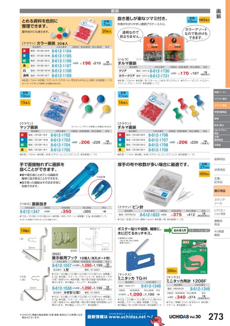 [クラウン]ピン針商品種別型式/CR-PI50-SLお申込番号8-612-1833M価税抜¥550税抜価格¥375税込価格¥412単位1個(約500本入)●寸法/針長:27mm、頭径:1.6mm●材質/鉄●包装数:1/20ポスター貼りや装飾、補修に。木に打てるホッチキス。詰め替え用ステープル(針)※使用針は1208F(No.3-1M、No.3-3Mも使用できます。)画鋲針長10mm約60本入カラーアソートなので色分けもできます。カラークリアとめる資料を色別に整理できます。屋外向けにも使えます。画鋲針長7mm20本入抜き差しが楽なツマミ付き。中身がわかりやすい透明プラケース入り。透明なので目立ちません。[クラウン]カラー画鋲20本入商品種別お申込番号M価税抜税抜価格税込価格単位型式/CR-GB128-R型式/CR-GB128-G型式/CR-GB128-BL赤青緑黄白透明●針長/7mm●材質/ステンレス、スチロール、再生材(40%以上)使用●包装数:1/10※パッケージデザインが変更になる場合があります。8-612-11048-612-11058-612-11068-612-11078-612-11088-612-1109型式/CR-GB128-W型式/CR-GB128-Y型式/CR-GB128-T¥196¥215¥2601箱(20本入)[ハピラ]ダルマ画鋲クリア商品種別お申込番号M価税抜税抜価格税込価格単位型式/S41128-612-1730型式/S41138-612-1731クリアカラークリア●針長/10mm●材質/針:スチール、つまみ:ポリスチレン●カラー/ピンク、イエロー、グリーン、ブルー、クリア●包装数:1/12¥170(約60本入)¥187¥2501箱針長10mm15本入針長11mm16本入[クラウン]マップ画鋲商品種別※パッケージ、デザインが変更になる場合があります。お申込番号M価税抜税抜価格税込価格型式/CR-GB118-R型式/CR-GB118-BL赤青緑黄●針長/10mm●材質/本体:スチロール、ピン:ステンレス●包装数:1/108-612-17028-612-17038-612-17048-612-1705型式/CR-GB118-G型式/CR-GB118-Y¥206¥260¥226単位1箱(15本入)[クラウン]ダルマ画鋲商品種別お申込番号M価税抜税抜価格税込価格型式/CR-GB108-R型式/CR-GB108-B赤青緑黄●針長/11mm●材質/本体:スチロール、ピン:ステンレス●包装数:1/108-612-17068-612-17078-612-17088-612-1709型式/CR-GB108-G型式/CR-GB108-Y¥206¥260¥226手で直接触れずに画鋲を抜くことができます。厚手の布や枚数が多い場合に最適です。●壁や掲示板にとめている画鋲を簡単に抜き取ることができます。●抜き取った画鋲はそのまま本体に収納できます。先端部裏単位1箱(16本入)針長27mm約500本入学習ペーパークラフト・素材イベント用品学習支援用品保育安全・安心OA・サプライ用品文具・事務用品日用品装飾用品飾式典用品式典用品文集・文集・記念品記念品掲示用品スタンプ・シールルレクリエーレクリエーション用品運動会動用品品AV関連関連機器機器●寸法/40(幅)×10(奥)×50(高)×3.5(径)mm●質量/8.3g●材質/スチール、クロームメッキ●有孔ボードの穴径/直径5mm●耐荷重/掲示板の強度・使用環境により異なります。●付属品/ストッパー●包装数:18-612-1558¥1,250¥1,090¥1,1991袋(10個入)商品種別かぎ型(U型)型式/01-6824●寸法/45(幅)×10(奥)×50(高)×3.5(径)mm●質量/8.9g●材質/スチール、クロームメッキ●有孔ボードの穴径/直径5mm●耐荷重/掲示板の強度・使用環境により異なります。●付属品/ストッパー●包装数:1[マックス]ミニタッカTG-H商品種別型式/TG91171お申込番号8-612-1348M価税抜¥1,210税抜価格税込価格¥1,090¥1,199単位1台●寸法/25(幅)×151(奥)×131(高)mm●材質/スチール、樹脂●質量/210g●付属品/針1208F400本)●包装数:1/52000本入[マックス]ミニタッカ用針1208F商品種別型式/MS92639お申込番号8-612-1349M価税抜¥400税抜価格¥340税込価格¥374(2000本入)●寸法/肩幅12mm、針足8mm●材質/スチール●包装数:1/6単位1箱※カタログに掲載の商品情報(仕様・価格・税率など)は変更になる場合がございます。最新情報はUCHIDASww.uchidas.netwへ!Vol.20273[ベロス]画鋲抜きお申込番号8-612-1347M価税抜¥500税抜価格¥350税込価格¥385単位1個●寸法/25(径)×105(高)mm●材質/ABS、スチール●質量/23g●包装数:1/5※とがった先端でケガをしないようご注意ください。有孔ボードフック止めピン使用例[BSS]展示板用フック10個入(有孔ボード用)お申込番号M価税抜税抜価格税込価格8-612-1557¥1,250¥1,090¥1,199単位1袋(10個入)商品種別L型型式/01-682340mm30mm10個入L型mm3540mm33mmかぎ型(U型)25mm