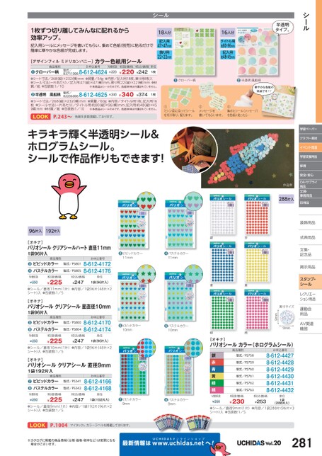 学習ペーパークラフト・素材イベント用品学習支援用品保育安全・安心OA・サプライ用品文具・事務用品日用品装飾用品飾式典用品式典用品文集・文集・記念品記念品掲示用品掲示用品スタンプ・シールレクリエーレクリエーション用品運動会動用品品AV関連関連機器機器作品例288片入実寸サイズ9mm9mmシール半透明タイプ。シール18人分記入用47×47mm飾り用22×22mm16人分タイトル用約80×96mm記入用約48×45mm華やかな色紙の完成です!!めたシール(メッセージ)③集ッセージを②メ書いてもらいます。を色紙に貼ったら…●クローバー柄●半透明風船柄シン目に沿ってシールを切り取り、配ります。①ミ●半透明風船柄型式/822360068-612-4625¥340¥340¥3741枚●シート寸法/268縦)×232横)mm●質量/60g●内容/タイトル用1枚、記入用16枚●シール寸法(一片あたり)/タイトル用:約80(縦)×96(横)mm、記入用:約48(縦)×45※本商品はシールのみです。色紙本体は付属されていません。(横)mm●材質/紙●包装数:1/10LOOKP.243〜色紙を多数掲載しております。キラキラ輝く半透明シール&ホログラムシール。シールで作品作りもできます!96片入192片入1枚ずつ切り離してみんなに配れるから効率アップ。記入用シールにメッセージを書いてもらい、集めて色紙(別売)に貼るだけで簡単に華やかな色紙が完成します。[デザインフィルミドリカンパニー]カラー色紙用シール商品種別お申込番号型式/クローバー柄837110068-612-4624¥220●●シート寸法/268縦)×232横)mm●質量/54g●内容/記入用18枚、飾り用8枚入●シール寸法(一片あたり)/記入用:47(縦)×47(横)mm、飾り用:22縦)×22(横)mm●材質/紙●包装数:1/10※本商品はシールのみです。色紙本体は付属されていません。税抜価格¥220税込価格単位¥2421枚M価税抜[オキナ]パリオシールカラー(ホログラムシール)銀赤青黄緑桃商品種別型式/PS758型式/PS759型式/PS760型式/PS761型式/PS762型式/PS763お申込番号8-612-44278-612-44288-612-44298-612-44308-612-44318-612-4432❸ビビッドカラー11mm❹パステルカラー11mm❺ビビッドカラー10mm❻パステルカラー10mm銀青緑赤黄桃[オキナ]パリオシールクリアシールハート直径11mm1袋96片入お申込番号8-612-41728-612-4176商品種別型式/PS801型式/PS805ビビッドカラーパステルカラー●●M価税抜¥250税抜価格¥225税込価格¥247単位1袋(96片入)●シール/直径11mm(1片)●内容/1袋96片(48片×2シート)入●包装数:1/5[オキナ]パリオシールクリアシール星直径10mm1袋96片入お申込番号8-612-41708-612-4174商品種別型式/PS800型式/PS804ビビッドカラーパステルカラー●●M価税抜¥250税抜価格¥225税込価格¥247単位1袋(96片入)●シール/直径10mm(1片)●内容/1袋96片(48片×2シート)入●包装数:1/5[オキナ]パリオシールクリアシール直径9mm1袋192片入お申込番号8-612-41668-612-4168商品種別型式/PS341型式/PS342ビビッドカラーパステルカラー●●M価税抜¥250税抜価格¥225税込価格¥247単位1袋(192片入)●シール/直径9mm(1片)●内容/1袋192片(96片×2シート)入●包装数:1/5❼ビビッドカラー9mm❽パステルカラー9mmLOOKP.1004マイタック®カラーラベルを掲載しております。※カタログに掲載の商品情報(仕様・価格・税率など)は変更になる場合がございます。最新情報はUCHIDASww.uchidas.netwM価税抜¥250税抜価格¥230税込価格¥253単位1袋(288片入)●シール/直径9mm(1片)●内容/1袋288片(96片×3シート)入●包装数:1/5へ!Vol.20281