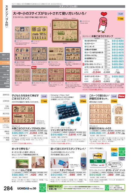 ゴム印11個組お申込番号8-612-40948-612-42408-612-45398-612-44348-612-45708-605-39208-605-39218-605-39238-605-39418-605-3924単位1セット(11種類)8-605-3922単位1セット(11種類)型式/SG-128型式/SDH-043型式/SDH-109型式/SDH-079型式/SDH-124型式/SDH-096型式/SDH-097型式/SDH-127型式/SDH-134型式/SDH-131税込価格¥2,468型式/SDH-125税込価格¥2,863商品種別となりのトトロスヌーピーミニオンズ魔女の宅急便ムーミン谷のなかまたちすみっコぐらし名探偵コナンちいかわちいかわパーティーサンリオキャラクターズ●●●●●●●●●●M価税抜¥2,700税抜価格¥2,244●M価税抜¥2,900ポケットモンスター税抜価格¥2,603[ビバリー]木製ごほうびスタンプ●木製BOX入●木製BOX寸法/101(幅)×86(奥)×26(高)mm●質量/約180g●材質/MDF、ゴム、ウレタン、ポリプロピレン、紙●包装数:1〈セット内容〉30×30mm(3個)20×45mm(2個)・20×15mm(6個)※スタンプ台は付属しません。20mm20mm●すみっコぐらし©2026San-XCo.,Ltd.AllRightsReserved.●サンリオキャラクターズⓒ2024SANRIOCo.,LTD.APPROVAL●名探偵コナン©青山剛昌/小学館・読売テレビ・TMS1996●ポケットモンスター©Nitendo・Creatures・GAMEFREAK・TVTokyo・ShoPro・JRKikaku©Pokémon発売元:ショウワノート株式会社30mm30mmゴム印30個組これ一つで困らない!評価印20本セット。便利な箱入り仕様!ゴム印20個組40mm「Amazing!」Nice!」などテストの採点などに使える言葉が30種類入ったスタンプです。5mm32mm002[ラーニング・リソーシズ]ジャンボごほうびスタンプお申込番号M価税抜8-616-4668¥4,179商品種別型式/LSP0678-J税抜価格税込価格¥3,816¥4,197単位1セット(30種類)●寸法/ケース:235(幅)×200(奥)×40(高)mm、スタンプ:約34×34mm●材質/プラスチック、ゴム●包装数:1※スタンプ台は付属しません。塗って拭くだけでスタンプキレイ!ゴム印の印面に付いたインクや汚れを簡単に落とします。使用例※印面に直接塗って、布などでふき取ってください。[サンビー]評価印20本セット03お申込番号M価税抜8-605-3945¥3,800商品種別型式/QS20-03税抜価格税込価格¥3,420¥3,762単位1セット(20種類)●寸法/ケース:156(幅)×146(奥)×20(高)mm、本体:30(幅)×30(奥)×18(高)mm●質量/330g、本体(1個)/12g●材質/MDF、天然ゴム●包装数:1※スタンプ台は付属しません。スタンプの台紙に。100枚入75×75mm古紙再生紙100%白い付箋を使えば気軽にメッセージを贈れます。[サンビー]お申込番号8-612-4405スタンプキレイM価税抜¥740税抜価格¥590税込価格¥649単位1個[スリーエムジャパン]M価税抜¥3508-612-4529お申込番号ポスト・イット®ノート税抜価格¥280税込価格¥308単位1パック(100枚入)※ビバリーの商品は、カタログ有効期限内でもお取り扱い中止になる場合がございます。あらかじめご了承ください。スタンプ(ゴム印)大・中・小の3サイズがセットされて使い方いろいろ!テストやドリル、日記や手帳に幅広く使えます。30mm30mm30mm●となりのトトロⓒStudioGhibli30mm40mm●スヌーピー©2026PeanutsWorldwideLLCwww.SNOOPY.co.jp●ミニオンズⓒUCSLLC90mm●商品種別型式/HNKS-01商品種別型式/SSK-56商品種別型式/654RP-W●寸法/100(幅)×67(奥)×17(高)mm●質量/16g●材質/ポリスチレン、合成樹脂●包装数:1●寸法/35(径)×100(高)mm●容量/56mL●質量/78g●材質/クリーナー液:溶剤、本体:ポリエチレン●包装数:1●材質/再生紙100%●包装数:1/10●接着剤種類/アクリル系●古紙配合率/284Vol.20地球にやさしくお買い物このマークのついた商品は地球環境保護に配慮された商品です。グリーンの文字で商品の判別をしやすくしました。どうぞご利用ください。エコマーク認定品グリーン購入法適合品GPNエコ商品ねっと掲載●魔女の宅急便ⓒ1989EikoKadono/HayaoMiyazaki/StudioGhibli,N●ムーミン谷のなかまたちⓒMoominCharactersTM●ちいかわ©nagano●ちいかわパーティー©nagano子どもたちをほめて伸ばすごほうびスタンプ。さまざまな場面でご使用いただけます。ゴム印11個組ⓒ2026PeanutsWorldwideLLCwww.SNOOPY.co.jp[ビバリー]木製ごほうびスタンプENGLISHお申込番号M価税抜8-605-3925¥2,700税抜価格税込価格¥2,244¥2,468単位1セット(11種類)商品種別スヌーピー型式/SDH-112●木製BOX入●木製BOX寸法/101(幅)×86奥)×26(高)mm●質量/約180g●材質/MDF、ゴム、ウレタン●包装数:1※スタンプ台は付属しません。まっすぐ押せる!まっすぐに狙った場所へ押せるはんこ・スタンプ補助機能定規です。各種スタンプに対応できます。はんこ定規[サンビー]お申込番号8-605-3905M価税抜¥470税抜価格¥420税込価格¥462単位1個スタンプ(ゴム印)学習ペーパークラフト・素材イベント用品学習支援用品保育安全・安心OA・サプライ用品文具・事務用品日用品装飾用品装飾用式典用品式典用品文集・文集・記念品記念品掲示用品掲示用品スタンプ・シールシールレクリエーレクリエーション用品運動会運動会用品用品AV関連AV関連機器機器