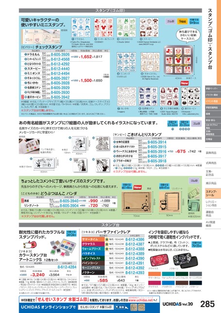 スタンプ(ゴム印)・スタンプ台学習ペーパークラフト・素材イベント用品学習支援用品保育安全・安心OA・サプライ用品文具・事務用品日用品装飾用品飾式典用品式典用品文集・文集・記念品記念品掲示用品掲示用品スタンプ・シールレクリエーレクリエーション用品運動会動用品品AV関連関連機器機器●寸法/黒板:70(奥)×50(幅)×25(高)mm、リングノート:50幅)×50(奥)×25(高)mm●質量/黒板:約53g、リングノート:約37g●材質/ホルダー:木製、印面:ラバー●包装数:1※スタンプ台は付属しません。70mm50mm使用例※高さ25mmスタンプ台耐光性に優れたカラフルなスタンプパッド。印面寸法24×24mm[ツキネコ]カラースタンプ台アートニックS12色セット商品種別型式/02-6205お申込番号8-612-4284M価税抜¥3,600税抜価格¥3,240税込価格¥3,564単位1セット●12個組●寸法/34(幅)×34奥)×20(高)mm●印面寸法/24×24mm●質量/10g●材質/顔料系インク、ABS、スチロール、ウレタン●乾燥時間/再生紙ハガキで10〜15分●普通紙用(非吸収素材には使用不可)●色名/カナリー、スカーレット、バイオレット、ロイヤルブルー、シアン、グリーン、フレッシュグリーン、ピンク、ブラウン、ブラック、ゴールド、シルバー●包装数:1(6色入りケース)×2箱でのお届けです。※[ツキネコ]バーサファインクレア商品種別サマータイムグラマラスウォームブリーズパラダイスレインフォレストパインコーンモーニングミストノクターン型式/02-6245型式/02-6238型式/02-6244型式/02-6243型式/02-6242型式/02-6241型式/02-6240型式/02-6239お申込番号8-612-43868-612-43878-612-43888-612-43898-612-43908-612-43918-612-43928-612-4393インクを吸収しやすい紙なら5秒程で乾く速乾性インクパッドです。●上質紙、クラフト紙、布(コットン、ポリエステルなど)に適しています。●乾燥後は水をはじき、にじみません。印面寸法76×35mmグラマラスノクターンM価税抜¥650税抜価格¥585税込価格¥643単位1個●寸法/97(幅)×57(奥)×23(高)mm●質量/36g●インク/油性顔料●印面寸法/76×35mm●材質/キャップ:ポリプロピレン、本体:ポリスチレン、パッド:ポリエステル●乾燥時間/約3〜5秒(吸収性の良い紙の場合)●包装数:1/240サマータイムウォームブリーズレインフォレストモーニングミストグラマラスパラダイスパインコーンノクターン※コート紙など難吸収性の紙には不適です。布にもスタンプできますが、洗濯すると色落ちする場合がございます。WEB限定で「せんせいスタンプ木製ゴム印」を販売しております。お探しの方はwUCHIDASUCHIDASオンラインショップで木製印ww.uchidas.netへ!Vol.20285ゴム印9個組印面寸法9×9mm持ち運びできるかわいい収納ケース入り。LLC●スヌーピーⓒ2026PeanutsWorldwidewww.SNOOPY.co.jp44mm43mm本体ケース●すみっコぐらし©2026San-XCo.,Ltd.AllRightsReserved.スタンプ(ゴム印)可愛いキャラクターの使いやすいミニスタンプ。使用例●ドラえもん©Fujiko-Pro,Shogakukan,TV-Asahi,Shin-ei,andADK発売元:ショウワノート株式会社●ミッキー&フレンズⓒDISNEY●となりのトトロⓒStudioGhibliM価税抜税抜価格税込価格単位¥1,800¥1,652¥1,817¥1,650¥1,500¥1,6501セット(9個組)●ミニオンズⓒUCSLLC商品種別お申込番号型式/型式/型式/型式/型式/ドラえもんミッキー&フレンズとなりのトトロスヌーピーミニオンズすみっコぐらしちいかわ名探偵コナン千と千尋の神隠し星のカービィ型式/CK9-0098-605-3926CK9-0508-612-4568CK9-0038-612-4292CK9-0158-612-4440CK9-0458-612-4494CK9-0378-605-3927CK9-0568-605-3928CK9-0498-605-3929CK9-0548-605-3930CK9-0598-605-3942型式/型式/型式/型式/●●●●●●●●●●[ビバリー]チェックスタンプ●9個組●寸法/パッケージサイズ:71(幅)×35(奥)×130(高)mm、収納ケースサイズ:43(幅)×44奥)×33(高)mm●印面寸法/9×9mm●材質/天然木、ゴム、ウレタン、アクリル、SUS、PET、紙●包装数:1※スタンプ台は付属しません。※ビバリーの商品は、カタログ有効期限内でもお取り扱い中止になる場合がございます。あらかじめご了承ください。●ちいかわ©nagano●名探偵コナン●千と千尋の神隠し●星のカービィ©青山剛昌/小学館・読売テレビ・TMS1996©2001HayaoMiyazakiStudioGhibli,NDDTM/©Nintendo/HALLaboratory,Inc.あの有名絵画がスタンプに!?絵画の人が励ましてくれるイラストになっています。名刺サイズのカードに押すだけで周りの人を元気づけるメッセージカードに早変わり!印面寸法53×22mm●印面寸法35×35mm●●●●ゴム印M価税抜税抜価格税込価格単位¥750¥675¥7421個お申込番号型式/型式/型式/SKR-GS038-605-3914SKR-GS048-605-3915SKR-GS088-605-3916SKR-GS098-605-3917SKR-GS108-605-3918型式/型式/商品種別女神の応援団あっぱれボナパルトヴィーナスにおまかせききたがりの少女ブラボーの叫び●●●●●[サンビー]ごきげんとりスタンプ●寸法/⓫:60(幅)×30(奥)×18高)mm、⓬⓭⓮⓯:40幅)×40(奥)×18(高)mm●質量/⓫:25g、⓬⓭⓮⓯:23g●材質/MDF、ゴム●包装数:1※スタンプ台は付属しません。印面寸法約61×44mm黒板印面寸法約44×41mmリングノートゴム印50mm50mm1個ちょっとしたコメントに丁度いいサイズのスタンプです。先生からの子どもへのメッセージ、事務員さんから先生への伝言にも