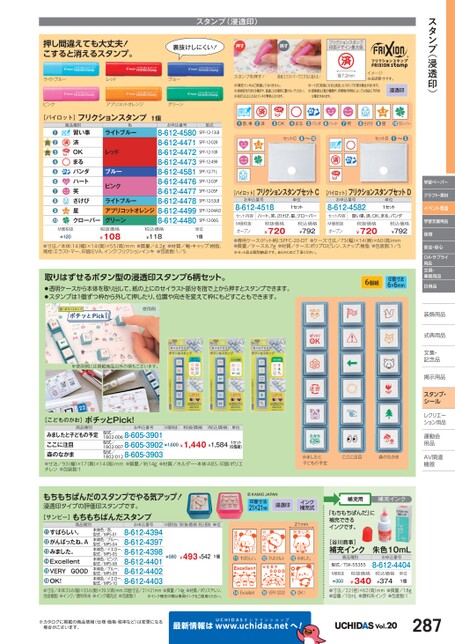 スタンプ(浸透印)学習ペーパークラフト・素材イベント用品学習支援用品保育安全・安心OA・サプライ用品文具・事務用品日用品装飾用品飾式典用品式典用品文集・文集・記念品記念品掲示用品掲示用品スタンプ・シールレクリエーレクリエーション用品運動会動用品品AV関連関連機器機器スタンプを押す!尾栓エラストマーでこすると消える!径7.2mmイメージ※ほぼ原寸です。※補充インキはご用意しておりません。※直射日光の当たる場所や、高温になる場所に置かないでください。※60℃以上になるとインキが無色になります。※-10℃前後になると消去したスタンプが戻る場合があります。※感熱紙など紙の種類や、印刷物の特性によっては消去に不向きな場合があります。浸透印●習い事●済●OK●まる●パンダ●ハート●笑●さけび●星●クローバーセットC●❿〜セットD●●〜[パイロット]フリクションスタンプセットC[パイロット]フリクションスタンプセットDお申込番号8-612-4518単位1セットお申込番号8-612-4582単位1セットセット内容M価税抜オープンハート、笑、さけび、星、クローバー税込価格¥792税抜価格¥720税込価格¥792●専用ケース(ドット柄):SPFC-20-DT●ケース寸法/73(幅)×14(奥)×60(高)mm●質量/ケース:6.7g●材質/ケース:ポリプロピレン、スナップ:樹脂●包装数:1/5※セット品は個別納品です。あらかじめご了承ください。¥720税抜価格セット内容M価税抜オープン習い事、済、OK、まる、パンダ習い事済OKまるパンダハート笑さけび星クローバーレッドブルーピンクライトブルーアプリコットオレンジグリーンお申込番号8-612-45808-612-44718-612-44728-612-44738-612-45818-612-44768-612-44778-612-44788-612-44998-612-4480型式SPF-12-13LBSPF-12-02RSPF-12-10RSPF-12-49RSPF-12-71LSPF-12-03PSPF-12-05PSPF-12-53LBSPF-12-04AOSPF-12-06G●●●●●●●●●●ライトブルーレッドブルーピンクアプリコットオレンジグリーン[パイロット]フリクションスタンプ1個商品種別色ライトブルーM価税抜¥120税抜価格¥108税込価格¥118単位1個●寸法/本体:14(幅)×14奥)×55高)mm●質量/4.2g●材質/軸・キャップ:樹脂、尾栓:エラストマー、印面:EVA、インク:フリクションインキ●包装数:1/5スタンプ(浸透印)押し間違えても大丈夫!こすると消えるスタンプ。裏抜けしにくい!押す消すフリクションスタンプ印面デザイン最大径取りはずせるボタン型の浸透印スタンプ6柄セット。●透明ケースから本体を取り出して、紙の上にのせイラスト部分を指で上から押すとスタンプできます。●スタンプは1個ずつ枠から外して押したり、位置や向きを変えて枠にもどすこともできます。使用例6個組印面寸法6×6mm※使用例には掲載商品以外の柄もございます。[こどものかお]ポチッとPick!商品種別お申込番号M価税抜税抜価格税込価格単位型式/みましたと子どもの予定ここに注目森のなかま●寸法/93(幅)×17(奥)×14高)mm●質量/約14g●材質/ホルダー・本体:ABS、印面:ポリエチレン●包装数:11802-0068-605-39011802-0078-605-39021802-0128-605-3903¥1,600¥1,440¥1,584型式/型式/1セット(6個組)みましたと子どもの予定ここに注目森のなかまもちもちぱんだのスタンプでやる気アップ!浸透印タイプの評価印スタンプです。[サンビー]もちもちぱんだスタンプ商品種別お申込番号M価税抜税抜価格税込価格印面寸法21×21mm浸透印インク補充式単位21mm補充用補充インク「もちもちぱんだ」に補充できるインクです。[谷川商事]補充インク朱色10mL商品種別型式/TSK-55355お申込番号8-612-4404M価税抜¥350税抜価格¥340税込価格¥374単位1個●寸法/22径)×62(高)mm●質量/18g●容量/10mL●顔料系インク●包装数:1¥580¥493¥5421個●すばらしい。●がんばったね。A●みました。本体色/赤、型式/MPS-01本体色/ブルー、型式/MPS-04本体色/イエロー、型式/MPS-05本体色/ピンク、型式/MPS-08本体色/ブルー、型式/MPS-09本体色/イエロー、型式/MPS-108-612-43948-612-43978-612-43988-612-44018-612-44028-612-4403すばらしい。がんばったね。Aみました。ExcellentVERYGOODOK!●●●●●●●寸法/本体:33.6(幅)×33.6(奥)×39.3(高)mm、印面寸法/21×21mm●質量/14g●材質/ポリスチレン、合成樹脂●インク/顔料系朱●インク補充式●包装数:1※インク補充の際は専用インクをご使用ください。●Excellent●VERYGOOD●OK!※カタログに掲載の商品情報(仕様・価格・税率など)は変更になる場合がございます。最新情報はUCHIDASww.uchidas.netwへ!Vol.20287