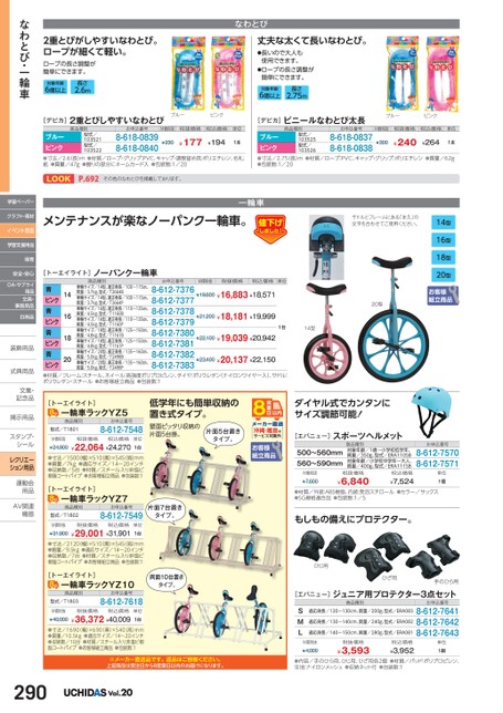2重とびがしやすいなわとび。ロープが細くて軽い。ロープの長さ調整が簡単にできます。長さ2.6m6歳以上対象年齢なわとび丈夫な太くて長いなわとび。●長いので大人も使用できます。●ロープの長さ調整が簡単にできます。対象年齢6歳以上長さ2.75m[デビカ]2重とびしやすいなわとびブルーピンク商品種別お申込番号M価税抜税抜価格税込価格単位型式/103521型式/103522ブルーピンク●寸法/2.6長)m●材質/ロープ・グリップ:PVC、キャップ・調整留め具:ポリエチレン、名札:紙●質量/47g●握りの部分にネームカード入●包装数:1/208-618-08398-618-0840¥177¥194¥2301本商品種別お申込番号M価税抜税抜価格税込価格単位型式/103525型式/103526ブルーピンク●寸法/2.75長)m●材質/ロープ:PVC、キャップ・グリップ:ポリエチレン●質量/62g●包装数:1/208-618-08378-618-0838¥240¥264¥3001本[デビカ]ビニールなわとび太長ブルーピンクLOOKP.692その他のなわとびを掲載しております。メンテナンスが楽なノーパンク一輪車。サドルとフレームにある「まえ」の文字を合わせてご使用ください。一輪車14型16型18型20型お客様組立商品20型14型ダイヤル式でカンタンにサイズ調節可能![エバニュー]スポーツヘルメット500〜560mm560〜590mmM価税抜¥7,600商品種別対象年齢/1歳〜小学校低学年、質量/350g、型式/ERA110SB対象年齢/小学校中学年〜大人、質量/400g、型式/ERA111SB税込価格¥7,524税抜価格¥6,840お申込番号8-612-75708-612-7571単位1個●材質/外装:ABS樹脂、内装:発泡スチロール●カラー/サックス●SG規格適合品●包装数:1/5もしもの備えにプロテクター。ひじ用ひざ用手のひら用[エバニュー]ジュニア用プロテクター3点セット商品種別SML適応身長/120〜130cm、質量/200g、型式/ERA083適応身長/130〜140cm、質量/240g、型式/ERA082適応身長/140〜150cm、質量/280g、型式/ERA081お申込番号8-612-76418-612-76428-612-7643M価税抜¥4,000税抜価格¥3,593税込価格¥3,952単位1組●内容/手のひら用、ひじ用、ひざ用各2個●材質/パッド:ポリプロピレン、生地:ナイロンメッシュ●収納ネット付●包装数:1[トーエイライト]ノーパンク一輪車商品種別お申込番号M価税抜税抜価格税込価格単位1614¥19,600¥16,883¥18,571車輪サイズ/14型、適正身長/100〜115㎝、質量/3.7kg、型式/T2664B車輪サイズ/14型、適正身長/100〜115㎝、質量/3.7kg、型式/T2664P車輪サイズ/16型、適正身長/110〜135㎝、質量/4.5kg、型式/T1160B車輪サイズ/16型、適正身長/110〜135㎝、質量/4.5kg、型式/T1160P車輪サイズ/18型、適正身長/125〜150㎝、質量/4.8kg、型式/T1161B車輪サイズ/18型、適正身長/125〜150㎝、質量/4.8kg、型式/T1161P車輪サイズ/20型、適正身長/135〜160㎝、質量/5.0kg、型式/T2498B車輪サイズ/20型、適正身長/135〜160㎝、質量/5.0kg、型式/T2498P青ピンク青ピンク青ピンク青ピンク●材質/フレーム:スチール、ホイール:高強度ポリプロピレン、タイヤ:ポリウレタン(ナイロンワイヤー入)、サドル:ポリウレタン・スチール●お客様組立商品●包装数:18-612-73768-612-73778-612-73788-612-73798-612-73808-612-73818-612-73828-612-7383¥22,100¥19,039¥20,942¥23,400¥20,137¥22,150¥21,200¥18,181¥19,99918201台[トーエイライト]一輪車ラックYZ5商品種別型式/T1801お申込番号8-612-7548M価税抜¥24,900税抜価格税込価格¥22,064¥24,270単位1台●寸法/1500幅)×510奥)×545高)mm●質量/7kg●適応サイズ/14〜20インチ●収納数/5台●材質/スチール入り非塩ビ樹脂コートパイプ●お客様組立商品●包装数:1[トーエイライト]一輪車ラックYZ7商品種別型式/T1802お申込番号8-612-7549M価税抜¥31,900税抜価格税込価格¥29,001¥31,901単位1台●寸法/2120幅)×510奥)×545高)mm●質量/9.5kg●適応サイズ/14〜20インチ●収納数/7台●材質/スチール入り非塩ビ樹脂コートパイプ●お客様組立商品●包装数:1[トーエイライト]一輪車ラックYZ10商品種別型式/T1803お申込番号8-612-7618低学年にも簡単収納の置き式タイプ。壁面ピッタリ収納の片面5台掛。片面5台置きタイプ。沖縄・離島はサービス対象外お客様組立商品片面7台置きタイプ。両面10台置きタイプ。M価税抜¥40,000税抜価格税込価格¥36,372¥40,009単位1台●寸法/1690(幅)×690(奥)×540(高)mm●質量/10.5kg●適応サイズ/14〜20インチ●収納数/10台●材質/スチール入り非塩ビ樹脂コートパイプ●お客様組立商品●包装数:1※メーカー直送品です。返品はご容赦ください。上記商品は受注日から8営業日以内のお届けになります。290Vol.20なわとび・一輪車学習ペーパークラフト・素材イベント用品学習支援用品保育安全・安心OA・サプライ用品文具・事務用品日用品装飾用品装飾用式典用品式典用品文集・文集・記念品記念品掲示用品掲示用品スタンプ・シールシールレクリエーション用品運動会運動会用品用品AV関連AV関連機器機器