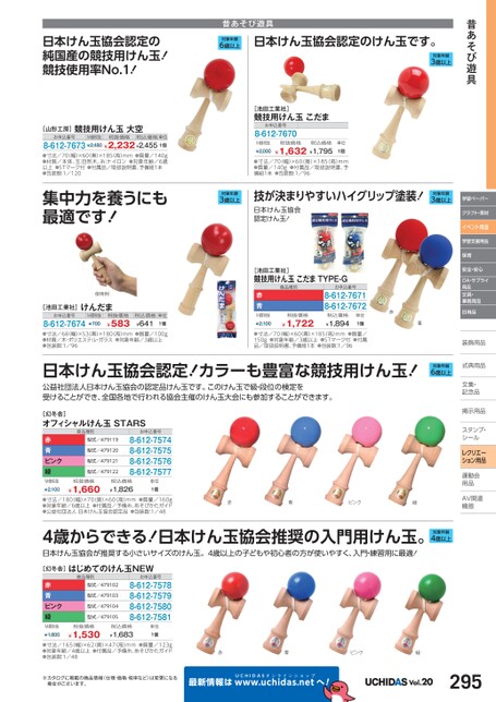 昔あそび遊具学習ペーパークラフト・素材イベント用品学習支援用品保育安全・安心OA・サプライ用品文具・事務用品日用品装飾用品飾式典用品式典用品文集・文集・記念品記念品掲示用品掲示用品スタンプ・シールルレクリエーション用品運動会動用品品AV関連関連機器機器日本けん玉協会認定の純国産の競技用けん玉!競技使用率No.1!昔あそび遊具対象年齢6歳以上日本けん玉協会認定のけん玉です。対象年齢3歳以上[山形工房]競技用けん玉大空お申込番号M価税抜税抜価格税込価格単位8-612-7673¥2,480¥2,232¥2,4551個●寸法/70幅)×60(奥)×185(高)mm●質量/140g●材質/本体、玉:自然木、糸:ナイロン●対象年齢/6歳以上●STマーク付●付属品/取扱説明書、予備紐1本●包装数:1/120集中力を養うにも最適です!使用例[池田工業社]けんだまお申込番号8-612-7674M価税抜¥700税抜価格¥583税込価格単位¥6411個●寸法/68幅)×53(奥)×180(高)mm●質量/100g●材質/木・ポリエステル・ガラス●対象年齢/3歳以上●包装数:1/96[池田工業社]競技用けん玉こだまお申込番号8-612-7670M価税抜¥2,000税抜価格税込価格¥1,632¥1,795単位1個●寸法/70(幅)×60(奥)×185(高)mm●質量/140g●付属品/取扱説明書、予備紐1本●包装数:1/96対象年齢3歳以上技が決まりやすいハイグリップ塗装!日本けん玉協会認定けん玉!対象年齢3歳以上[池田工業社]競技用けん玉こだまTYPE-G商品種別お申込番号8-612-76718-612-7672赤青M価税抜¥2,100税抜価格¥1,722税込価格¥1,894単位1個●寸法/70(幅)×60(奥)×185(高)mm●質量/150g●対象年齢/3歳以上●STマーク付●付属品/取扱説明書、予備紐1本●包装数:1/96赤青日本けん玉協会認定!カラーも豊富な競技用けん玉!公益社団法人日本けん玉協会の認定品けん玉です。このけん玉で級・段位の検定を受けることができ、全国各地で行われる協会主催のけん玉大会にも参加することができます。対象年齢6歳以上[幻冬舎]オフィシャルけん玉STARS商品種別赤青ピンク緑M価税抜¥2,100型式/479119型式/479120型式/479121型式/479122お申込番号8-612-75748-612-75758-612-75768-612-7577税抜価格¥1,660税込価格¥1,826単位1個●寸法/180(幅)×70奥)×60(高)mm●質量/160g●対象年齢/6歳以上●付属品/予備糸、あそびかたガイド●公益社団法人日本けん玉協会認定品●包装数:1/48赤青ピンク緑4歳からできる!日本けん玉協会推奨の入門用けん玉。日本けん玉協会が推奨する小さいサイズのけん玉。4歳以上の子どもや初心者の方が使いやすく、入門・練習用に最適![幻冬舎]はじめてのけん玉NEW対象年齢4歳以上赤青ピンク緑M価税抜¥1,800商品種別型式/479102型式/479103型式/479104型式/479105お申込番号8-612-75788-612-75798-612-75808-612-7581税抜価格¥1,530税込価格¥1,683単位1個●寸法/165(幅)×62奥)×47(高)mm●質量/123g●対象年齢/4歳以上●付属品/予備糸、あそびかたガイド●包装数:1/48赤青ピンク緑※カタログに掲載の商品情報(仕様・価格・税率など)は変更になる場合がございます。最新情報はUCHIDASww.uchidas.netwへ!Vol.20295