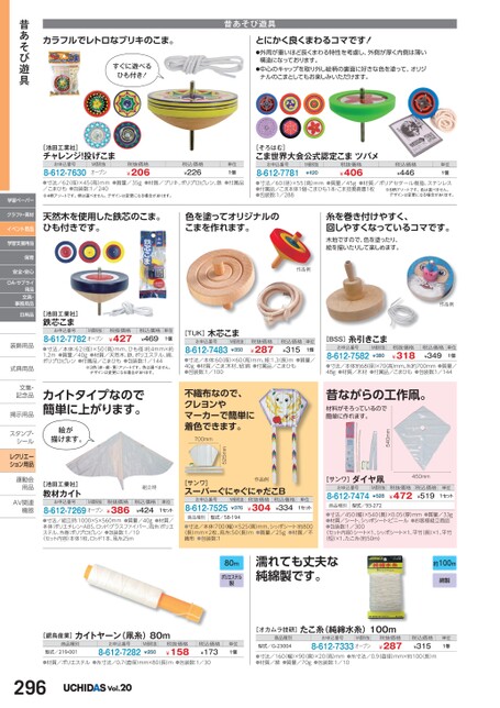 すぐに遊べるひも付き![池田工業社]チャレンジ!投げこまお申込番号8-612-7630M価税抜オープン税抜価格¥206税込価格¥226単位1個●外周が重いほど長くまわる特性を考慮し、外側が厚く内側は薄い構造になっております。●中心のキャップを取り外し絵柄の裏面に好きな色を塗って、オリジナルのこまとしてもお楽しみいただけます。[そろはむ]こま世界大会公式認定こまツバメお申込番号8-612-7781M価税抜¥420税抜価格¥406税込価格¥446単位1個●寸法/62(径)×45(高)mm●質量/35g●材質/ブリキ、ポリプロピレン、鉄●付属品/こまひも●包装数:1/240※4柄アソートです。柄は選べません。デザインは変更になる場合があります。●寸法/60(径)×55(高)mm●質量/45g●付属品/こま本体1個・こまひも1本・こま技奥義書1枚●包装数:1/288●材質/ポリアセタール樹脂、ステンレス※6柄アソートです。色は選べません。デザインは変更になる場合があります。天然木を使用した鉄芯のこま。ひも付きです。色を塗ってオリジナルのこまを作れます。糸を巻き付けやすく、回しやすくなっているコマです。木地ですので、色を塗ったり、絵を描いたりして楽しめます。作品例作品例税抜価格¥318税込価格¥349単位1個[BSS]糸引きこまお申込番号8-612-7582M価税抜¥380●寸法/本体:約68径)×70高)mm、糸:約700mm●質量/48g●材質/木材●付属品/こまひも●包装数:1/144昔ながらの工作凧。材料がそろっているので簡単に作れます。540mm[TUK]木芯こまお申込番号8-612-7483M価税抜¥350税抜価格¥287税込価格¥315単位1個●寸法/本体:60(径)×60(高)mm、紐:1.3(長)m●質量/40g●材質/こま:木材、紐:綿●付属品/こまひも●包装数:1/100不織布なので、クレヨンやマーカーで簡単に着色できます。700mm525mm[池田工業社]鉄芯こまお申込番号M価税抜8-612-7782オープン税抜価格¥427税込価格¥469単位1個●寸法/本体:62(径)×50(高)mm、ひも径:約4mm×約1.2m●質量/40g●材質/天然木、鉄、ポリエステル、綿、ポリプロピレン●付属品/こまひも●包装数:1/144※3色(赤・紺・黄)アソートです。色は選べません。デザインは変更になる場合があります。カイトタイプなので簡単に上がります。絵が描けます。[池田工業社]教材カイトお申込番号M価税抜8-612-7269オープン組立時税抜価格¥386税込価格¥424単位1セット●寸法/組立時:1000×5×560mm●質量/40g●材質/本体:ポリエチレン・ABS、ロッド:グラスファイバー、凧糸:ポリエステル、糸巻:ポリプロピレン●包装数:1/10〈セット内容〉本体1枚、ロッド1本、凧糸25m[サンワ]スーパーぐにゃぐにゃだこB作品例お申込番号8-612-7525M価税抜¥376税抜価格¥304税込価格¥334単位1セット商品種別型式/58-194●寸法/本体:700(幅)×525(奥)mm、シッポシート:約800(長)mm×2枚、凧糸:50(長)m●質量/25g●材質/不織布●包装数:1[サンワ]ダイヤ凧お申込番号8-612-7474M価税抜¥528450mm税抜価格¥472税込価格¥519単位1セット商品種別型式/93-272●寸法/450(幅)×540(奥)×0.05(厚)mm●質量/33g●材質/シート、シッポシート:ビニール●お客様組立商品●包装数:1/300〈セット内容〉シート×1、シッポシート×1、平竹(長)×1、平竹(短)×1、たこ糸(約50m)カラフルでレトロなブリキのこま。とにかく良くまわるコマです!昔あそび遊具昔あそび遊具学習ペーパークラフト・素材イベント用品学習支援用品保育安全・安心OA・サプライ用品文具・事務用品日用品装飾用品装飾用式典用品式典用品文集・文集・記念品記念品掲示用品掲示用品スタンプ・シールシールレクリエーション用品運動会運動会用品用品AV関連AV関連機器機器80mポリエステル製濡れても丈夫な純綿製です。約100m綿製税込価格¥315単位1巻[銀鳥産業]カイトヤーン(凧糸)80m商品種別型式/219-001お申込番号8-612-7282M価税抜¥250税抜価格¥158税込価格¥173単位1個●材質/ポリエステル●糸寸法/0.7直径)mm×80長)m●包装数:1/30296Vol.20[オカムラ技研]たこ糸(純綿水糸)100m商品種別型式/G-23004お申込番号M価税抜8-612-7333オープン税抜価格¥287●寸法/160(幅)×90(奥)×20(高)mm●糸寸法/0.9(直径)mm×約100(長)m●材質/綿●質量/70g●包装数:1/10