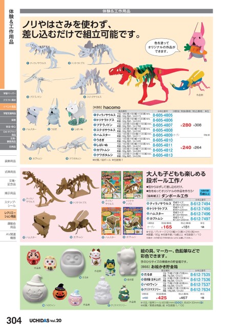 お申込番号8-612-75358-612-75368-612-75378-612-7634単位1個手のひらサイズの素焼きの貯金箱です。[BSS]お絵かき貯金箱商品種別M価税抜¥450税抜価格¥425税込価格¥467寸法/70(幅)×72(奥)×79高)mm、質量/76g、型式/03-5272だるま招き猫(右手上げ)寸法/65(幅)×70(奥)×100(高)mm、ハロウィンクリスマスツリー質量/84g、型式/03-5276寸法/75(幅)×70(奥)×80高)mm、質量/63g、型式/03-5278寸法/68(幅)×71(奥)×100(高)mm、質量/108g、型式/03-5263●●●●●招き猫体験&工作用品ノリやはさみを使わず、差し込むだけで組立可能です。●ティラノサウルス●トリケラトプス色を塗ってオリジナルの作品ができます。●プテラノドン●ステゴサウルス作品例商品種別寸法/340(長)×50(幅)×130高)mm、質量/80g、型式/24-0173寸法/270(長)×50(幅)×120高)mm、質量/80g、型式/24-0203寸法/220(長)×430幅)×150高)mm、質量/80g、型式/24-2788寸法/240(長)×65(幅)×120高)mm、質量/80g、型式/24-0180寸法/100(長)×100幅)×120高)mm、質量/80g、型式/24-0111寸法/100(長)×90(幅)×160高)mm、質量/80g、型式/24-1699寸法/160(長)×80(幅)×150高)mm、質量/80g、型式/24-4232寸法/200(長)×120幅)×120高)mm、質量/80g、型式/24-0289寸法/220(長)×120幅)×110高)mm、質量/80g、型式/24-0296M価税抜税抜価格税込価格単位¥280¥308オープン1セット¥240¥264お申込番号8-605-48058-605-48068-605-48078-605-48088-605-48098-605-48108-605-48118-605-48128-605-4813ティラノサウルストリケラトプスプテラノドンステゴサウルスハムスターうさぎしばいぬカブトムシクワガタムシ❶●●●●●●●●[KBS]hacomo●材質/段ボール●包装数:1●ハムスター●うさぎ●しばいぬ●カブトムシ●クワガタムシ大人も子どもも楽しめる段ボール工作!●型からはずして差し込むだけ。●色をぬってオリジナルの作品を作ろう![協和紙工]ダンボール工作対象年齢6歳以上お申込番号8-612-74948-612-74958-612-74968-612-7497商品種別完成サイズ:約180×250mm完成サイズ:約90×220mm完成サイズ:約120×90mm完成サイズ:約120×200mmティラノサウルストリケラトプスハムスターカブトムシ●●●●税抜価格¥165M価税抜オープン●寸法/パッケージ:210(幅)×3(奥)×295(高)mm●質量/80g●対象年齢/6歳以上●包装数:1/10※段ボールの切り口で手を切らないように注意してください。税込価格¥181単位1袋絵の具、マーカー、色鉛筆などで彩色できます。❿ティラノサウルス●トリケラトプス❿ティラノサウルス⓫トリケラトプス●ハムスター●カブトムシ●ハムスター●カブトムシ体験&工作用品学習ペーパークラフト・素材イベント用品学習支援用品保育安全・安心OA・サプライ用品文具・事務用品日用品装飾用品装飾用式典用品式典用品文集・文集・記念品記念品掲示用品掲示用品スタンプ・シールシールレクリエーション用品運動会運動会用品用品AV関連AV関連機器機器作品例作品例●だるま●ハロウィン作品例●クリスマスツリー作品例304Vol.20●寸法/底用シール:40(径)mm(●●●)、約40×30mm(●)●材質/素焼き陶器、紙●包装数:1/100