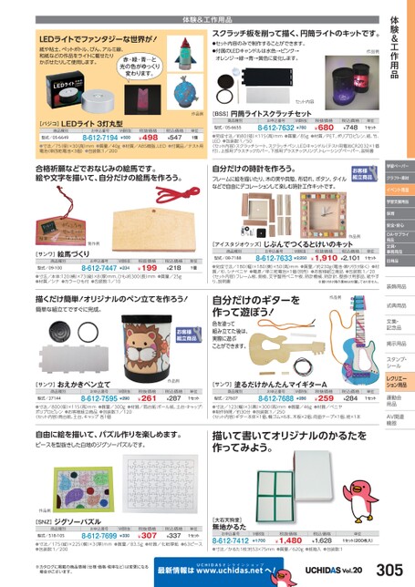 体験&工作用品学習ペーパークラフト・素材イベント用品学習支援用品保育安全・安心OA・サプライ用品文具・事務用品日用品装飾用品飾式典用品式典用品文集・文集・記念品記念品掲示用品掲示用品スタンプ・シールルレクリエーション用品運動会動用品品AV関連関連機器機器LEDライトでファンタジーな世界が!紙や粘土、ペットボトル、びん、アルミ線、和紙などの作品をライトに載せたりかぶせたりして使用します。赤・緑・青…と光の色がゆっくり変わります。体験&工作用品スクラッチ板を削って描く、円筒ライトのキットです。●セット内容のみで制作することができます。●付属のLEDキャンドルは水色→ピンク→オレンジ→緑→青→黄色に変化します。作品例セット内容[パジコ]LEDライト3灯丸型商品種別型式/05-6649お申込番号8-612-7194M価税抜¥500作品例税抜価格¥498税込価格¥547単位1個●寸法/75(径)×30(高)mm●質量/40g●材質/ABS樹脂、LED●付属品/テスト用電池(単四乾電池×3個)●包装数:1/200合格祈願などでおなじみの絵馬です。絵や文字を描いて、自分だけの絵馬を作ろう。制作例[サンワ]絵馬づくり商品種別型式/09-100お申込番号8-612-7447M価税抜¥234税抜価格¥199税込価格¥218単位1個●寸法/本体:120横)×73(縦)×8(厚)mm、ひも:約300(長)mm●質量/25g●材質/シナ●カラーひも付●包装数:1/10描くだけ簡単!オリジナルのペン立てを作ろう!簡単な組立てですぐに完成。[サンワ]おえかきペン立て商品種別型式/27144お申込番号M価税抜8-612-7595¥290作品例税抜価格¥261税込価格¥287単位1セット[BSS]円筒ライトスクラッチセット商品種別型式/05-6655お申込番号M価税抜8-612-7632¥780税抜価格¥680税込価格¥748単位1セット●完成寸法/約80(径)×115高)mm●質量/85g●材質/PET、ポリプロピレン、紙、竹、LED●包装数:1/50付)、上部用プラスチックカバー、下部用プラスチックリング、トレーシングペーパー、説明書〈セット内容〉スクラッチシート、スクラッチペン、LEDキャンドル(テスト用電池CR2032×1個自分だけの時計を作ろう。フレームに絵を描いたり、木の実や貝殻、布切れ、ボタン、タイルなどで自由にデコレーションして楽しむ時計工作キットです。[アイスタジオウッズ]じぶんでつくるとけいのキット商品種別型式/08-7188お申込番号M価税抜8-612-7633¥2,250税抜価格¥1,910税込価格¥2,101単位1セット作品例●完成寸法/180(幅)×180(奥)×50(高)mm●質量/約230g電池・飾り付け除く)●材質/杉、シナベニヤ●電源/単三乾電池×1個(別売)●お客様組立商品●包装数:1/20〈セット内容〉フレーム板、側板、文字盤用ベニヤ板、時計機械、時計針、壁掛け用部品、紙やすり、説明書※飾り付け用の素材は付属しておりません。作品例自分だけのギターを作って遊ぼう!色を塗って組み立てた後は、実際に遊ぶことができます。[サンワ]塗るだけかんたんマイギターA商品種別型式/27607お申込番号8-612-7688M価税抜¥286税抜価格¥259税込価格¥284単位1セット●寸法/800径)×115(高)mm●質量/300g●材質/筒台紙:ボール紙、土台・キャップ:ポリプロピレン●お客様組立商品●包装数:1/120〈セット内容〉筒台紙、土台、キャップ各1個●寸法/123(幅)×3(奥)×300(高)mm●質量/46g●材質/ベニヤ●制作時間/約30分●包装数:1/250〈セット内容〉ギター本体×1個、輪ゴム×6本、木板×2個、両面テープ×1個、紐×1本自由に絵を描いて、パズル作りを楽しめます。ピースを型抜きした白地のジグソーパズルです。描いて書いてオリジナルのかるたを作ってみよう。作品例[SNZ]ジグソーパズル商品種別型式/518-105お申込番号8-612-7699M価税抜¥330税抜価格¥307税込価格¥337単位1セット●寸法/175(縦)×225(横)×3(厚)mm●質量/83.5g●材質/化粧厚紙●63ピース●包装数:1/200[大石天狗堂]無地かるたお申込番号8-612-7412M価税抜¥1,700税抜価格¥1,480税込価格¥1,628単位1セット(200枚入)●寸法/かるた1枚:約53×75mm●質量/620g●紙箱入●包装数:1※カタログに掲載の商品情報(仕様・価格・税率など)は変更になる場合がございます。最新情報はUCHIDASww.uchidas.netwへ!Vol.20305