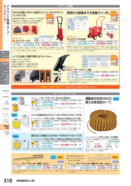 グラウンド整備だれもが使いやすい大型のユニバーサルデザインハンドルです。●楽な姿勢で簡単にラインを引くことができます。●中空ローラー採用によりムラのない鮮明できれいなラインを引くことができます。沖縄・離島はサービス対象外使用例野球から授業まで大容量ライン引。フィールド用野球用炭カル24kg5cm1180m1730m7.6cm700mー対応容量ライン幅概算距離通常モードECOモード沖縄・離島はサービス対象外ECOモードに合わせると約1730m引ける。[エバニュー]ラインビークルフィールド用野球・ソフト用ライン幅概算距離5cm280m7.6cm210m商品種別型式/EKA626お申込番号8-613-8522¥21,600¥18,400¥20,240M価税抜税抜価格税込価格単位1台●寸法/300(幅)×360(奥)×1060(高)mm●質量/約4kg●標準容量/10kg●材質/タンク:ポリエチレン、下部・ハンドル・レバー・ホイール:ポリカーボネート、フタ:ポリプロピレン、タイヤ:EVA樹脂●日本製●包装数:1いつでも良い状態で使えるラインカー。●きれいなラインが引ける。●変形しない強化プラボディ。●1台で2種類のライン幅切り替え可能。●正確に狙えるライン照準ガイド付き。使用例[エバニュー]eライン引4WB商品種別型式/EKA615お申込番号8-613-8618¥41,500¥34,800¥38,280M価税抜税抜価格税込価格単位1台●炭酸カルシウム用●寸法/本体:537(幅)×381(奥)×420(高)mm、取っ手:730〜875(高)mm●質量/10.5kg●標準容量/炭酸カルシウム:24kg●材質/鋼板製●チャンネルロールブラシ●CLOSE機能付●5cm幅粉節約ECOモード付●下部取り外し可能●地面から粉出部までの高さ4.3cm●包装数:1型式対応容量WG0024-0507WG0024-0512炭カル約40kgライン幅概算距離フィールド5/7.6cm5/12cm5cm幅:約1000m7.6cm幅:約660m野球、陸上用5cm幅:約1000m12cm幅:約420mサッカー、陸上用沖縄・離島はサービス対象外[モルテン]レーザーライナー4輪商品種別お申込番号M価税抜税抜価格税込価格単位型式/型式/WG0024-05078-613-8466WG0024-05128-613-84675cm/7.6cm5cm/12cm●寸法/350(幅)×830奥)×1010(高)mm●質量/10.5kg●標準容量/炭酸カルシウム:約40kg●材質/タンク、ハンドル、フタ:ポリプロピレン、シャーシ:ナイロン、タイヤ:EVA樹脂、車軸:スチール●包装数:1¥38,368¥42,204¥41,8001台※メーカー直送品です。返品はご容赦ください。上記商品は受注日から8営業日以内のお届けになります。ロープ・ロープマーカー[エバニュー]ロープマーカー6mm×200m商品種別型式/EKA183Y型式/EKA183Wお申込番号M価税抜税抜価格税込価格単位8-613-76688-613-7669黄白●寸法/6(径)mm×200(長)m●質量/約4.7kg●ロープマーカー専用釘付(3×137mm、70本)●包装数:1/3¥22,900¥18,770¥20,6471組運動会の仕切りなどに使える多目的ロープ。100mクイ×100本付きのスタンダードタイプのグランドロープです。[トーエイライト]グランドロープ6mm×300m(クイ付)商品種別型式/G1189型式/G1581お申込番号M価税抜税抜価格税込価格単位8-613-84778-613-8478黄白●寸法/ロープ:6径)mm×300(長)m、クイ:3(径)×100(長)mm、100本●質量/2kg●材質/ロープ:ポリエチレン、クイ:スチール(クロメートメッキ仕上げ)●包装数:1¥23,500¥19,270¥21,1971組目的に応じてお選びいただけるロープのみのグランドロープです。[トーエイライト]グランドロープ6mm×300m(クイなし)商品種別型式/G1586Y型式/G1586Wお申込番号M価税抜税抜価格税込価格単位黄白●寸法/6径)mm×300長)m●質量/1.5kg●材質/ポリエチレン●クイ/なし●包装数:1¥19,400¥16,490¥18,1398-613-85128-613-85111巻[トーエイライト]グランドロープYB8商品種別型式/B3534お申込番号8-613-8752M価税抜¥5,500税抜価格¥4,400税込価格¥4,840単位1巻●寸法/8径)mm×100(長)m●質量/2.5kg●材質/ポリエチレン●包装数:1200m白黄300m黄300m白黄白グラウンド整備・ロープ・ロープマーカー学習ペーパークラフト・素材イベント用品学習支援用品保育安全・安心OA・サプライ用品文具・事務用品日用品装飾用品装飾用式典用品式典用品文集・文集・記念品記念品掲示用品掲示用品スタンプ・シールシールレクリエーレクリエーション用品運動会用品AV関連AV関連機器機器径4mm50本入スチール製●二本釘なので抜けにくい!●ロープマーカー0.3cm、0.6cm、0.8cm用。145mm50本入スチール製148mm[エバニュー]ロープマーカー用釘50本入商品種別型式/EKA187お申込番号M価税抜8-613-7670¥3,300税抜価格¥2,760税込価格¥3,036(50本入)●寸法/4(径)×148長)mm●材質/スチール、ユニクロメッキ仕上げ●質量/20g1本)●包装数:1/50単位1組[エバニュー]ロープマーカー用釘4×145(50本入)商品種別型式/EKA189お申込番号M価税抜8-613-8587¥5,800税抜価格¥5,220税込価格¥5,742(50本入)●寸法/4(径)×145(奥)mm●質量/30g1本)●材質/スチール、ユニクロメッキ仕上げ●包装数:1/50単位1組316Vol.20