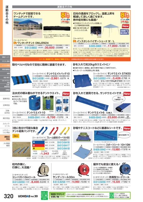 ワンタッチで設営できるドームテントです。運動会その他沖縄・離島はサービス対象外キャリーバッグ※本テントは簡易利用を目的としており、常設には適しておりません。強風・豪雨時などの場合はテントが破損する恐れがあります。[トーエイライト]ワンタッチテントDMJ2924商品種別型式/G1894お申込番号8-613-8802¥36,000¥30,600¥33,660M価税抜税抜価格税込価格単位1台●寸法/設置時:2900幅)×2900(奥)mm、垂幕部:1860〜1960mm、収納時:200×230×1300mm●高さ2段階調整(頂点部2600〜2700mm)●質量/13kg●材質/脚:スチール(25・20mm角)、天幕:ポリエステル撥水性(190D厚)●付属品/杭×4本、キャリーバッグ●包装数:1日光の透過をブロックし、温度上昇を軽減して涼しく過ごせます。熱中症対策にも最適!●天井部分にワンタッチシステムを搭載したことで簡単設営を実現。●風に強く雨や日差しが入りにくいひさし型。沖縄・離島はサービス対象外[コールマン]使用例インスタントバイザーシェードⅣ/L商品種別型式/2243954お申込番号M価税抜税抜価格税込価格単位8-605-5969¥17,00¥17,800¥19,5801台●寸法/シェード:3000(幅)×3000(奥)×2600高)mm、フレーム(上部)約2500×2500mm、フレーム(下部)約3000×3000mm、収納サイズ:約1000(幅)×200(奥)×200(高)mm●質量/約13.5kg●材質/シェードスキン:75Dポリエステルタフタ(ダークルームTMテクノロジー、UVPRO、PU防水、シームシール)、フレーム:スチール●高さ3段階調整(2600・2500・2400mm)●付属品/ペグ、ロープ、収納ケース●お客様組立商品●包装数:1※メーカー直送品です。返品はご容赦ください。上記商品は受注日から8営業日以内のお届けになります。取付ベルト付なので支柱に簡単に装着できます。[トーエイライト]テントウエイトバッグ10お申込番号M価税抜税抜価格税込価格単位8-613-8381¥3,300¥2,981¥3,2791個商品種別型式/B2449●寸法/480(幅)×280(奥)mm●質量/410g●材質/内袋:ナイロン、外被:ターポリン●取付ベルト付●砂専用(約10kg用)●包装数:1/5注水式の積み重ねができるテントウエイト。●水専用です。●28mm角、40mm丸パイプまで使用可能。砂を入れて約20kgのウエイトに!●砂漏れを防ぐ二重構造。屋内外兼用で幅広くご使用できます。●サッカーゴールの転倒防止用に最適。[トーエイライト]サンドウエイトSTW20お申込番号M価税抜8-613-8353¥3,700税抜価格税込価格単位¥3,426¥3,7681枚商品種別セパレートタイプ20kg用STW20型式/B-2870●寸法/385(幅)×675(奥)mm●質量/450g●材質/内袋:ナイロン+PVC、外被:ターポリン●取っ手、ファスナー付●包装数:1/25※砂は別途ご用意ください。砂を入れて使用できる、サンドウエイトです。袋は二重構造です。運動会その他学習ペーパークラフト・素材イベント用品学習支援用品保育安全・安心OA・サプライ用品文具・事務用品日用品装飾用品装飾用式典用品式典用品文集・文集・記念品記念品掲示用品掲示用品スタンプ・シールシールレクリエーレクリエーション用品運動会用品AV関連AV関連機器機器[トーエイライト]テントウエイト10使用例商品種別型式/B3654お申込番号8-605-5941¥7,450M価税抜税抜価格税込価格¥6,700¥7,370単位1個●寸法/260(径)×260(高)mm●質量/1kg(満水時約10kg)●材質/ポリエチレン●包装数:13色に色分け可能な集会テント結束バンドです。2本入[トーエイライト]フレーム結束カラーベルト90青赤黄商品種別型式/G1439B型式/G1439R型式/G1439Yお申込番号8-613-84168-613-84178-613-8418M価税抜¥1,500税抜価格¥1,343税込価格¥1,477単位1セット(2本入)使用例●寸法/25(幅)×900(長)mm●質量/80g(1本)●材質/ベルト部:ポリプロピレン、金具:スチール●包装数:1校内作業に、行事に、大活躍![トーエイライト]サンドウエイト610枚入商品種別お申込番号M価税抜税抜価格税込価格型式/B24198-605-5943¥26,00¥23,600¥25,960(10枚入)●寸法/150(横)×800(長)mm●質量/180g(1枚)●材質/内袋:ナイロン+ポリ塩化ビニル、外被:ターポリン●ロングウエイト5〜6kg用●ファスナー付●屋内外兼用●包装数:1単位1組砂場やテニスコートなどに最適なシートです。屋内外兼用です。サンドウエイト6と組み合わせたイメージ[トーエイライト]お申込番号スポーツシート10×10MM価税抜税抜価格税込価格単位8-605-5942¥17,700¥15,980¥17,5781枚商品種別型式/G1389●寸法/10(横)×10(縦)m×0.23(厚)mm●質量/15kg●材質/ポリエチレン、両面ラミネート加工●周囲90cmピッチハトメ加工●包装数:1使用例屋外でも安全に使える!コンセント配電盤部を一体構造とした画期的な防水構造。コンセントキャップ付で未使用時も水、ホコリの侵入を防ぎます。[ハタヤリミテッド]防雨型コードリールお申込番号M価税抜8-613-8256¥20,400税抜価格¥16,320税込価格単位¥17,9521台[ハタヤリミテッド]コンパクト10mリールお申込番号8-613-8259¥10,500M価税抜税抜価格税込価格¥8,400¥9,240単位1台[ハタヤリミテッド]サンデーリール30mお申込番号8-613-8258¥18,700M価税抜税抜価格税込価格¥14,960¥16,456単位1台商品種別型式/JT-101商品種別型式/S-30商品種別型式/SS-30●コード長さ/10m●質量/2.3kg●単相/100V●電線/2.0mm2●芯数/2●許容電流/15A●定格電流/5A●コンセント/