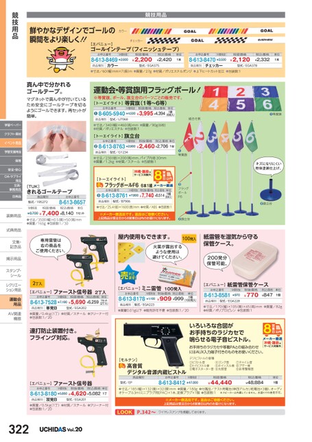組合せ例❶等賞旗賞旗●等お申込番号M価税抜税抜価格税込価格8-605-5940¥4,500¥3,995¥4,394単位1組(6枚入)●商品種別型式/U7068●寸法/340幅)×460高)mm●質量/90g(6枚)●材質/ポリエステル●包装数:1お申込番号M価税抜税抜価格税込価格単位8-613-8763¥2,900¥2,460¥2,7061台品種別型式/G1234❷商[トーエイライト]旗立台●寸法/230径)×200高)mm、パイプ内径:30mm●質量/1.2kg●材質/スチール●包装数:1運動会・等賞旗用フラッグポール!※等賞旗、ポール、旗立台のパーツごとの販売です。[トーエイライト]等賞旗(1等〜6等)キズになりにくい粉体塗装仕上げ。❷旗立台紙雷管を湿気から守る保管ケース。200発分保管可能。[エバニュー]紙雷管保管ケースお申込番号8-613-8581M価税抜¥970税抜価格¥770税込価格¥847単位1個商品種別型式/EGA228●寸法/170(幅)×105(奥)×45(高)mm●質量/82g●材質/ポリプロピレン●包装数:1ラッグポールF6●フ沖縄・離島はサービス対象外[トーエイライト]フラッグポールF66本1組お申込番号M価税抜8-613-8761¥7,800税抜価格税込価格単位1組¥7,740¥8,514(6本入)●商品種別型式/B7906●寸法/25.4(径)×1600(長)mm●材質/ABS●包装数:1※メーカー直送品です。返品はご容赦ください。上記商品は受注日から8営業日以内のお届けになります。❷旗立台屋内使用もできます。100発入火薬が露出するような使用は避けてください。[エバニュー]ミニ雷管100発入お申込番号M価税抜8-613-8178¥1,100商品種別型式/EGA223税抜価格税込価格¥909¥999単位1箱(100発入)●薬量0.01g以下●販売許可不要●包装数:1/20[エバニュー]ファースト信号器2丁入お申込番号M価税抜税抜価格税込価格8-613-7528¥7,190¥5,690¥6,259単位1セット(2丁入)商品種別単発B型式/EGA202●質量/0.4kg(1丁)●材質/スチール●クリーナー付●包装数:1/20連打防止装置付き。フライング対応。いろいろな合図がお手持ちのラジカセで鳴らせる電子音ピストル。お手持ちのラジカセや移動PAとの組み合わせにはAUX入力端子付きのものをお使いください。デジピストルの音種①ピストル音②トイピストル音③電子スターター音④ゴング音⑤ホイッスル音⑥太鼓音⑦チャイム音⑧ブザー音⑨非常警報音沖縄・離島はサービス対象外[モルテン]高音質デジタル音源内蔵ピストル商品種別型式/EPお申込番号M価税抜8-613-8412¥47,300税抜価格¥44,440税込価格¥48,884単位1個●寸法/185(幅)×132奥)×32(厚)mm●質量/180g●付属品/テスト用電池(単四アルカリ乾電池×3個)、オーディオケーブル3m(ミニプラグ用EPAC)×1本、変換プラグ×1個●包装数:1※スピーカーは内蔵していません。水廻りでの使用不可。※メーカー直送品です。返品はご容赦ください。上記商品は受注日から8営業日以内のお届けになります。LOOKP.342〜ワイヤレスアンプを掲載しております。鮮やかなデザインでゴールの瞬間をより楽しく!!競技用品カラーチェッカー[エバニュー]ゴールインテープ(フィニッシュテープ)お申込番号M価税抜8-613-8469¥2,600税抜価格¥2,200税込価格¥2,420単位1本商品種別カラー型式/EGA375商品種別●寸法/60(幅)mm×7長)m●質量/27g●材質/ポリエステルポンジ●上下ヒートカット加工●包装数:1お申込番号M価税抜8-613-8470¥2,500チェッカー税抜価格¥2,120税込価格¥2,332単位1本型式/EGA378真ん中で分かれるゴールテープ。マグネットで真ん中が付いているため安全にゴールテープを切るようにゴールできます。再セットが簡単。[TUK]きれるゴールテープ商品種別型式/195272お申込番号8-613-8657M価税抜税抜価格税込価格¥8,700¥7,400¥8,140単位1セット●寸法/3500(幅)×0.5(奥)×50(高)mm●質量/165g●包装数:1/30専用雷管は右の商品をご使用ください。2丁入競技用品学習ペーパークラフト・素材イベント用品学習支援用品保育安全・安心OA・サプライ用品文具・事務用品日用品装飾用品装飾用式典用品式典用品文集・文集・記念品記念品掲示用品掲示用品スタンプ・シールシールレクリエーレクリエーション用品運動会用品AV関連AV関連機器機器[エバニュー]ファースト信号器お申込番号M価税抜税抜価格8-613-8180¥5,850¥4,620¥5,082税込価格単位1丁商品種別双発B型式/EGA201●質量/0.5kg(1丁)●材質/スチール●クリーナー付●包装数:1/20322Vol.20