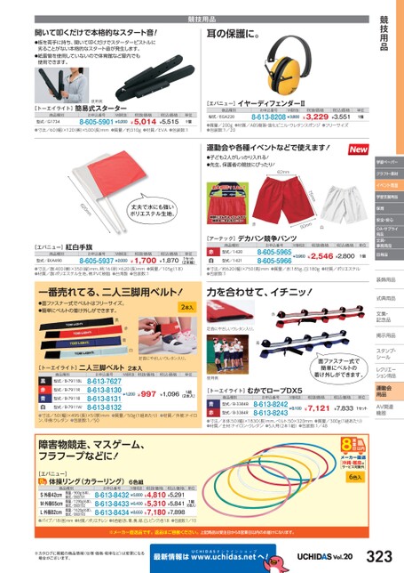 競技用品学習ペーパークラフト・素材イベント用品学習支援用品保育安全・安心OA・サプライ用品文具・事務用品日用品装飾用品飾式典用品式典用品文集・文集・記念品記念品掲示用品掲示用品スタンプ・シールルレクリエーレクリエーション用品運動会用品AV関連関連機器機器[トーエイライト]商品種別型式/G1734使用例簡易式スターターお申込番号M価税抜8-605-5901¥5,200税抜価格¥5,014税込価格¥5,515単位1個●寸法/60(幅)×120(奥)×500(長)mm●質量/約310g●材質/EVA●包装数:1イヤーディフェンダーⅡ[エバニュー]商品種別型式/EGA220お申込番号税込価格¥3,551●質量/200g●材質/ABS樹脂・塩化ビニル・ウレタンスポンジ●フリーサイズ●包装数:1/208-613-8208¥3,800¥3,229税抜価格M価税抜単位1個運動会や各種イベントなどで使えます!●子ども2人がしっかり入れる!●先生、保護者の競技にぴったり!62mm75mm赤mm05白丈夫で水にも強いポリエステル生地。m620m紅白手旗[エバニュー]商品種別型式/EKA490お申込番号M価税抜8-605-5937¥2,000税抜価格¥1,700税込価格¥1,870単位1セット(2本組)●寸法/旗:400横)×350縦)mm、柄:16(径)×620(長)mm●質量/105g1本)●材質/旗:ポリエステル生地、柄:PVC樹脂●台湾製●包装数:1[アーテック]商品種別デカパン競争パンツお申込番号M価税抜税抜価格税込価格単位型式/1420赤白●寸法/約620(幅)×750(高)mm●質量/赤:185g、白:180g●材質/ポリエステル●包装数:1¥3,960¥2,546¥2,8008-605-59658-605-5966型式/14211個開いて叩くだけで本格的なスタート音!●板を両手に持ち、開いて叩くだけでスターターピストルに劣ることがない本格的なスタート音が発生します。●紙雷管を使用していないので体育館など屋内でも使用できます。競技用品耳の保護に。一番売れてる、二人三脚用ベルト!力を合わせて、イチニッ!●面ファスナー式でベルトはフリーサイズ。●簡単にベルトの着け外しができます。黒赤青白2本入赤足首にやさしいウレタン入り。青足首にやさしいウレタン入り。[トーエイライト]二人三脚ベルト2本入商品種別型式/B-7911BLお申込番号M価税抜税抜価格税込価格単位型式/B-7911R黒赤青白●寸法/50幅)×495(長)×5(厚)mm●質量/50g(1組あたり)●材質/外被:ナイロン、中身:ウレタン●包装数:1/508-613-76278-613-81308-613-81318-613-8132¥997¥1,096型式/B-7911W型式/B-7911B(2本入)¥1,2001組障害物競走、マスゲーム、フラフープなどに![エバニュー]体操リング(カラーリング)6色組商品種別お申込番号M価税抜税抜価格税込価格単位S外径42cmM外径65cmL外径82cm●パイプ/18(径)mm●材質/ポリエチレン●6色組(赤、青、黄、緑、白、ピンク)各1本●包装数:1/108-613-8432¥5,800¥4,810¥5,2918-613-8433¥6,400¥5,310¥5,8418-613-8434¥8,650¥7,180¥7,898質量/900g6本)、型式/EKB191質量/1290g6本)、型式/EKB192質量/1620g6本)、型式/EKB1931組(6色入)面ファスナー式で簡単にベルトの着け外しができます。使用例[トーエイライト]むかでロープDX5商品種別型式/B-3384Bお申込番号M価税抜税抜価格税込価格単位青赤●寸法/本体:50幅)×1830長)mm、ベルト:50×320mm●質量/300g1組あたり)●材質/主材:ナイロン・ウレタン●5人用(2本1組)●包装数:1/488-613-82428-613-8243¥7,121¥7,833型式/B-3384R¥8,1001セット沖縄・離島はサービス対象外6色入※メーカー直送品です。返品はご容赦ください。上記商品は受注日から8営業日以内のお届けになります。※カタログに掲載の商品情報(仕様・価格・税率など)は変更になる場合がございます。最新情報はUCHIDASww.uchidas.netwへ!Vol.20323