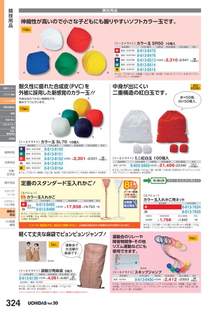 競技用品伸縮性が高いので小さな子どもにも握りやすいソフトカラー玉です。10個入白赤青緑黄耐久性に優れた合成皮(PVC)を外被に採用した新感覚のカラー玉!!黄中身は虫のつかない樹脂粒子を綿糸でつつんでいます。[トーエイライト]カラー玉SR5010個入商品種別型式/B3978Rお申込番号M価税抜税抜価格税込価格単位型式/B3978B型式/B3978W赤白青緑黄●寸法/70(径)mm●質量/50g(1個)●材質/外被:ポリエステル、中身:ポリエチレン・ポリスチレン●包装数:18-613-84758-613-84768-613-85138-613-85148-613-8515¥2,600¥2,310¥2,541型式/B3978G型式/B3978Y(10個入)1組中身が出にくい二重構造の紅白玉です。紅白各50個入赤×50個、白×50個入。10個入緑白赤青[トーエイライト]カラー玉SL7010個入商品種別お申込番号M価税抜税抜価格税込価格単位型式/B-6535R型式/B-6535B型式/B-6535G青緑赤白黄●寸法/70(径)mm●質量/60g1個)●材質/外被:合成皮革(PVC)、中身:綿糸、樹脂粒子●包装数:18-613-81508-613-81518-613-81528-613-81538-613-8154¥2,600¥2,301¥2,531型式/B-6535W型式/B-6535Y1組(10個入)[トーエイライト]ミニ紅白玉100個入商品種別型式/B3796お申込番号M価税抜税抜価格税込価格単位8-605-5905¥25,00¥21,400¥23,540(100個入)●寸法/60(径)mm●質量/約50g1個)●材質/外被:綿、充填物:粒(ポリエチレン)・わた1セット(ポリプロピレン)●収納袋付●包装数:1定番のスタンダード玉入れかご!取り替え用カラー玉入れかご用ネット[エバニュー]カラー玉入れかご商品種別お申込番号M価税抜税抜価格税込価格単位型式/EKA7698-613-84858-613-8486赤白●寸法/500(径)×1850〜2700高)mm、リング:430(径)mm、ベース:500(径)mm●質量/6kg●材質/本体:スチール、ネット:ナイロン●ネット付●お客様組立商品●包装数:1¥17,958¥19,7531台¥18,400沖縄・離島はサービス対象外※メーカー直送品です。返品はご容赦ください。上記商品は受注日から8営業日以内のお届けになります。赤白M価税抜¥2,000税抜価格¥1,766税込価格¥1,942単位1枚●寸法/100幅)×150奥)×40高)mm●質量/100g●材質/ナイロン●リング径430mm用●包装数:1[エバニュー]カラー玉入れかご用ネット商品種別お申込番号8-613-76248-613-7625競技用品学習ペーパークラフト・素材イベント用品学習支援用品保育安全・安心OA・サプライ用品文具・事務用品日用品装飾用品装飾用式典用品式典用品文集・文集・記念品記念品掲示用品掲示用品スタンプ・シールシールレクリエーレクリエーション用品運動会用品AV関連AV関連機器機器軽くて丈夫な麻袋でピョンピョンジャンプ!運動会で大活躍の麻袋です。5枚入使用例運動会のリレーや障害物競争・その他リズム運動などにも使用できます。6色入[トーエイライト]袋跳び用麻袋5枚入お申込番号M価税抜税抜価格税込価格8-613-8136¥4,500¥4,061¥4,467単位1組(5枚入)商品種別型式/B-3061●寸法/600(幅)×930(奥)mm●質量/670g1枚)●材質/麻100%●包装数:1/2※リサイクル品のため、サイズ・柄が変更となる場合や、ほつれ・補修跡がある場合があります。324Vol.20[トーエイライト]スキップジャンプ使用例商品種別型式/B2046お申込番号M価税抜8-613-8480¥2,500税抜価格¥2,412税込価格¥2,653(6色入)●寸法/全長:800mm、ボール:72(径)mm、リング:140(内径)mm●質量/80g1個)●材質/リング:ポリプロピレン、ロープ:PVC、ボール:ポリエチレン●色/6色入(赤、青、緑、紫、オレンジ、黄)●包装数:1単位1組