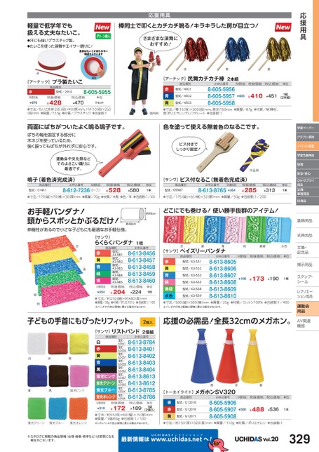 [アーテック]民舞カチカチ棒2本組商品種別型式/4931お申込番号M価税抜税抜価格税込価格型式/4932赤青黄●寸法/棒:15径)×300長)mm、房:約150mm●質量/87g●材質/柄:樺材、房:ポリエチレンテレフタレート●包装数:18-605-59568-605-59578-605-5958¥410型式/4933¥451¥6001組(2本組)応援用具単位応援用具棒同士で叩くとカチカチ鳴る!キラキラした房が目立つ!さまざまな演舞におすすめ!赤青黄軽量で低学年でも扱える丈夫なたいこ。●汗にも強いプラスチック製。●たいこを使った演舞やエイサー踊りに!赤[アーテック]プラ製たいこ赤M価税抜¥670商品種別型式/29108-605-5955税抜価格¥428税込価格¥470単位1セット●寸法/たいこ本体:205(径)×40厚)mm、バチ:10(径)×250(高)mm●質量/153g●材質/プラスチック●包装数:1使用例両面にばちがついたよく鳴る鳴子です。ばちの軸を固定する部分に木ネジを使っているため、強く振ってもばちが外れずに安心です。運動会や文化祭などでのよさこい踊りに最適です。色を塗って使える無着色のなるこです。ビス付きでしっかり固定!作品例鳴子(着色済完成済)商品種別型式/C-NK1お申込番号M価税抜8-612-7236オープン税抜価格¥528税込価格¥580単位1本[サンワ]ビス付なるこ(無着色完成済)商品種別型式/09987お申込番号M価税抜8-613-8765¥354税抜価格¥285税込価格¥313単位1本●寸法/170縦)×70(横)×30厚)mm●質量/70g●材質/木製●色/朱●包装数:1/40●寸法/175(縦)×65(横)×32(厚)mm●質量/50g●包装数:1/200お手軽バンダナ!頭からスポッとかぶるだけ!伸縮性があるので小さな子どもにも最適なお手軽仕様。どこにでも巻ける!使い勝手抜群のアイテム!赤黄青緑桃[サンワ]らくらくバンダナ1枚商品種別赤黄青緑桃M価税抜¥224型式/43-981型式/43-982型式/43-983型式/43-984型式/43-985税抜価格¥204お申込番号8-613-84568-613-84578-613-84588-613-84598-613-8460税込価格¥224単位1枚●寸法/約250(幅)×約480(長)mm●質量/30g●材質/ポリエステル●包装数:1/100※バンダナの色は現物と異なる場合があります。子どもの手首にもぴったりフィット。2個入リストバンド2個組[サンワ]白赤黄青黒蛍光ピンク商品種別白赤黄青黒蛍光ピンク蛍光グリーン蛍光ブルー蛍光オレンジ型式/63661型式/63-656型式/63-657型式/63-658型式/63-662型式/63-667型式/63-665型式/63664型式/63666税抜価格¥172M価税抜¥210お申込番号8-613-87848-613-84018-613-84028-613-84038-613-84048-613-86138-613-86128-613-87858-613-8786税込価格¥189単位1袋(2個入)蛍光グリーン蛍光ブルー蛍光オレンジ●寸法/約55(径)×60(幅)×15(厚)mm●質量/1個約8g●包装数:1/100※リストバンドの色は現物と異なる場合があります。[サンワ]ペイズリーバンダナ黄青赤桃黄緑水色商品種別お申込番号M価税抜税抜価格税込価格単位型式/63-553型式/63-552型式/63-551赤黄青桃黄緑水色●寸法/500(縦)×500(横)mm●質量/25g●材質/コットン100%●包装数:1/400※バンダナの色と模様は現物と異なる場合があります。8-613-86058-613-86068-613-86078-613-86088-613-86098-613-8610¥173型式/63-555型式/63-558型式/63-559¥190¥1981枚応援の必需品!全長32cmのメガホン。青赤黄[トーエイライト]メガホンSV320商品種別型式/G1201B型式/G1201R型式/G1201Y青赤黄お申込番号8-605-59068-605-59078-605-5908M価税抜税抜価格税込価格単位¥580¥488¥5361本●寸法/約150(径)×320(長)mm●質量/110g●材質/ポリエチレン●包装数:1学習ペーパークラフト・素材イベント用品学習支援用品保育安全・安心OA・サプライ用品文具・事務用品日用品装飾用品飾式典用品式典用品文集・文集・記念品記念品掲示用品掲示用品スタンプ・シールルレクリエーレクリエーション用品運動会用品AV関連関連機器機器※カタログに掲載の商品情報(仕様・価格・税率など)は変更になる場合がございます。最新情報はUCHIDASww.uchidas.netwへ!Vol.20329