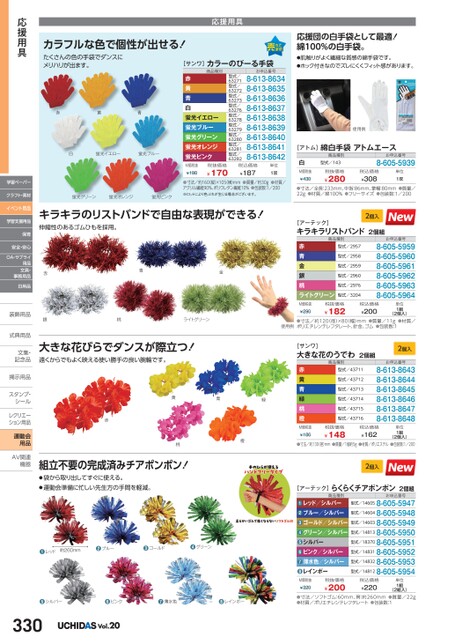 カラフルな色で個性が出せる!たくさんの色の手袋でダンスにメリハリが出ます。赤黄青白蛍光イエロー蛍光ブルー応援用具[サンワ]カラーのびーる手袋商品種別赤黄青白蛍光イエロー蛍光ブルー蛍光グリーン蛍光オレンジ蛍光ピンクお申込番号8-613-86348-613-86358-613-86368-613-86378-613-86388-613-86398-613-86408-613-86418-613-8642型式/63271型式/63272型式/63273型式/63276型式/63278型式/63279型式/63280型式/63281型式/63282M価税抜¥198税抜価格¥170税込価格¥187単位1双応援団の白手袋として最適!綿100%の白手袋。●肌触りがよく繊細な質感の綿手袋です。●ホック付きなのでズレにくくフィット感があります。使用例[アトム]綿白手袋アトムエース白M価税抜¥430商品種別型式/143税抜価格¥280お申込番号8-605-5939税込価格¥308単位1双●寸法/全長:233mm、中指:86mm、掌幅:80mm●質量/22g●材質/綿100%●フリーサイズ●包装数:1/200[アーテック]キラキラリストバンド2個組2個入商品種別赤青金銀桃ライトグリーン型式/2957型式/2958型式/2959型式/2960型式/2976型式/3204お申込番号8-605-59598-605-59608-605-59618-605-59628-605-59638-605-5964応援用具学習ペーパークラフト・素材イベント用品学習支援用品保育安全・安心OA・サプライ用品文具・事務用品日用品装飾用品装飾用式典用品式典用品文集・文集・記念品記念品掲示用品掲示用品スタンプ・シールシールレクリエーレクリエーション用品運動会用品AV関連AV関連機器機器赤銀桃ライトグリーンM価税抜¥290税抜価格¥182税込価格¥200単位1組(2個入)使用例●寸法/約120(径)×80(幅)mm●質量/11g●材質/ポリエチレンテレフタレート、針金、ゴム●包装数:1大きな花びらでダンスが際立つ!遠くからでもよく映える使い勝手の良い腕輪です。黄青緑赤赤黄青緑桃橙[サンワ]大きな花のうでわ2個組商品種別2個入お申込番号8-613-86438-613-86448-613-86458-613-86468-613-86478-613-8648型式/43711型式/43712型式/43713型式/43714型式/43715型式/43716桃橙M価税抜¥186税抜価格¥148税込価格¥162単位1組(2個入)●寸法/約130径)mm●質量/1個約5g●材質/ポリエステル●包装数:1/2002個入お申込番号型式/146058-605-5947型式/146048-605-5948型式/146038-605-5949型式/148138-605-5950型式/183708-605-5951型式/148318-605-5952型式/148328-605-5953型式/148128-605-5954商品種別レッド/シルバーブルー/シルバーゴールド/シルバーグリーン/シルバーシルバーピンク/シルバー薄水色/シルバーレインボー●●●●●●●❽[アーテック]らくらくチアポンポン2個組組立不要の完成済みチアポンポン!●袋から取り出してすぐに使える。●運動会準備に忙しい先生方の手間を軽減。●レッド約260mm●ブルー●ゴールド●グリーン●シルバー●ピンク●薄水色●レインボー330Vol.20M価税抜¥320税抜価格¥200税込価格¥220単位1組(2組入)●寸法/ソフトゴム:60mm、房:約260mm●質量/22g●材質/ポリエチレンテレフタレート●包装数:1蛍光グリーン蛍光オレンジ蛍光ピンク●寸法/約160(縦)×105横)mm●質量/約30g●材質/アクリル繊維90%、ポリウレタン繊維10%●包装数:1/200※ロットにより色ぶれが生じる場合がございます。キラキラのリストバンドで自由な表現ができる!伸縮性のあるゴムひもを採用。青金