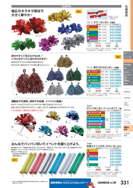 応援用具※色味にバラつきがある場合があります。ご了承ください。幅広のキラキラ素材で大きく華やか!応援用具2個入学習ペーパークラフト・素材イベント用品学習支援用品保育安全・安心OA・サプライ用品文具・事務用品日用品装飾用品飾式典用品式典用品文集・文集・記念品記念品掲示用品掲示用品スタンプ・シールルレクリエーレクリエーション用品運動会用品AV関連関連機器機器[サンワ]チアーポンポン2個組商品種別赤金青緑桃銀型式/43-991型式/43-992型式/43-993型式/43-994型式/43-995型式/43-996お申込番号8-613-83958-613-83968-613-83978-613-83988-613-83998-613-8400M価税抜¥253税抜価格¥215税込価格¥236単位1袋(2個入)●寸法/約300幅)×50奥)×15(高)mm●質量/1個約15g●材質/PET●包装数:1/10/2002個入商品種別赤/シルバー金/シルバー青/シルバー緑/シルバー銀水色/シルバー型式/44450型式/44451型式/44452型式/44453型式/44455型式/44456お申込番号8-613-86668-613-86678-613-86688-613-86698-613-86708-613-8671価税抜¥262税抜価格¥210税込価格¥231単位1組(2個入)●寸法/全長約270mm●質量/1個約20g●材質/PET、持ち手:ゴム●包装数:1/100●●●●●●M[サンワ]新キラキラポンポン2個組[KBS]グリップポンポン・ツートンタイプ1個お申込番号8-613-82878-613-82888-613-82898-613-82908-613-82918-613-8292型式/GP25商品種別赤×ホログラム銀金×ホログラム銀青×ホログラム銀水色×ホログラム銀桃×ホログラム銀緑×ホログラム銀●●●●●●金約300mm青桃銀赤緑持ちやすくて手ぶらでもOK!いろんなダンスに合わせられます!●持ち手がゴムだから両手が自由に使える!●やわらかい素材だからつけた時に痛くなりにくい!●運動会での演技、団体での応援、イベントに最適!●カラーとホログラムのフィルムがキラキラ輝く元気なポンポンです。●取っ手付きで持ちやすくボリューム感たっぷりで、会場を華やかに彩るポンポンです!※この商品は、1個単位のご提供になります。●●●●●約270mm●●●約230mm●●●M価税抜オープン税抜価格¥220税込価格¥242単位1個●寸法/ポンポン部:約230直径)×200(長)mm、持ち手:80mm●質量/約20g●材質/持ち手:プラスチック、メッキテープ:PET●完成済(OP袋入)●包装数:1みんなでバンバン叩いてイベントを盛り上げよう。●付属のストローで簡単に膨らますことができます。●両手で一本ずつ持って叩くと高い金属音がでます。●表面コーティングされていますので、水や汗で色落ちしません。●ストローを差し込んで空気を抜けば何度でも使用可能です。2本入金赤銀青白緑※カタログに掲載の商品情報(仕様・価格・税率など)は変更になる場合がございます。最新情報はUCHIDASww.uchidas.netw金赤銀青白緑型式/OSDXお申込番号8-613-82938-613-82948-613-82958-613-82968-613-82978-613-8298[KBS]応援スティックDXストロー付2本入商品種別M価税抜オープン税抜価格¥260税込価格¥286単位1セット(2本入)●寸法/膨らませ最大サイズ:約65(径)×580(長)mm●質量/20g●材質/アルミ蒸着ナイロン●付属品/ストロー●包装数:1※膨らませ過ぎにはご注意ください。ヘリウムを注入しても浮きません。へ!Vol.20331