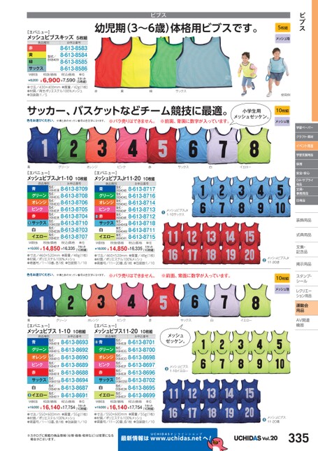 ビブス5枚組メッシュ地ビブス幼児期(3〜6歳)体格用ビブスです。[エバニュー]メッシュビブスキッズ5枚組商品種別赤黄緑サックス型式/EKB409お申込番号8-613-85838-613-85848-613-85858-613-8586M価税抜¥8,200税抜価格税込価格単位¥6,900¥7,590(5枚組)●寸法/430×400mm●質量/42g1枚)●材質/再生ポリエステル100%メッシュ●包装数:1/51セット赤黄緑サックスサッカー、バスケットなどチーム競技に最適。色をお選びください。※青と赤のゼッケン番号は白文字になります。※バラ売りはできません。※前面、背面に数字が入っています。小学生用メッシュゼッケン。使用例10枚組メッシュ地学習ペーパークラフト・素材イベント用品学習支援用品保育安全・安心OA・サプライ用品文具・事務用品日用品装飾用品飾式典用品式典用品文集・文集・記念品記念品掲示用品掲示用品スタンプ・シールルレクリエーレクリエーション用品運動会用品AV関連関連機器機器❷メッシュビブスJr11-20赤10枚組メッシュ地青グリーンオレンジピンク赤サックス白イエロー[エバニュー]メッシュビブスJr1-1010枚組[エバニュー]メッシュビブスJr11-2010枚組商品種別お申込番号型式/型式/EKB403B型式/青グリーンオレンジピンク赤サックス白イエロー型式/8-613-8709EKB403G8-613-8708EKB403O8-613-87068-613-87058-613-8704EKB403SB8-613-8710EKB403W8-613-87038-613-8707型式/EKB403P型式/EKB403R型式/型式/EKB403Y●商品種別お申込番号型式/型式/EKB404B型式/青グリーンオレンジピンク赤サックス白イエロー型式/8-613-8717EKB404G8-613-8716EKB404O8-613-87148-613-87138-613-8712EKB404SB8-613-8718EKB404W8-613-87118-613-8715型式/EKB404P型式/EKB404R型式/型式/EKB404Y●M価税抜税抜価格税込価格¥18,000¥14,850¥16,335(10枚組)●寸法/460×520mm●質量/48g(1枚)●材質/ポリエステル100%メッシュ●背番号/1〜10番、各1枚●包装数:1/10単位1セットM価税抜税抜価格税込価格¥18,000¥14,850¥16,335(10枚組)●寸法/460×520mm●質量/48g1枚)●材質/ポリエステル100%メッシュ●背番号/11〜20番、各1枚●包装数:1/10単位1セット❶メッシュビブスJr1-10サックス色をお選びください。※青と赤のゼッケン番号は白文字になります。※バラ売りはできません。※前面、背面に数字が入っています。青グリーンオレンジピンク赤サックス白イエロー[エバニュー]メッシュビブス1-1010枚組[エバニュー]メッシュビブス11-2010枚組商品種別お申込番号型式/型式/EKB401B型式/青グリーンオレンジピンク赤サックス白イエロー型式/8-613-8693EKB401G8-613-8692EKB401O8-613-86908-613-86898-613-8688EKB401SB8-613-8694EKB401W8-613-86878-613-8691型式/EKB401P型式/EKB401R型式/型式/EKB401Y●●商品種別お申込番号型式/型式/EKB402B型式/青グリーンオレンジピンク赤サックス白イエロー型式/8-613-8701EKB402G8-613-8700EKB402O8-613-86988-613-86978-613-8696EKB402SB8-613-8702EKB402W8-613-86958-613-8699型式/EKB402P型式/EKB402R型式/型式/EKB402Yメッシュゼッケン。❸メッシュビブス1-10イエローM価税抜税抜価格税込価格¥19,000¥16,140¥17,754単位1セット(10枚組)M価税抜税抜価格税込価格¥19,000¥16,140¥17,754単位1セット(10枚組)●寸法/550×600mm●質量/55g(1枚)●材質/ポリエステル100%メッシュ●背番号/1〜10番、各1枚●包装数:1/10●寸法/550×600mm●質量/55g1枚)●材質/ポリエステル100%メッシュ●背番号/11〜20番、各1枚●包装数:1/10※カタログに掲載の商品情報(仕様・価格・税率など)は変更になる場合がございます。最新情報はUCHIDASww.uchidas.netwへ!❹メッシュビブス11-20青Vol.20335