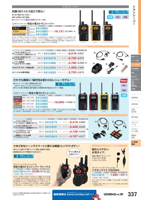 トランシーバー学習ペーパークラフト・素材イベント用品学習支援用品保育安全・安心OA・サプライ用品文具・事務用品日用品装飾用品飾式典用品式典用品文集・文集・記念品記念品掲示用品掲示用品スタンプ・シールルレクリエーレクリエーション用品運動会動用品品AV関連機器商品種別●●イヤホン付きクリップマイクロホン(耳掛けタイプ)EMC-14イヤホン付きクリップマイクロホンツイン充電台(ACアダプター別売)EMC-13●[JVCケンウッド]UBZ-M31関連別売品お申込番号包装数M価税抜税抜価格税込価格単位8-612-86951/20オープン¥6,216¥6,8378-612-87761オープン¥5,702¥6,272UBC-9CR8-612-86961/10オープン¥5,780¥6,3581個●ACアダプター(充電台用)UBC-7SL8-612-85241/40オープン¥1,493¥1,642●ニッケル水素充電池UPB-7N8-612-85221/10オープン¥2,703¥2,973だれでも簡単に!操作性は変わらないニューモデル!●トランシーバー同士で直接交信できる20チャンネル(シンプレックス)モデル。通信距離市街地見通良い郊外約1000m〜2000m約100m〜200m●アルカリ単三乾電池3個で最長100時間利用可能なECOモード搭載。[JVCケンウッド]特定小電力トランシーバー商品種別お申込番号M価税抜税抜価格税込価格単位型式/UBZ-LU20B型式/UBZ-LU20RDブラックレッドイエローブルーグレー●寸法/55.5(幅)×26.1(奥)×104.2高)mm(突起部を除く)●質量/180g別売アルカリ単三乾電池×3個含む)●周波数範囲/400MHz帯●付属品/ベルトクリップ●包装数:18-612-89228-612-89238-612-89248-612-8925オープン¥16,000¥17,6001台型式/UBZ-LU20H型式/UBZ-LU20Y●●●●●防水防塵抗菌抗菌・抗ウイルス加工で安心!トランシーバー●小型!軽量!雨にも強い!●単三乾電池1個で駆動。●バッテリーライフ:最長29時間(ECOモード時)。[JVCケンウッド]特定小電力トランシーバー商品種別お申込番号M価税抜税抜価格税込価格単位型式/UBZ-M31EB型式/UBZ-M31EY型式/UBZ-M31EGブラックイエローシャンパンゴールド●寸法/47幅)×22奥)×79.9(高)mm(突起部を除く)●質量/110g別売アルカリ乾電池×1個含む・ベルトフックなし)●チャンネル数/47ch交互通話モード20ch+中継器アクセスモード27ch)●使用周波数帯域/400MHz●付属品/ベルトフック・保証書・取扱説明書●対応電池/充電池UPB-7Nオープン¥19,131¥21,0441台8-612-88248-612-88258-612-8826(別売品)、単三アルカリ乾電池、単三eneloop、充電式EVOLTA●包装数:1通信距離市街地見通良い郊外約1000m〜2000m約100m〜200m抗菌防水防塵ブラックイエローシャンパンゴールドブラックレッドイエローブルーグレー商品種別●●●イヤホン付きクリップマイクロホン(耳掛けタイプ)EMC-12イヤホン付きクリップマイクロホン(高強度タイプ)EMC-11シングルチャージャー(ACアダプター付)充電式ニッケル水素バッテリーパックUPB-5NUBC-10●[JVCケンウッド]UBZ-LS20関連別売品お申込番号包装数M価税抜税抜価格税込価格単位8-612-87758-612-87978-612-8774111オープン¥5,419¥5,960オープン¥5,458¥6,003オープン¥4,120¥4,5321個8-612-84141/10オープン¥4,107¥4,517●●●●さまざまなシーンでスマートに使える軽量コンパクトボディ!●かんたん操作で行事やイベント運営、連絡用に最適。●乾電池式なので停電時でも使えます。通信距離市街地見通良い郊外約1000m〜2000m約100m〜200mすぐに使える2台セット!ヴィーナス関連別売品聞きとりやすい片耳タイプ。特定小電力トランシーバー(T20-162Y-2P)用イヤホンマイクです。[アンドーインターナショナル]特定小電力トランシーバーヴィーナスお申込番号M価税抜税抜価格税込価格8-612-8815¥20,000¥18,300¥20,130単位1セット(2台入)商品種別型式/T20-162Y-2P●寸法/49(幅)×39奥)×128(高)mm●質量/66g●材質/ABS樹脂●使用周波数/400MHz帯●通信方式/交互通信●電波型式/F3E●連続待受時間/約70時間(アルカリ乾電池使用時)●LEDライト搭載●送信出力/10mW●チャンネル数/20ch●充電用MicroUSB-B端子●電源/単四乾電池×3個(別売/1台分)●付属品/ベルトクリップ●包装数:1※カタログに掲載の商品情報(仕様・価格・税率など)は変更になる場合がございます。最新情報は[アンドーインターナショナル]イヤホンマイクO20264お申込番号M価税抜税抜価格税込価格単位8-612-8818オープン¥1,680¥1,8481個商品種別型式/O20264●コード長/約130cm●質量/23g●材質/ABS樹脂●包装数:1※他の製品に使用した場合、本イヤホンマイクまたは接続した製品が故障する場合があります。へ!Vol.20337UCHIDASww.uchidas.netw
