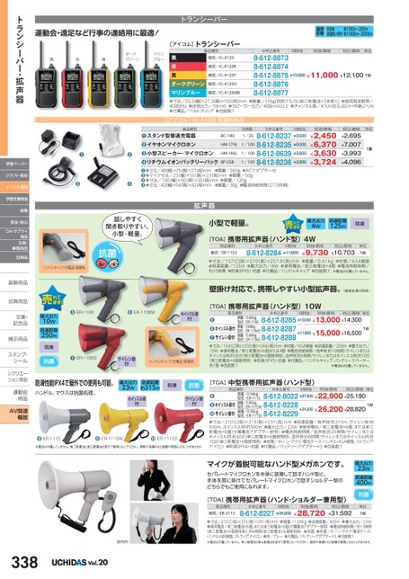 運動会・遠足など行事の連絡用に最適!黒赤黄ダークグリーンマリンブルートランシーバー通信距離市街地見通良い郊外約1000m〜2000m約100m〜200m[アイコム]トランシーバー商品種別お申込番号M価税抜税抜価格税込価格単位型式/IC-4120型式/IC-4120R型式/IC-4120Y黒赤黄ダークグリーンマリンブルー●寸法/55.5幅)×27.3奥)×105高)mm●質量/116g(別売アルカリ単三乾電池×3本除く)●使用周波数帯/400MHz●送信出力/10mW●スピーカー出力/400mW以上●チャンネル数/47ch交互20ch+中継27ch)●付属品/ベルトクリップ●包装数:18-612-88738-612-88748-612-88758-612-88768-612-8877¥15,800¥11,000¥12,1001台型式/IC-4120MB型式/IC-4120G包装数1/251/1001/1001/100お申込番号8-612-82378-612-82358-612-86398-612-8236M価税抜¥2,500¥6,500¥3,800¥3,800税抜価格¥2,450¥6,370¥3,630¥3,724税込価格¥2,695¥7,007¥3,993¥4,096単位1個商品種別BC-180スタンド型普通充電器イヤホンマイクロホン小型スピーカー・マイクロホンリチウムイオンバッテリーパックBP-258HM-179LHM-186L●●●●[アイコム]IC-4120関連別売品❶●寸法/48(幅)×75(奥)×77高)mm●質量/260g●ACアダプター付❷●マイク寸法/23(幅)×55(奥)×23(高)mm●質量/50g❸●寸法/100幅)×50奥)×30高)mm●質量/120g❹●寸法/42(幅)×56(奥)×42高)mm●質量/30g●電池持続時間(27.5時間)●●●●話しやすく聞き取りやすい。小型・軽量。抗菌ハンドルキャップ(付属品)装着時。拡声器小型で軽量。最大出力4W到達距離125m防滴[TOA]携帯用拡声器(ハンド型)4W商品種別型式/ER-1103お申込番号M価税抜8-612-8284¥11,600税抜価格¥9,730税込価格¥10,703単位1台●寸法/137(口径)×210(長)×257.8(高)mm●質量/0.61kg●材質/ASA樹脂●到達距離/125m●最大出力/4W●使用電池/単三乾電池×4個●電池持続時間/約10時間●防滴(IPX5)抗菌●付属品/ハンドルキャップ●包装数:1※電池は付属していません。壁掛け対応で、携帯しやすい小型拡声器。(壁掛金具は別売)商品種別お申込番号M価税抜税抜価格税込価格8-612-8285¥15,500¥13,000¥14,300¥17,900¥15,000¥16,500単位1台質量/0.66kg、型式/ER-1106質量/0.68kg、型式/ER-1106W8-612-8287型式/ER-1106S8-612-8288質量/0.68kg、ホイッスル音付サイレン音付●●●[TOA]携帯用拡声器(ハンド型)10W●ER-1106●ER-1106Wホイッスル音付●ER-1106Sサイレン音付ハンドルキャップ(付属品)装着時。●寸法/154口径)×250長)×266(高)mm●材質/ASA樹脂●到達距離/250m●最大出力/10W●使用電池/単三乾電池×6個または4個●電池持続時間/音声時:約10時間/サイレンまたはホイッスル時:約30分(単三乾電池×6個使用時)、音声時:約6時間/サイレンまたはホイッスル時:約10分(単三乾電池×4個使用時)●防滴(IPX5)・抗菌●付属品/ハンドルキャップ、バッテリースペーサー各1個●包装数:1※電池は付属していません。最大出力10W到達距離250m防滴抗菌商品種別お申込番号M価税抜税抜価格税込価格8-612-8022¥27,300¥22,900¥25,190¥31,200¥26,200¥28,820単位1台質量/0.94kg、型式/ER-1115質量/0.95kg、型式/ER-1115W8-612-8228型式/ER-1115S8-612-8229質量/0.95kg、ホイッスル音付サイレン音付●●●[TOA]中型携帯用拡声器(ハンド型)防滴性能IPX4で屋外での使用も可能。ハンドル、マウスは抗菌処理。最大出力23W到達距離約315m防滴抗菌ホイッスル音付サイレン音付●ER-1115●ER-1115W●ER-1115S※電池は付属していません。単二乾電池と単三乾電池を混ぜて使用しないでください。発熱や液漏れなど故障の原因になることがあります。●寸法/210(口径)×319(長)×291(高)mm●到達距離/音声時:約315m、サイレン時:約500m、ホイッスル時:約500m●最大出力/23W●使用電池/単二乾電池×6個、または単三乾電池×6個(付属電池アダプター使用)●電池持続時間/音声時:約20時間/サイレンまたはホイッスル時:約40分(単二乾電池×6個使用時)、音声時:約6時間/サイレンまたはホイッスル時:約10分(単三乾電池×6個使用時)●材質/ホーン・マウス・電池ケース・ハンドル:ASA樹脂、ストラップ:ナイロン●防滴(IPX4)・抗菌●付属品/バッテリーアダプター×3●包装数:1トランシーバー・拡声器学習ペーパークラフト・素材イベント用品学習支援用品保育安全・安心OA・サプライ用品文具・事務用品日用品装飾用品装飾用式典用品式典用品文集・文集・記念品記念品掲示用品掲示用品スタンプ・シールシールレクリエーレクリエーション用品運動会運動会用品用品AV関連機器マイクが着脱可能なハンド型メガホンです。セパレートマイクロホンを本体に装着して話すハンド型と、本体を肩に掛けてセパレートマイクロホンで話すショルダー型のどちらでもご使用になれます。[TOA]携帯用拡声器(ハンド・ショルダー兼用型)商品種別型式/ER-3115お申込番号M価税抜8-612-8227¥34,200税抜価格¥28,720税込価格¥31,592最大出力23W到達距離400m抗菌単位1台338使用例Vol.20●寸法/210(口径)×355(長)×291(高)mm●質量/1.09kg●到達距離/400m●最大出力/23W●使用電池/単二乾電池×6個、または単三乾電池×6個(付属電池アダプター使用)●電池持続時間/約13時間(単二乾電池×6個使用時)、約4時間(単三乾電池×6個使用時)●抗菌●材質/ホーン・マイク・電池ケース・ハンドル:ABS樹脂、ストラップ:ナイロン●色/グレー●付
