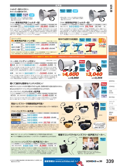 拡声器学習ペーパークラフト・素材イベント用品学習支援用品保育安全・安心OA・サプライ用品文具・事務用品日用品装飾用品飾式典用品式典用品文集・文集・記念品記念品掲示用品掲示用品スタンプ・シールルレクリエーレクリエーション用品運動会動用品品AV関連機器ショルダー型のメガホン、ホイッスル音付きです。最大出力ホイッスル音23W到達距離400m付抗菌※電池は付属していません。単二乾電池と単三乾電池を混ぜて使用しないでください。発熱や液漏れなど故障の原因になることがあります。拡声器最大出力23W到達距離400m抗菌※電池は付属していません。単二乾電池と単三乾電池を混ぜて使用しないでください。発熱や液漏れなど故障の原因になることがあります。[TOA]携帯用拡声器(ショルダー型)商品種別お申込番号M価税抜税抜価格税込価格型式/ER-2115W8-612-8226¥36,800ホイッスル音付●寸法/210(口径)×310(長)mm●質量/1.06kg●到達距離/音声時:400m、ホイッスル時:500m●最大出力/23W●使用電池/単二乾電池×6個、または単三乾電池×6個(付属電池アダプター使用)●電池持続時間/約13時間(単二乾電池×6個使用時)、約4時間(単三乾電池×6個使用時)●抗菌●材質/ホーン・マイク・電池ケース・ハンドル:ABS樹脂、ストラップ:ナイロン●色/グレー●付属品/バッテリーアダプター×3●包装数:1¥30,800¥33,880単位1台[TOA]携帯用拡声器(ショルダー型)商品種別型式/ER-2115お申込番号M価税抜8-612-8023¥34,700税抜価格29,764税込価格32,740単位1台●寸法/210(口径)×310(長)mm●質量/1.05kg●到達距離/400m●最大出力/23W●使用電池/単二乾電池×6個、または単三乾電池×6個(付属電池アダプター使用)●電池持続時間/約13時間(単二乾電池×6個使用時)、約4時間(単三乾電池×6個使用時)●抗菌●材質/ホーン・マイク・電池ケース・ハンドル:ABS樹脂、ストラップ:ナイロン●色/グレー●付属品/バッテリーアダプター×3●包装数:1●TR-315●TR-315Wホイッスル音付●TR-315Sサイレン音付沖縄・離島はサービス対象外商品種別お申込番号M価税抜税抜価格税込価格単位型式/TR-315型式/TR-315W型式/TR-315S8-612-8281¥27,0008-612-82828-612-8283¥31,500ホイッスル音付サイレン音付●●●寸法/208(口径)×320(長)mm●質量/1.1kg●到達距離/315m●最大出力/20W●使用電池/単二乾電池×6個(別売)●防塵・防滴(IP54)●包装数:11台¥22,640¥24,904¥26,400¥29,040●[ユニペックス]携帯用拡声器(ハンド型)※電池は付属していません。雨の中でも使用できる防滴設計。最大出力20W到達距離315m防塵・防滴※メーカー直送品です。返品はご容赦ください。上記商品は受注日から8営業日以内のお届けになります。[オーム電機]ハンディーメガホン※電池は付属していません。商品種別型式/XB-11SF-B8-605-8140オープン¥4,600¥5,060お申込番号M価税抜税抜価格税込価格●大単位1台●寸法/約198(幅)×325(奥)×265(高)mm●口径/198mm●ハンド部の折りたたみ可●材質/ABS樹脂●質量/約790g乾電池除く)●最大出力/25W●電源/単一乾電池×6個(別売)●到達距離/約200m●電池持続時間/約12時間(アルカリ電池使用時)●警報アラーム付●包装数:1中型式/BMX-1108-612-8217オープン¥3,040¥3,344●●寸法/160(幅)×250奥)×220高)mm●口径/約155mm●ハンド部の折りたたみ可●材質/ABS樹脂●質量/560g●最大出力/5W●電源/単二乾電池×4個(別売)●到達距離/約100m●電池持続時間/約6時間(アルカリ乾電池使用時)●警報アラーム付●包装数:1/101台●大1台税抜¥4,600税込¥5,060軽くて操作も簡単なハンドメガホン!●握りやすいスリムなハンドル形状で重量わずか約316gと軽く、長時間の使用でも話者に負担をかけません。●Bluetooth対応でスマートフォン・iPhoneからの音楽再生をすることができます。[サンワサプライ]ハンドメガホン拡声器商品種別お申込番号M価税抜税抜価格税込価格型式/MM-SPAMP138-605-8134ホワイト●寸法(ハンドル折りたたみ時)/約132幅)×149(奥)×206(高)mm●質量/約316g●材質/ABS樹脂●実用最大出力/5.3W●到達距離/最大約120m●電源/内蔵リチウムイオン電池(3.7V1500mAh)●収納ポーチ付、USB充電ケーブル(約50cm)、ストラップ●包装数:1/16¥6,400¥5,480¥6,028単位1個完全ハンズフリーで明瞭音質拡声可能!腰にぴったり装着することができ、付属のヘッドセットマイクロホンを使用すると完全ハンズフリーで使用可能です。[TOA]ハンズフリー拡声器商品種別お申込番号M価税抜税抜価格税込価格単位型式/ER-1000A-BK型式/8-612-8803ER-1000A-WH8-612-88048-612-88058-612-8806ブラックホワイトイエローブルートゥース機能付●寸法/133幅)×222奥)×96高)mm●質量/530g●電源/単三乾電池×6個●最大出力/10W●電池持続時間/音声:約8時間(アルカリ乾電池6個または4個使用時)●ウエストベルト長/55〜120cm(最大伸長時)●通達距離/約100m●付属品/ヘッドセットマイク(ヘッドバンド、ウインドスクリーン付)×¥31,900¥26,800¥29,480¥39,700¥33,750¥37,125型式/ER-1000A-YL型式/ER-1000A-BT1、ウエストベルト(本体に装着済み)×1、バッテリースペーサー×2、マイクケーブルグリップ×1●包装数:11台ホワイトブルートゥース機能付ブラックイエロー最大出力25W到達距離約200m最