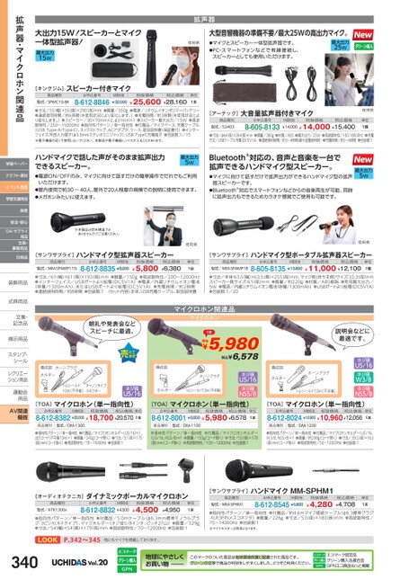 拡声器大出力15W!スピーカーとマイク一体型拡声器!最大出力15W[キングジム]スピーカー付きマイク商品種別型式/SPMC10-BKお申込番号8-612-8846M価税抜¥32,000税抜価格税込価格¥25,600¥28,160使用例●マイクとスピーカー一体型拡声器です。●PC・スマートフォンなどで有線接続し、スピーカーとしても使用いただけます。単位1本大型音響機器の準備不要!最大25Wの高出力マイク。最大出力25W●寸法/55(幅)×55(奥)×290高)mm●質量/350g●電源/リチウムイオンポリマーバッテリー●連続使用時間/約6時間(※使用状況により変化します。)●充電時間/約3時間(※使用状況により変化します。)●スピーカー/30×70mm×2、φ31mm×1●スピーカー最大出力/15W●周波数特性/250〜15000Hz●指向性パターン/単一指向性●付属品/マイクベース、充電ケーブル(USBType-A/Type-C)、ネックストラップ、ACアダプタ、ケース、取扱説明書(保証書付)●インターフェイス:外部入力端子(φ3.5mmステレオミニジャック)、USBTypeC充電端子●包装数:1/15※電子機器の近くで使用しないでください。本製品や電子機器にノイズが入ることがあります。[アーテック]大音量拡声器付きマイク商品種別型式/52403お申込番号8-605-8133M価税抜税抜価格¥14,000¥14,000¥15,400税込価格使用例単位1個●寸法/φ64径)×284長)mm●質量/380g●材質/ABS●最大出力/25W●周波数特性/100-18000Hz●充電方式/USBケーブル充電(DC5V1A)●連続使用時間/約3〜4時間(最大音量使用時)●充電時間/約5〜6時間●包装数:1ハンドマイクで話した声がそのまま拡声出力できるスピーカー。●電源ON/OFFのみ、マイクに向けて話すだけの簡単操作でだれでもご利用最大出力5WBluetooth®対応の、音声と音楽を一台で拡声できるハンドマイク型スピーカー。●マイクに向けて話すだけで拡声出力ができるハンドマイク型の拡声いただけます。器スピーカーです。●屋内使用で約30〜40人、屋外で20人程度の規模での説明に使用できます。●メガホンみたいに使えます。●Bluetooth®対応でスマートフォンなどからの音楽再生が可能、同時に拡声出力もできるためカラオケ感覚でご使用も可能です。※本製品は防水構造ではありませんのでご注意ください。[サンワサプライ]ハンドマイク型拡声器スピーカー商品種別型式/MM-SPAMP11Nお申込番号M価税抜8-612-8835¥8,200税抜価格¥5,800税込価格¥6,380使用例単位1台[サンワサプライ]商品種別型式/MM-SPAMP18ハンドマイク型ポータブル拡声器スピーカーお申込番号8-605-8135¥13,800¥11,000¥12,100M価税抜税抜価格税込価格単位1個●寸法/61幅)×61(奥)×193(高)mm●質量/150g●周波数特性/200〜12000Hz●インターフェイス/USBポートより給電(DC5V1A)●電源/内蔵リチウムイオン電池(容量/1300mAh)、またはUSBポートより給電(DC5V1A)●充電時間/約2時間●連続使用時間/約8時間●包装数:1〈セット内容〉本体、USB充電ケーブル、取扱説明書●寸法/本体:63.5幅)×63.5(奥)×255高)mm、マイク側(持ち手側)サイズ:32.3径)mmスピーカー側サイズ:61(径)mm●質量/約220g●材質/ABS樹脂●実用最大出力/5W●電源/内蔵リチウムイオン電池(容量/1300mAh)●USBポートより給電(DC5V1A)●包装数:1/20拡声器・マイクロホン関連品学習ペーパークラフト・素材イベント用品学習支援用品保育安全・安心OA・サプライ用品文具・事務用品日用品装飾用品装飾用式典用品式典用品文集・文集・記念品記念品掲示用品掲示用品スタンプ・シールシールレクリエーレクリエーション用品運動会運動会用品用品AV関連機器最大出力5W使用例説明会などに最適です。ネジ径U5/16ネジ径W3/8ネジ径NS5/8朝礼や発表会などスピーチに最適。マイクロホン関連品マイクロホン1本税抜¥5,980税込¥6,578ホーンプラグ構成図ホルダー1心シールド10m(不平衡)キャノンタイプコネクター構成図ホーンプラグホルダー1心シールド7.5m(不平衡)構成図ホルダーホーンプラグ1心シールド10m(不平衡)ネジ径U5/16ネジ径NS5/8ネジ径U5/16[TOA]マイクロホン(単一指向性)お申込番号M価税抜税抜価格税込価格単位8-612-8382¥22,000¥18,700¥20,5701本[TOA]マイクロホン(単一指向性)お申込番号M価税抜税抜価格税込価格単位8-612-8001¥6,850¥5,980¥6,5781本[TOA]マイクロホン(単一指向性)お申込番号M価税抜税抜価格税込価格8-612-8024¥12,900¥10,960¥12,056単位1本商品種別型式/DM-1300商品種別型式/DM-1100商品種別型式/DM-1200●指向性パターン/単一指向性●付属品/マイクロホンホルダー(U5/16)×1、出力コード(不平衡10m)×1●質量/245gコード除く)●寸法/51(径)×170(長)mm(コード除く)●周波数特性/70〜15000Hz●包装数:1●指向性パターン/単一指向性●付属品/マイクロホンホルダー(U5/16、NS5/8)×1●質量/155gコード除く)●寸法/55(径)×178(長)mm(コード除く)●周波数特性/100〜12000Hz●包装数:1●指向性パターン/単一指向性●付属品/マイクロホンホルダー(U5/16、W3/8、NS5/8)×1●質量/約298g(コード除く)●寸法/39.5径)×163(長)mm(コード除く)●周波数特性/50〜12000Hz●包装数:1[オーディオテクニカ]ダイナミックボーカルマイクロホン商品種別型式/ATR1300xお申込番号M価税抜8-612-8832¥4,500税抜価格¥4,500税込価格¥4,950単位1本●指向性パターン/単