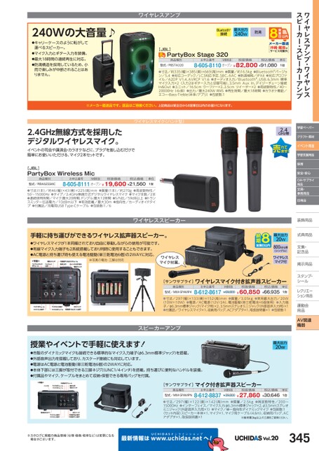 ワイヤレスアンプ・ワイヤレススピーカー・スピーカーアンプ学習ペーパークラフト・素材イベント用品学習支援用品保育安全・安心OA・サプライ用品文具・事務用品日用品装飾用品飾式典用品式典用品文集・文集・記念品記念品掲示用品掲示用品スタンプ・シールルレクリエーレクリエーション用品運動会動用品品AV関連機器240Wの大音量♪●キャリーケースのように転がして運べるスピーカー。●マイク入力とギター入力を装備。●最大18時間の連続再生に対応。●防滴構造を採用しているため、小雨で楽しみが中断されることはありません。ワイヤレスアンプBluetooth®接続最大出力240W防滴沖縄・離島はサービス対象外[JBL]PartyBoxStage320商品種別型式/PBSTA320お申込番号M価税抜税抜価格8-605-8110オープン¥82,800¥91,080税込価格単位1台●寸法/約335幅)×385(奥)×669(高)mm●質量/約16.5kg●BluetoothⓇバージョン/5.4●対応コーデック/LC3対応予定、SBC、AAC●防滴規格/IPX4●対応プロファイル/A2DPV1.4、AVRCPV1.6●オーディオ入力/BluetoothⓇ、USB、6.3mm標準マイク入力×2(入力2はギター入力と切替可能)、3.5mmAuxIn、デイジーチェーン接続In&Out●ユニット/16.5cmウーファー×2、2.5cmツイーター×2●周波数特性/40〜20000Hz(-6dB)●出力/最大240WRMS●再生時間/最大18時間●カラオケ機能/エコー・Bass・Treble本体/アプリ)●包装数:1※メーカー直送品です。返品はご容赦ください。上記商品は受注日から8営業日以内のお届けになります。ワイヤレスマイク(ハンド型)2.4GHz無線方式を採用したデジタルワイヤレスマイク。イベントの司会や講演会・カラオケなどに、プラグを差し込むだけで簡単にお使いいただける、マイク2本セットです。[JBL]PartyBoxWirelessMic商品種別型式/PBWLESSMCお申込番号M価税抜税抜価格8-605-8111オープン¥19,600¥21,560税込価格単位1台●寸法(1本)/約46(幅)×43奥)×225(高)mm●質量(1本)/約270g●周波数特性/50〜15000Hz●タイプ/2.4GHz無線方式デジタルワイヤレスマイク●マイク本数/2本●連続使用時間/マイク:最大20時間、ドングル:最大12時間●S/N比/59dB以上●トランスミッター伝送電力/10dBm以下●有効距離/最大30m●指向性/カーディオイドタイプ●付属品/充電用USBType-Cケーブル●包装数:1/6手軽に持ち運びができるワイヤレス拡声器スピーカー。ワイヤレススピーカー●ワイヤレスマイクが1本同梱されており自由に移動しながらの使用が可能です。●有線マイク入力端子も2系統搭載しており同時に使用することもできます。●AC電源と持ち運び時も使える電池駆動(単三乾電池6個)の2WAYに対応。※写真の電池・三脚は別売ワイヤレスマイク付属。2.4GHz帯最大出力20W800MHz帯(シングル)ワイヤレスマイク付[サンワサプライ]ワイヤレスマイク付き拡声器スピーカー商品種別型式/MM-SPAMP4お申込番号8-612-8617M価税抜¥69,800税抜価格¥60,850税込価格¥66,935単位1台●寸法/297(幅)×133(奥)×152(高)mm●質量/3.05kg●実用最大出力/20W(10W+10W)●電源/AC電源(12V/2A)、電池駆動(単三乾電池×6個使用)●入力端子/φ6.3mm標準ジャック(マイク用)×2、3.5mmステレオミニジャック(外部音声入力用)×1●付属品/ワイヤレスマイク×1、収納用バッグ、ACアダプタ×1、取扱説明書×1●包装数:1スピーカーアンプ授業やイベントで手軽に使えます!●市販のダイナミックマイクも接続できる標準的なマイク入力端子(φ6.3mm標準ジャック)を搭載。●外部音声出力を搭載しており、カスケード接続にも対応しています。●電源はAC電源と電池駆動(単三乾電池6個)の2WAYに対応。●本体下部には三脚が取付できる三脚ネジ穴(UNC1/4インチ)を搭載。持ち運びに便利なハンドルを装備。●付属品やマイク、ケーブルをまとめて収納・保管できる専用バッグを付属。[サンワサプライ]マイク付き拡声器スピーカー商品種別型式/MM-SPAMPNお申込番号8-612-8837M価税抜¥39,800税抜価格¥27,860最大出力20w税込価格¥30,646単位1台●寸法/297(幅)×122(奥)×142(高)mm●質量/2.5kg●周波数特性/200〜15000Hz●インターフェイス/マイク入力:φ6.3mm標準ジャック×2、φ3.5mmステレオミニジャック(外部音声入力用×1)●マイク/単一指向性ダイナミックマイク●包装数:1〈セット内容〉スピーカー本体×1、マイク×1、マイク用ケーブル(4.6m)、収納用バッグ、ACアダプタ×1、取扱説明書×1※耐荷重3kg以上の三脚をご使用ください。※カタログに掲載の商品情報(仕様・価格・税率など)は変更になる場合がございます。最新情報はUCHIDASww.uchidas.netwへ!Vol.20345
