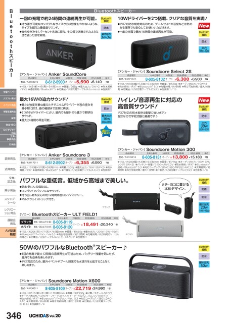 Bluetoothスピーカー一回の充電で約24時間の連続再生が可能。●持ち運び可能なコンパクトなサイズからは想像もつかないような、サイズを超えた重低音サウンド。●音のゆがみを1パーセント未満に抑え、その場で演奏されたような透き通った音を実現。Bluetooth®接続防水最大出力3W+3W10Wドライバーを2つ搭載、クリアな音質を実現!●IPX7の防水規格対応のため、プールサイドや浴室など水気のある場所でも安心してお使いいただけます。●一度の充電で最大16時間の連続再生が可能。Bluetooth®接続防水出力10W+10W[アンカー・ジャパン]AnkerSoundCore商品種別型式/A3102016お申込番号M価税抜8-612-8903オープン税抜価格¥5,590税込価格¥6,149単位1台●寸法/165幅)×45奥)×54高)mm●質量/365g●最大出力/3W×2●防水規格/IPX5●通信規格/Bluetooth®5●付属品/USB充電ケーブル(Atomicro)●包装数:1[アンカー・ジャパン]SoundcoreSelect2S商品種別型式/A3171N11お申込番号M価税抜8-605-8132オープン税抜価格¥6,300税込価格¥6,930単位1台●寸法/約184幅)×53奥)×63高)mm●質量/約560g●オーディオ出力/10W×2●防水規格/IPX7●Bluetooth®5.3●充電時間/約4時間●再生可能時間/最大16時間●付属品/USB充電ケーブル(CtoC)●包装数:1/15最大16Wの迫力サウンド!●軽さと強度を兼ね備えたチタニウムドライバーが音の歪みを最小限に抑え、曲の細部まで忠実に再現。●2つの8Wドライバーにより、屋内でも屋外でも豊かで鮮明なサウンド。●最大24時間の再生可能。ハイレゾ音源再生に対応の高音質サウンド!IPX7対応の防水設計&衝撃に強いボディ設計なので学校活動に最適です♪Bluetooth®接続防水最大出力16W(8W+8W)Bluetooth®接続防水出力30W(15W+15W)Bluetoothスピーカー学習ペーパークラフト・素材イベント用品学習支援用品保育安全・安心OA・サプライ用品文具・事務用品日用品装飾用品装飾用[アンカー・ジャパン]AnkerSoundcore3商品種別型式/A3117011お申込番号M価税抜8-612-8902オープン税抜価格¥6,355税込価格¥6,990単位1台式典用品式典用品●寸法/174幅)×57奥)×59高)mm●質量/500g●最大出力/16W(8W×2)●防水規格/IPX7●通信規格/Bluetooth®5●付属品/USB充電ケーブル(AtoC)●包装数:1[アンカー・ジャパン]SoundcoreMotion300商品種別型式/A3135012お申込番号M価税抜税抜価格8-605-8131オープン¥13,800¥15,180税込価格単位1台●寸法/約200幅)×53奥)×93高)mm●質量/約776g●オーディオ出力/30W(フルレンジ15W×2)●バッテリー容量/3100mAh/7.2V●防水規格/IPX7●Bluetooth®規格/Bluetooth®5.3●対応コーデック/LDAC・SBC・MPEG2AACLC●充電時間/約4時間●再生可能時間/最大13時間●付属品/USB充電ケーブル(CtoC)●包装数:1/8文集・文集・記念品記念品掲示用品掲示用品スタンプ・シールシールレクリエーレクリエーション用品運動会運動会用品用品AV関連AV関連機器機器パワフルな重低音。低域から高域まで美しい。●防水・防じん・防錆対応。●コンパクトでパワフルなサウンド。●持ち出し時も安心の約12時間再生ロングバッテリー。●マルチウェイストラップ付き。ブラックタテ・ヨコに置ける本体デザイン。[ソニー]BluetoothスピーカーULTFIELD1商品種別お申込番号M価税抜税抜価格税込価格単位型式/SRS-ULT10BC8-605-8119オープン¥18,491¥20,340ブラックホワイト●寸法/約206(長)×77(高)×76(幅)mm●質量/約650g●最大出力/20W(10W+10W)●Bluetooth®バージョン/Ver5.3●再生可能時間/約12時間●充電時間/約5時間(5V1.5Aの場合)●付属品/USBケーブル(AtoC)、ストラップ●包装数:18-605-8120型式/SRS-ULT10WC1台ホワイト50WのパワフルなBluetooth®スピーカー♪●1回の充電で最大12時間の音楽再生が可能なため、バッテリー残量を気にせず、●IPX7対応のため、屋外イベントやプール授業でも水濡れを心配することなく屋外でも音楽を楽しめます。楽しめます。[アンカー・ジャパン]SoundcoreMotionX600商品種別型式/A3130011お申込番号M価税抜税抜価格8-605-8109オープン¥22,719¥24,990税込価格単位1台●寸法/約310(幅)×81(奥)×170高)mm●質量/約1930g●材質/スチール(SPCC)●オーディオ出力/50W(ウーファー15W×2、ツイーター5W×2、フルレンジ10W×1)●防水規格/IPX7●Bluetooth®バージョン/Ver.5.3●対応コーデック/SBC・LDAC・AAC●充電時間/約6時間●再生可能時間/最大12時間●付属品/USB充電ケーブル(CtoC)●包装数:1/4346Vol.20Bluetooth®接続防塵防水最大出力20W(10W+10W)Bluetooth®接続防水最大出力50W