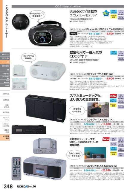 Bluetooth®で簡単接続!CDラジカセ・プレーヤーBluetooth®搭載のエコノミーモデル!●Bluetooth®搭載CDラジオ!●1.5W+1.5W出力!出力1.5W+1.5WBluetooth®接続CDCD-RCD-RWラジオAM/FM[東芝ライフスタイル]Bluetooth®CDラジオTY-CW10(K)商品種別お申込番号M価税抜税抜価格税込価格単位型式/TY-CW10(K)8-612-8881オープン¥8,800¥9,6801台ブラック●寸法/240(幅)×223(奥)×128(高)mm(突起物含まず)●質量/約1.3kg乾電池含まず)●最大出力/1.5W+1.5W●電源/AC100V50-60Hz、DC9V単二乾電池×6個(別売)●入力・出力端子/外部入力/ヘッドホン出力:φ3.5mmステレオミニジャック●メディア/CD、CD-R/RW(CD-DAフォーマットで記録されたディスク)●Bluetoothバージョン/Ver5.0●付属品/電源コード●包装数:1/4コンパクト&高音質!教室利用で一番人気のCDラジオ♪●コンパクト&高音質で教室用に最適!●1.5W+1.5W出力!出力1.5W+1.5WCDCD-RCD-RWラジオAM/FM[東芝ライフスタイル]CDラジオTY-C161(W)商品種別お申込番号M価税抜税抜価格税込価格型式/TY-C161(W)8-612-8885オープン¥8,600¥9,460ホワイト●寸法/230(幅)×213(奥)×92(高)mm(突起物含まず)●質量/約1.1kg(乾電池含まず)●最大出力/1.5W+1.5W●電源/AC100V50/60Hz、DC9V、単三乾電池×6個(別売)●入力・出力端子/外部入力/ヘッドホン出力:φ3.5mmステレオミニジャック●メディア/CD、CD-R/RW(CD-DAフォーマットで記録されたディスク)●付属品/電源コード●包装数:1/6単位1台スマホミュージックも、より迫力の高音質で。音質切替モード搭載。CDCD-RCD-RWラジオAM/FMネオジウムスピーカー出力2.2W+2.2WBluetooth®接続[東芝ライフスタイル]CDラジオAX-CR80(K)商品種別型式/AX-CR80(K)お申込番号M価税抜8-605-8141オープン税抜価格¥13,800税込価格¥15,180単位1台●寸法/272(幅)×72(奥)×147(高)mm(突起部含まず)●質量/約1.2kg(乾電池含まず)●最大出力/2.2W+2.2W(Bluetooth®再生時)●電源/AC100V50/60Hz、DC9V、単三乾電池×6個(別売)●入力・出力端子/外部入力/ヘッドホン出力:φ3.5mmステレオミニジャック●メディア/CD、CD-R/RW(CD-DAフォーマットで記録されたディスク)●Bluetooth®バージョン/Ver5.3●付属品/電源コード●包装数:1大切なカセットテープをSDカードやUSBメモリーに簡単録音。「声くっきり」モード新搭載!マイク端子カセットテープ出力3W+3WBluetooth®接続CDCD-RCD-RWラジオAM/FM再生速度調整MP3再生CDラジカセ・プレーヤー学習ペーパークラフト・素材イベント用品学習支援用品保育安全・安心OA・サプライ用品文具・事務用品日用品装飾用品装飾用式典用品式典用品文集・文集・記念品記念品掲示用品掲示用品スタンプ・シールシールレクリエーレクリエーション用品運動会運動会用品用品AV関連AV関連機器機器[東芝ライフスタイル]商品種別型式/AX-KCR70(S)CDラジカセAX-KCR70(S)お申込番号M価税抜8-605-8142オープン税抜価格¥20,990税込価格¥23,089単位1台348Vol.20●寸法/316(幅)×215(奥)×128(高)mm(突起部含まず)●質量/約2.2kg乾電池含まず)●最大出力/3.0W+3.0W●電源/AC100、DC9V、単二乾電池×6個(別売)●入力・出力端子/外部入力/ヘッドホン出力:φ3.5mmステレオミニジャック、マイク入力:φ3.5mmミニジャック●メディア/CD、CD-R/RW(CD-DAフォーマット/MP3オーディオファイルで記録されたディスク)●Bluetooth®バージョン/Ver5.3●付属品/電源コード、リモコン●包装数:1/4