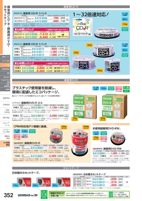 録音用CD-R[RiDATA]録音用CD-R1パック商品種別お申込番号5mmスリムケーススピンドルケース●録音時間/79分57秒●1回録音用●ホワイトレーベル●インクジェットプリンタ対応●容量/700MB●1〜32倍速対応●包装数:1/20スリムケース入)、1/25スピンドルケース入)8-612-8568オープン¥780¥680CD-RMU80.10SPA8-612-8569M価税抜税抜価格税込価格¥858¥748型式/CD-RMU80.10PC型式/(10枚入)1パック単位商品種別まとめ買いパック5mmスリムケーススピンドルケース8-612-85868-612-8587お申込番号※1組単位申込。税抜価格¥7,410¥6,460税込価格¥8,151¥7,106単位1組(10枚×10パック入)[RiDATA]録音用CD-R1パック商品種別お申込番号M価税抜税抜価格税込価格型式/CD-RMU80.20SPB型式/CD-RMU80.30SPB型式/8-612-85708-612-8571CD-RMU80.50SPA8-612-857220枚入30枚入50枚入(50枚入)●録音時間/79分57秒●1回録音用●ホワイトレーベル●インクジェットプリンタ対応●容量/700MB●スピンドルケース入●1〜32倍速対応●包装数:1/2020枚入・30枚入)、1/1050枚入)¥980¥1,078¥1,380¥1,518¥1,980¥2,178(20枚入)(30枚入)オープン1パック1パック単位1パック1〜32倍速対応!30枚20枚1〜32倍速80分10枚インクジェットプリンタ1〜32倍速80分インクジェットプリンタ商品種別まとめ買いパック8-612-8588100枚入8-612-8589250枚入お申込番号税抜価格¥3,800¥9,400※1組単位申込。税込価格¥4,180¥10,3401組(50枚×2パック入)1組(50枚×5パック入)単位録画用DVDDVD-Rプラスチック使用量を削減し、環境に配慮したエコパッケージ。紙スリーブでディスクを保管することで、省スペースな収納を実現!50枚1〜16倍速120分インクジェットプリンタCPRM対応デジタル放送[マクセル]録画用DVD-Rエコ商品種別お申込番号M価税抜税抜価格税込価格単位型式/DRD120SWPS.10E10枚入(10枚入)●寸法/135(幅)×27(奥)×132(高)mm●質量/254g●倍速対応/1〜16倍速●録画再生時間/120分●紙スリーブ仕様●包装数:1/208-612-8914オープン¥1,150¥1,2651パック型式/DRD120SWPS.50E50枚入(50枚入)●寸法/135(幅)×102(奥)×132(高)mm●質量/1043g●倍速対応/1〜16倍速●録画再生時間/120分●紙スリーブ仕様●包装数:1/48-612-8915オープン¥3,490¥3,8391パック10枚パック50枚パックCPRM対応地デジ録画に最適。1〜16インクジェット120分プリンタ倍速CPRM対応デジタル放送ワイド印刷エリア[磁気研究所]録画用DVD-R50枚パック100枚パックDVD-RWお徳用録画用DVD-RW。1〜2倍速10枚パックインクジェットプリンタCPRM対応デジタル放送商品種別お申込番号M価税抜税抜価格税込価格単位型式/HDDR12JCP5050枚入(50枚入)●寸法/140(径)×95高)mm●質量/1kg●容量/4.7GB●倍速対応/1〜16倍速●録画可能時間/120分●スピンドルケース入●ワイド印刷対応●包装数:1/68-612-8683オープン¥1,780¥1,9581パック型式/HDDR12JCP100100枚入(100枚入)●寸法/140(径)×165高)mm●質量/2kg●容量/4.7GB●倍速対応/1〜16倍速●録画可能時間/120分●スピンドルケース入●ワイド印刷対応●包装数:1/58-612-8684オープン¥3,480¥3,8281パックカセットテープ[磁気研究所]録画用DVD-RWお申込番号M価税抜税抜価格税込価格単位8-612-8685オープン¥1,080¥1,1881パック(10枚入)商品種別10枚入型式/HDDRW12NCP10●寸法/139(径)×28(高)mm●質量/231g●容量/4.7GB●倍速対応/1〜2倍速●スピンドルケース入●インクジェットプリンタ対応●包装数:1/20録音用CDR・録画用DVD・カセットテープ学習ペーパークラフト・素材イベント用品学習支援用品保育安全・安心OA・サプライ用品文具・事務用品日用品装飾用品装飾用式典用品式典用品文集・文集・記念品記念品掲示用品掲示用品スタンプ・シールシールレクリエーレクリエーション用品運動会運動会用品用品AV関連機器日本製のカセットテープ。10分60分90分[磁気研究所]日本製カセットテープ商品種別お申込番号M価税抜録音可能時間/10分(片面5分)型式/HD-10CT1J-G録音可能時間/60分(片面30分)型式/HD-60CT1J-G録音可能時間/90分(片面45分)型式/HD-90CT1J-G8-612-89118-612-89128-612-8913オープン税抜価格¥220¥310¥350税込価格¥242¥341¥385単位1個●寸法/110(幅)×12(奥)×70(高)mm●種類/ノーマルタイプ●包装数:1352Vol.20地球にやさしくお買い物このマークのついた商品は地球環境保護に配慮された商品です。グリーンの文字で商品の判別をしやすくしました。どうぞご利用ください。エコマーク認定品グリーン購入法適合品GPNエコ商品ねっと掲載