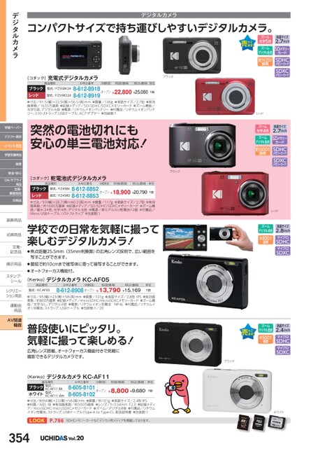 コンパクトサイズで持ち運びしやすいデジタルカメラ。デジタルカメラ[コダック]充電式デジタルカメラ商品種別お申込番号M価税抜税抜価格税込価格単位型式/FZ55BK2A型式/FZ55RD2A8-612-8918オープン¥22,800¥25,080ブラックレッド●寸法/91.5(幅)×22.9奥)×56.5(高)mm●質量/106g●液晶サイズ/2.7型●有効画素数/1635万画素●記録メディア/SD/SDHC/SDXCメモリーカード●ズーム機能/光学:5倍、デジタル:6倍●電源/リチウムイオンバッテリー●付属品/リチウムイオンバッテリー、リストストラップ、USBケーブル、ACアダプター●包装数:18-612-89191台突然の電池切れにも安心の単三電池対応![コダック]乾電池式デジタルカメラ商品種別お申込番号M価税抜税抜価格税込価格単位型式/FZ45BK型式/FZ45RD8-612-8852オープン¥18,900¥20,790ブラックレッド●寸法/93(幅)×28.7奥)×60.2(高)mm●質量/117g●液晶サイズ/2.7型●有効画素数/約1600万画素●記録メディア/SD/SDHC/SDXCメモリーカード●ズーム機能/最大:24倍、光学:4倍、デジタル:6倍●電源/単三アルカリ乾電池×2個●付属品/MicroUSBケーブル、リストストラップ●包装数:18-612-88531台ブラックブラックズーム光学5倍ズームデジタル6倍約1635万画素液晶サイズ2.7inchSDメモリーカードSDHCメモリーカードSDXCメモリーカードレッドズーム光学4倍ズームデジタル6倍約1600万画素液晶サイズ2.7inchSDメモリーカードSDHCメモリーカードSDXCメモリーカードレッドデジタルカメラ学習ペーパークラフト・素材イベント用品学習支援用品保育安全・安心OA・サプライ用品文具・事務用品日用品装飾用品装飾用式典用品式典用品文集・文集・記念品記念品掲示用品掲示用品スタンプ・シールシールレクリエーレクリエーション用品運動会運動会用品用品AV関連機器学校での日常を気軽に撮って楽しむデジタルカメラ!●焦点距離25.5mm(35mm判換算)の広角レンズ採用で、広い範囲を写すことができます。ズームデジタル4倍約800万画素●最短で約10cmまで被写体に寄って接写することができます。●オートフォーカス機能付。[Kenko]デジタルカメラKC-AF05商品種別型式/KC-AF05お申込番号M価税抜税抜価格8-612-8908オープン¥13,790¥15,169税込価格単位1台●寸法/95(幅)×23(奥)×58(高)mm●質量/101g●液晶サイズ/2.8型IPS●有効画素数/約800万画素●記録メディア/microSDHC/microSDXCメモリーカード●ズーム機能/光学:なし、デジタル:4倍●電源/リチウムイオン充電池NP-6L●付属品/リチウムイオン充電池、ストラップ、USBケーブル●包装数:1/20普段使いにピッタリ。気軽に撮って楽しめる!広角レンズ搭載、オートフォーカス機能付きで気軽に撮影できるデジタルカメラです。ブラックズームデジタル8倍約500万画素液晶サイズ2.8inchマイクロSDHCマイクロSDXC液晶サイズ2.4inchマイクロSDHCマイクロSDXCホワイト[Kenko]デジタルカメラKC-AF11M価税抜税抜価格お申込番号商品種別型式/KC-AF11型式/KC-AF11WHBK8-605-8101オープン8-605-8102ブラックホワイト●寸法/約94(幅)×23(奥)×58(高)mm●質量/約101g●液晶サイズ/2.4型IPS●材質/ABS他●有効画素数/約500万画素●レンズ/f=3.54mmF2.0●記録メディア/microSDHC/microSDXCメモリーカード●ズーム/デジタル8倍●付属品/リチウムイオン充電池、ストラップ、USBケーブル(Type-AtoType-C)、取扱説明書●包装数:1¥8,800¥9,6801台税込価格単位P.786SDHCメモリーカードなどデジカメ用メディアを掲載しております。354Vol.20