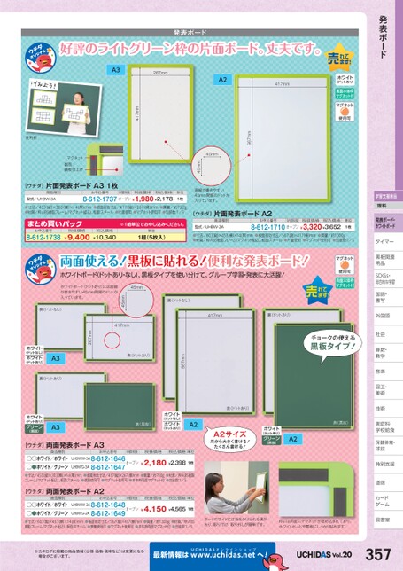発表ボード学習支援用品理科発表ボード・ホワイトボードタイマータイマー黒板関連黒板関連用品用品SDGs・DGs・総合的な学習習国語・語・書写写外国語国社会社会算数・数・数学学音楽楽図工・工・美術術技術術家庭科・家庭科・学校給食校食保健体育・体球技技特別支援別道徳徳カードゲームム図書室書A2417mmホワイト(ドットあり)裏面本体枠マグネット付A3267mm417mm好評のライトグリーン枠の片面ボード。丈夫です。。発表ボード567mm45mm45mm単位1枚直線が書きやすい45mm間隔のドットが入っています。使用例マグネット裏面:鋼板仕上げ[ウチダ]片面発表ボードA31枚商品種別型式/UHBW-3Aお申込番号M価税抜税抜価格税込価格8-612-1737オープン¥1,980¥2,178●寸法/453(縦)×303(横)×14(厚)mm●板面有効寸法/417縦)×267横)mm●質量/約722g●材質/枠:ABS樹脂フレーム(マグネット組込)、板面:スチール●片面使用●マグネット使用可●包装数:1/5まとめ買いパック8-612-1738お申込番号¥9,400税抜価格※1組単位申込。税込価格¥10,340単位1組(5枚入)[ウチダ]片面発表ボードA2商品種別型式/UHBW-2Aお申込番号M価税抜税抜価格税込価格8-612-1710オープン¥3,320¥3,652単位1枚●寸法/603縦)×453横)×14厚)mm●板面有効寸法/567縦)×417横)mm●質量/約1000g●材質/枠:ABS樹脂フレーム(マグネット組込)、板面:スチール●片面使用●マグネット使用可●包装数:1/5両面本体枠マグネット付両面使える便利な発表ボード!!黒板に貼れる!ホワイトボード(ドットあり・なし)、黒板タイプを使い分けて、グループ学習・発表に大活躍!417mm裏(ドットあり)裏(ドットなし)45mm45mmホワイトボード(ドットあり)には直線が書きやすい45mm間隔のドットが入っています。裏(ドットなし)チョークの使える黒板タイプ!表(黒板)A2表(ドットあり)A2サイズだから大きく書ける!たくさん書ける!ホワイト(ドットあり)グリーン(黒板)ボードのサイドには指をかけられる溝があり、取り付け、取り外しが簡単です。枠には両面にマグネットが埋め込まれており、ホワイトボードや黒板にしっかり貼れます。567mm表(ドットあり)A3417mm267mmホワイト(ドットなし)ホワイト(ドットあり)裏(ドットあり)ホワイト(ドットあり)グリーン(黒板)A3表(黒板)ホワイト(ドットなし)ホワイト(ドットあり)A2[ウチダ]両面発表ボードA3商品種別お申込番号M価税抜税抜価格税込価格単位UHBWW-3A8-612-1646オープン¥2,180¥2,3981枚●●ホワイト/ホワイト●●ホワイト/グリーン●寸法/453(縦)×303横)×14(厚)mm●板面有効寸法/417縦)×267(横)mm●質量/約700g●材質/枠:ABS樹脂フレーム(マグネット組込)、板面:スチール●表裏使用可●マグネット使用可●本体枠両面マグネット付●包装数:1/5UHBWG-3A8-612-1647[ウチダ]両面発表ボードA2商品種別お申込番号M価税抜税抜価格税込価格単位UHBWW-2A8-612-1648オープン¥4,150¥4,5651枚●●ホワイト/ホワイト●●ホワイト/グリーン●寸法/603(縦)×453横)×14厚)mm●板面有効寸法/567(縦)×417横)mm●質量/約1300g●材質/枠:ABS樹脂フレーム(マグネット組込)、板面:スチール●表裏使用可●マグネット使用可●本体枠両面マグネット付●包装数:1/5UHBWG-2A8-612-1649※カタログに掲載の商品情報(仕様・価格・税率など)は変更になる場合がございます。最新情報はUCHIDASww.uchidas.netwへ!Vol.20357