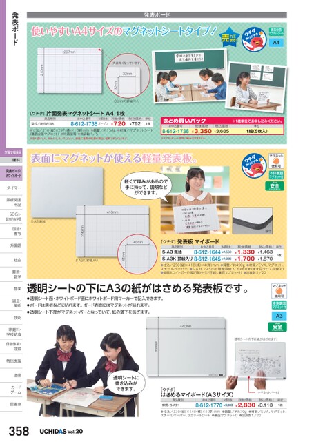 裏面全面マグネットシートA4使いやすいA4サイズのマグネットシートタイプ!4発表ボード発表ボード角は丸くなっています。32mm32mm32mmの罫線入り。297mm210mm[ウチダ]片面発表マグネットシートA41枚商品種別型式/UHSW-4Aお申込番号M価税抜8-612-1735オープン税抜価格¥720税込価格¥792単位1枚●寸法/210(縦)×297(横)×1(厚)mm●質量/約134g●材質/マグネットシート(裏面全面マグネット)●片面使用●包装数:1/5※折り曲げたり、丸めたりしないでください。表面に亀裂や破損が発生し使用できなくなります。まとめ買いパック8-612-1736お申込番号¥3,350税抜価格※マグネットシート自体に磁石は付きません。※1組単位申込。税込価格¥3,685単位1組(5枚入)学習支援用品理科表面にマグネットが使える軽量発表板。本体裏面マグネット付原寸税抜価格¥1,330¥1,700税込価格¥1,463¥1,870単位1枚[ウチダ]発表板マイボード商品種別お申込番号M価税抜8-612-1644¥1,550S-A3無地S-A3K罫線入り8-612-1645¥1,986●寸法/290(縦)×410(横)×4(厚)mm●質量/約490g●材質/EVA、マグネット、スチールペーパー●S-A3K/45mm暗線罫線入、6×8ます(ます目クロス点線入)●表面ホワイトボード(磁石貼り付け可能)、裏面マグネット付●包装数:1/20軽くて厚みがあるので手に持って、説明などができます。45mm45mmS-A3K罫線入り410mm290mmS-A3無地透明シートに書き込みができます。[ウチダ]はさめるマイボード(A3サイズ)商品種別型式/S-A3Hお申込番号M価税抜8-612-1770¥3,300税抜価格¥2,830マグネットバー付税込価格¥3,113単位1枚透明シートの下に紙がはさめます。440mm330mm透明シートの下にA3の紙がはさめる発表板です。●透明シート面・ホワイトボード面にホワイトボード用マーカーで記入できます。●ボードは黒板などに貼れます。ボード表面にはマグネットが貼れます。●透明シート下部がマグネットバーとなっていて、紙の落下を防ぎます。本体裏面マグネット付A3358Vol.20●寸法/330(縦)×440(横)×4(厚)mm●質量/約570g●材質/EVA、マグネット、スチールペーパー、ラミネートシート●裏面マグネット付●包装数1/20発表ボード・ホワイトボードタイマータイマー黒板関連黒板関連用品用品SDGs・SDG総合的な学習国語・国語書写書写外国語外国語社会社会算数・算数数学数学音楽音楽図工・図工美術美術技術技術家庭科・家庭科・学校給食学校給食保健体育・球技球技特別支援特別支道徳道徳カードカゲーム図書室図書室