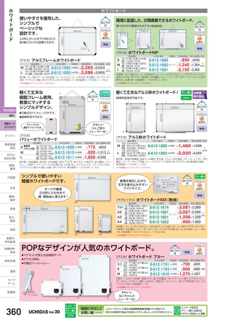 L無地440mmM[デビカ]ホワイトボードNP商品種別お申込番号M価税抜税抜価格税込価格単位8-612-16898-612-16908-612-1691寸法/221(幅)×332縦)×10mm(厚)、質量/210g、型式/063306寸法/330(幅)×440縦)×10厚)mm、質量/380g、型式/063307寸法/600(幅)×440縦)×13厚)mm、質量/800g、型式/063308SML●材質/ボード面:スチール、芯材:段ボール、フレーム:ポリプロピレン、吊下げヒモ:ナイロン●吊り下げ可●マグネット使用可●付属品/トレー、イレーザー付ボードマーカー(S・Mは黒のみ、Lは黒・赤)●包装数:1/10(S・M)、1/5L)※本体裏面にはマグネットがついておりません。¥850¥1,240¥2,150¥935¥1,364¥2,365オープンセット1440mmS221mm332mm無地ML無地300mm600mm450mm450mm無地かわいいりんご型のイレーザー付!本体裏面マグネット付(Sサイズのみ)軽くて丈夫なアルミ枠ホワイトボード!縦横両面使用可能です。ホワイトボード環境に配慮した、分類廃棄できるホワイトボード。取り付け方で壁掛けもタテヨコ自由自在。600mm330mm600mm[デビカ]アルミフレームホワイトボード商品種別お申込番号M価税抜税抜価格税込価格単位寸法/300縦)×450(横)×16厚)mm、質量/860g、型式/063318寸法/450縦)×600(横)×16厚)8-612-1692¥3,000¥2,295¥2,524mm、質量/1400g、型式/0633198-612-1693¥4,700¥3,596¥3,955ML●材質/ボード面:スチール、芯材:紙板、フレーム:アルミ、フレーム枠:ABS●付属品/ボードマーカー(黒)、マグネット(2個)、吊り下げひも、吊り下げ金具、ネジ●包装数:1/20(M)、1/10(L)セット1※本体裏面にはマグネットがついておりません。200mm300mmS軽くて丈夫な樹脂フレーム使用、教室にマッチするシンプルデザイン。●可動式のペントレー付きです。●縦横両用できます。Sサイズのみ裏面マグネット付き。[アスカ]バリューホワイトボード使いやすさを優先した、シンプルでベーシックな設計です。L450mm2カ所に付いた吊下げ用ひもで、縦・横どちらでも設置できます。ホワイトボード[アスカ]アルミ枠ホワイトボード[アスカ]アルミ枠ホワイトボードお申込番号商品種別ML寸法/300×450mm、枠厚/36mm(ボード厚13mm)、質量/550g、型式/AWB056寸法/600×450mm、枠厚/36mm(ボード厚13mm)、質量/1050g、型式/AWB057M価税抜税抜価格税込価格単位8-612-1892¥1,9508-612-1893¥2,700¥1,460¥1,606¥2,020¥2,2221セット●材質/表面処理鋼板、亜鉛メッキ鋼板、再生紙、アルミ、ABS樹脂、スチール、ナイロン●付属品/コーナーキャップ8個、トレー、スライドフック金具、吊り下げひも●お客様取付商品●包装数:1/10(M)、1/5(L)※本体裏面にはマグネットがついておりません。書類を掲示しながら文字を書き込みやすいワイドサイズ。無地[マグエックス]ホワイトボードMX(無地)商品種別お申込番号M価税抜税抜価格税込価格単位8-612-16748-612-10818-612-16018-612-1602寸法/780(幅)×440(高)×12(厚)mm、質量/910g、型式/MXWH-WD寸法/600(幅)×440(高)×12(厚)mm、質量/700g、型式/MXWH-A2寸法/300(幅)×440(高)×6厚)mm、質量/300g、型式/MXWH-A3寸法/200(幅)×300(高)×6厚)mm、質量/140g、型式/MXWH-A4ワイドA2A3A4●材質/フレーム:ポリプロピレン、中芯:段ボール、白板:スチール●吊り下げ可●マグネット使用可●付属品/イレーザー付マーカー(ワイド・A2は黒・赤、A3・A4は黒)、トレー、吊りひも●包装数:1/5(ワイド・A2)、1/10(A3・A4)※本体裏面にはマグネットがついておりません。¥3,081¥3,389¥2,087¥2,295¥1,208¥1,328¥990¥1,089オープンセット1商品種別お申込番号M価税抜税抜価格税込価格単位マグネット2個寸法/300×400×10mm、寸法/200×300×10mm、¥775質量/198g、型式/VWB0608-612-1609¥1,000¥852¥920¥1,012質量/287g、型式/VWB0618-612-1610¥1,250質量/692g、型式/VWB0628-612-1611¥2,200¥1,820¥2,002S裏面用ML●材質/塗装鋼板、再生紙、ABS樹脂●吊り下げ可●マグネット使用可●付属品/ペントレー、太軸ボードマーカー(S・Mは黒のみ、Lは黒・赤)、マグネットイレーザー(りんご型)、マグネット(S:2個、M:3個、L:6個)、吊り下げひも●包装数:1/10(S・M)、1/5(L)寸法/600×450×10mm、セット1200mm300mmA4440mmA3440mmワイド600mm440mmA2シンプルで使いやすい軽量ホワイトボードです。ボードの裏面2カ所にひも付きで、縦・横自由に使えます!780mm300mmPOPなデザインが人気のホワイトボード。●マグネットが使える金属製ボード。●タテヨコ両用。●可動式マーカートレー。無地[アスカ]ホワイトボードブルー商品種別お申込番号M価税抜税抜価格税込価格単位型式/WB079B寸法/347(縦)×237(横)mm、型式/WB080B寸法/467(縦)×347(横)mm、型式/WB081B8-612-1791¥1,000¥8258-612-1793¥1,200¥9908-612-1810¥1,700¥1,270¥1,397ミニ寸法/177(縦)×237(横)mm、SM●厚さ/12mm●材質/鉄板、PVC、紙●付属品/ボードマーカー(黒)、マグネットイレーザー(ねこ)、マグネット3個(S、Mのみ)、可動式マーカートレー、吊り下げ用金具・ひも、スタンド(ミニのみ)●包装数:1/10※本体裏面にはマグネットがついておりません。¥750¥9001枚使用例(ミニのみ)ミニSMかわいいねこちゃんのイレーザー付!360Vol.20地球にやさしくお買い物このマークのついた商品は地球環境保護に配慮された商品です。グリーンの文字で商品の判別をしやすくしました。どうぞご利用ください。エコマーク認定品