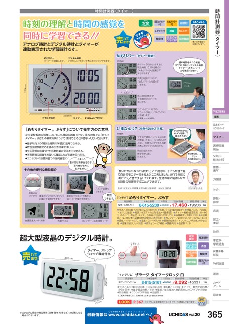 時間計測器(タイマー)学習支援用品理科発表ボード・発表ボード・ホワイトボードトタイマー黒板関連黒板関連用品用品SDGs・DGs・総合的な学習習国語・語・書写写外国語国社会社会算数・数・数学学音楽楽図工・工・美術術技術術家庭科・家庭科・学校給食校食保健体育・体球技技特別支援別道徳徳カードゲームム図書室書時間計測器(タイマー)時刻の理解と時間の感覚を同時に学習できる!!アナログ時計とデジタル時計とタイマーが連動表示された学習時計です。背面マグネット付めもりバー付温湿度計Movieスタンド付減算カレンダー壁掛け音量切替ON/OFF時計機能使い方の動画を公開しています。めもりバー(タイマー機能)使用例:ピピッタイマー20分セットすると現在時刻10:10を起点に「めもりバー」も連動して表示されます。時刻が進むにつれて、「めもりバー」が減っていきます。残り3分の時点で予告音が「ピピッ」と鳴ります。カウントダウン終了時、アラームが鳴り、ベルアイコンが点滅します。※音量大・小の場合。いまなんじ?(時刻の読み方学習)使用例:アナログ時計とデジタル時計が連動しており、「いまなんじ?ボタン」を押すとデジタル時計の表示がオンオフされます。時刻の読み方の練習を繰り返し行えます。残り時間を4つの側面(アナログ時計・デジタル時計・タイマー・めもりバー)から確認できます。いま何時かな?ボタンを押して答え合わせ!10時6分、、、アッ!10時30分!!「長い針が6になったら終わり」この指示を、子どもが目で見て自分でモニターできるように工夫しました。終了3分前には「ピピッ」と音で予告してくれます。生活の中で納得しながら時間の管理を学ぶことができます。監修:元筑波大学附属大塚特別支援学校地域支援部長部博志先生安[ウチダ]めもりタイマー®ぷらす商品種別型式/UMT-P01お申込番号8-615-5200¥18,000¥17,460¥19,206M価税抜税抜価格税込価格単位1台めもりバータイマーと連動します。デジタル時計いまなんじ?ボタンで表示をオンオフできます。アナログ時計368mmタイマーいまなんじ?ボタン「めもりタイマーぷらす」について先生方のご意見小中学校教師の皆様にUCHIDAS独自の調査を行い、学校現場での「めもりタイマーぷらす」の教育効果について、期待できると評価をいただいております。229mm●低学年向けの「時刻と時間の学習」に活用できそう。●特別支援学級での生徒の生活指導でほしい!●生活習慣の意識づけや活動時間の見える化に使える。●学習時間の割合をお互いに確認しながら進められそう。●ミニテストや計算練習での時間管理に!3通りのその他の便利な機能紹介取り付け方があるので、取り付け場所に悩みません!壁掛け用フック穴裏面のフック穴で、壁フックに掛けて使用できます!裏面のマグネットで黒板に貼り付けて使用できます!スタンド設置もできます。常設できます。[キングジム]ザラージタイマークロック白商品種別型式/DTC-001Wお申込番号M価税抜8-615-5167¥10,800税抜価格税込価格¥9,292¥10,221単位1台●寸法/426(幅)×70(奥)×202(高)mm●質量/1330g●タイマー最大計測時間/199分50秒●最小設定時間/1秒●電源/単三電池×3個(別売)、ACアダプタ(別売)●時計機能●サウンドOFF機能●包装数:1※ご利用の環境により、実物の色とは異なる場合があります。202mm音量設定大・小・消音大型パネルカレンダー/温度湿度モード●寸法/368(幅)×29(厚)×229(高)mm●質量/910g電池含まず)●材質/ABS、TN液晶、ネオジウム磁石●電源/単三アルカリ乾電池×4個(別売)●タイマー機能(設定範囲:1分〜60分、めもりバー表示付、タイマー予告音(3分前にお知らせ))●時間精度/月差±30秒●時計機能/12/24hr表示切替(時刻設定時に選択可能)●カレンダー/2019/01/01〜2099/12/31●温度/-10〜+60℃●湿度/20〜99%RH●環境目安表示/インフルエンザ注意、熱中症注意●音量切替(大/小/消音)●時刻オン/オフ機能●置掛両用●包装数:1/8超大型液晶のデジタル時計。マグネットタイマー、ストップウォッチ機能付き。426mm減算積算最大計測時間199分50秒最小設定時間1秒時計機能電波時計消音壁掛け背面マグネット付※カタログに掲載の商品情報(仕様・価格・税率など)は変更になる場合がございます。最新情報はUCHIDASww.uchidas.netwへ!Vol.20mm07LOOKP.367シンプルな単機能タイプのタイマーを掲載しております。