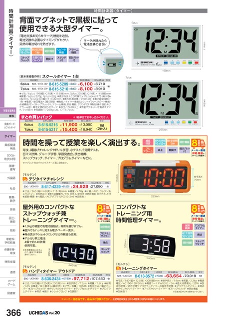 114mm145mm時計機能背面マグネット付沖縄・離島はサービス対象外数字高さ70mm沖縄・離島はサービス対象外プログラムタイマー減算積算最大計測時間99分59秒時計機能得点ストップウォッチ時間計測器(タイマー)背面マグネットで黒板に貼って使用できる大型タイマー。「電池交換お知らせマーク」機能を追加。電池交換の必要なタイミングがわかり、突然の電池切れを防ぎます。最大計測時間99分59秒ストップウォッチ音量切替ON/OFF最小設定時間時計機能スタンドリピート壁掛け1秒機能付アラーム機能背面マグネット付マークが現れたら電池交換の合図![鈴木楽器製作所]スクールタイマー1台商品種別お申込番号M価税抜税抜価格税込価格単位型式/STEX-07P型式/STEX-06P¥6,100¥6,710¥8,100¥8,9108-615-5209¥6,8008-615-5210¥8,8006plus7plus●寸法/6plus:190(幅)×21奥)×114(高)mm、7plus:235(幅)×21奥)×145(高)mm●質量/6plus:270g、7plus:420g●表示方法(LCD可視サイズ)/6plus:175幅)×86(高)mm、7plus:220幅)×115(高)mm●最大計測時間/99分59秒●最小設定時間/1秒●電源/単四電池×2個(別売)●機能/タイマー機能(カウントダウン<リピート機能・点滅機能付>・ストップウォッチ)、アラーム機能、時計機能、サウンドOFF機能(操作音およびアラーム音)、電池交換お知らせマーク●音圧/72dB以上●背面マグネット、可動式スタンド、フック孔付●包装数:1/206plus)、1/15(7plus)1台6plus7plus190mmまとめ買いパック商品種別6plus7plusお申込番号8-615-52168-615-5217※1組単位申込。税抜価格¥11,900¥15,400税込価格¥13,090¥16,940単位1組(2台入)235mm時間を操って授業を楽しく演出する。球技、縄跳びチャレンジやドリル学習、小テスト、5分間テスト、百マス計算、グループ学習、学習発表会、試合時間、ストップウォッチ、タイマー、プログラムタイマーなどに。減算積算最大計測時間99分59秒最小設定時間1秒プリアラーム卓上壁掛け●寸法/263(幅)×46奥)×118(高)mm●質量/470g●材質/ABS、ウレタン系エラストマー●赤色LED●最大消費電力/6W●卓上/壁掛け●時計機能●マグネット付●減算/積算●付属品/ACアダプタUP0010(3m)●包装数:1263mmコンパクトなトレーニング用時間管理タイマー。540mm200mm沖縄・離島はサービス対象外時計機能プログラムタイマー得点ストップウォッチ屋外用のコンパクトなストップウォッチ兼トレーニングタイマー。●1.9kgの軽量で乾電池駆動式。場所を選びません。●屋外でもハッキリ見える電子ペーパー表示。●得点表示やショットクロックなどの機能も充実。●アルカリ単三電池4個で約140時間使用可能。200mm※防水機能はありませんので、屋外での常設は避けてください。118mm単位1台[モルテン]デジタイマチャレンジ商品種別型式/UD0010お申込番号M価税抜税抜価格8-617-4239¥27,500¥24,628¥27,090税込価格※マグネット付きですのでスチール面に貼れます。[モルテン]ハンディタイマーアウトドア540mm商品種別型式/UD0040お申込番号M価税抜税抜価格8-636-2434¥107,800¥97,712¥107,483税込価格単位1台●寸法/540(幅)×125(奥)×200(高)mm●数字高さ/12cm●質量/1.9kg●材質/ABS●電源/単三電池×4個(別売)●ブザー音量/103db●表示方法/電子ペーパー●ストップウォッチ●ダウンカウントタイマー●アップカウントタイマー●プログラムタイマー●得点●時計●ショットクロック●包装数:1[モルテン]トレーニングタイマー商品種別型式/UX0020お申込番号M価税抜税抜価格8-613-8572¥70,000¥63,654¥70,019税込価格単位1台●寸法/540(幅)×125(奥)×200(高)mm●数字高さ/14cm●質量/2.2kg●電源電圧/AC100V50/60Hz●電源コードPW0503/5m●最大消費電力/20W●設定の記憶/試合時間やプログラムタイマーの設定を記憶●プログラムタイマー●得点●ダウンカウントタイマー●アップカウントタイマー●ストップウォッチ●時計機能●包装数:1※交流100V以外は使わないでください。時間計測器(タイマー)学習支援用品理科発表ボード・発表ボード・ホワイトボードタイマー黒板関連黒板関連用品用品SDGs・SDG総合的な学習国語・国語書写書写外国語外国語社会社会算数・算数数学数学音楽音楽図工・図工美術美術技術技術家庭科・家庭科・学校給食学校給食保健体育・球技球技特別支援特別支道徳道徳カードカゲーム図書室図書室※メーカー直送品です。返品はご容赦ください。上記商品は受注日から8営業日以内のお届けになります。366Vol.20
