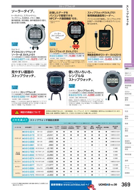 ストップウォッチ学習支援用品理科発表ボード・発表ボード・ホワイトボードトタイマー黒板関連黒板関連用品用品SDGs・DGs・総合的な学習習国語・語・書写写外国語国社会社会算数・数・数学学音楽楽図工・工・美術術技術術家庭科・家庭科・学校給食校食保健体育・体球技技特別支援別道徳徳カードゲームム図書室書!時計の供給について世界的な半導体不足により、一部の掛時計、ストップウォッチ、タイマーが納期遅延、販売中止となる場合がございます。事前に在庫・納期等をご確認のうえ、ご注文いただきますようお願い申し上げます。ストップウォッチ機能比較表※タイマー機能、ライト機能がついていない機種があります。※最小計測単位は1/100(秒)です。(●●●のみ1/1000秒)時計機能最大計測時間●●●●●×●●●×●●●×9時間59分59秒9時間59分59秒9時間59分59秒23時間59分59秒23時間59分59秒10時間10時間10時間10時間9時間59分59秒100時間100時間9時間59分59秒9時間59分59秒メーカー名お申込番号型式価格(税込)トータルタイムスプリットタイム(途中経過時間)ラップタイム(区間経過時間)日常生活防水メモリー機能操作確認音操作確認音切り替え可・不可●●●●●●●●●●●●●●●●●××●●●●●●●●×●●××××●●●●●●●×●●●×××●●●×●●●×●●●●●×●●●●●●●●●●●×××●●●×●●××●●●●●●●●●●●●●●SW-123SW-122SW-121SW-125SW-126HS-3C-8AJHHS-70W-1JHHS-70W-8JHHS-80TW-1JHTEV-4013-BKSVAJ101SVAJ701LC058-A028RDA04-008¥2,521¥2,241¥1,816¥990¥990¥3,190¥5,280¥5,280¥6,954¥1,626¥11,077¥15,488¥6,893¥4,4008-615-52148-615-51738-615-52138-613-08008-613-08018-613-83888-613-76028-613-85938-613-82748-615-51768-613-83778-613-85648-615-52058-613-7075●●●●●●●●●●●●●●ドリテックカシオ計算機クレファーセイコーシチズン※カタログに掲載の商品情報(仕様・価格・税率など)は変更になる場合がございます。最新情報はUCHIDASww.uchidas.netwへ!Vol.20ストップウォッチソーラータイプ。トータルタイム、スプリットタイム、ラップタイム、生活防水、メモリー機能、操作確認音、時計機能、操作確認音切り替え、最大計測100時間。計測したデータをパソコンで管理できるNFCデータ通信機能※付き。※別売のSVAZ015が必要です。ストップウォッチSVAJ701専用無線通信用リーダー。パソコンとUSBで接続し、ストップウォッチの計測データを手軽にCSV形式でパソコンに取り込めます。ソーラーストップウォッチです。1/100秒計測1/100秒計測●[セイコー]デジタルストップウォッチソーラー式SVAJ101お申込番号M価税抜8-613-8377¥11,000税抜価格¥10,070¥11,077税込価格単位1個●商品種別型式/SVAJ101●寸法/60幅)×63(奥)×21(高)mm●質量/61g●材質/ケース:プラスチック、ガラス:アクリルガラス●包装数:1見やすい画面のストップウォッチ。1/100秒計測[シチズン]ストップウォッチお申込番号M価税抜税抜価格税込価格単位8-615-5205¥7,000¥6,267¥6,8931個●商品種別型式/LC058-A02●機能/1/100秒計測、通常計測、積算計測、ラップ/スプリット計測、防滴(JIS防滴Ⅱ型)●寸法/66(幅)×23奥)×81(高)mm●質量/70g●包装数:1/20●●[セイコー]ストップウォッチSVAJ701お申込番号M価税抜税抜価格8-613-8564¥14,300¥14,080¥15,488税込価格単位1個●商品種別型式/SVAJ701●機能/ソーラー充電、データ通信、1/100秒計測、100時間計、メモリーコール●寸法/60.3(幅)×21奥)×72.2(高)mm●質量/61g●包装数:1※データ通信には専用のリーダーSVAZ015が必要です。[セイコー]無線通信用NFCリーダーSVAZ015お申込番号M価税抜税抜価格8-613-8563¥3,500¥3,450¥3,795税込価格単位1個商品種別型式/SVAZ015●寸法/65幅)×12.8(奥)×98(高)mm●質量/55g●包装数:1使い方いろいろ、シンプルなストップウォッチ。1/100秒計測[シチズン]ストップウォッチLお申込番号8-613-7075M価税抜税抜価格税込価格単位¥5,000¥4,000¥4,4001個●商品種別型式/8RDA04-008●機能/単純計時、積算計時、スプリットタイム計時、1位・2位の同時計時、1/100秒計測●寸法/78(幅)×60(奥)×18(高)mm●質量/42g●付属品/テスト用電池(LR44×1個)●包装数:1/20●